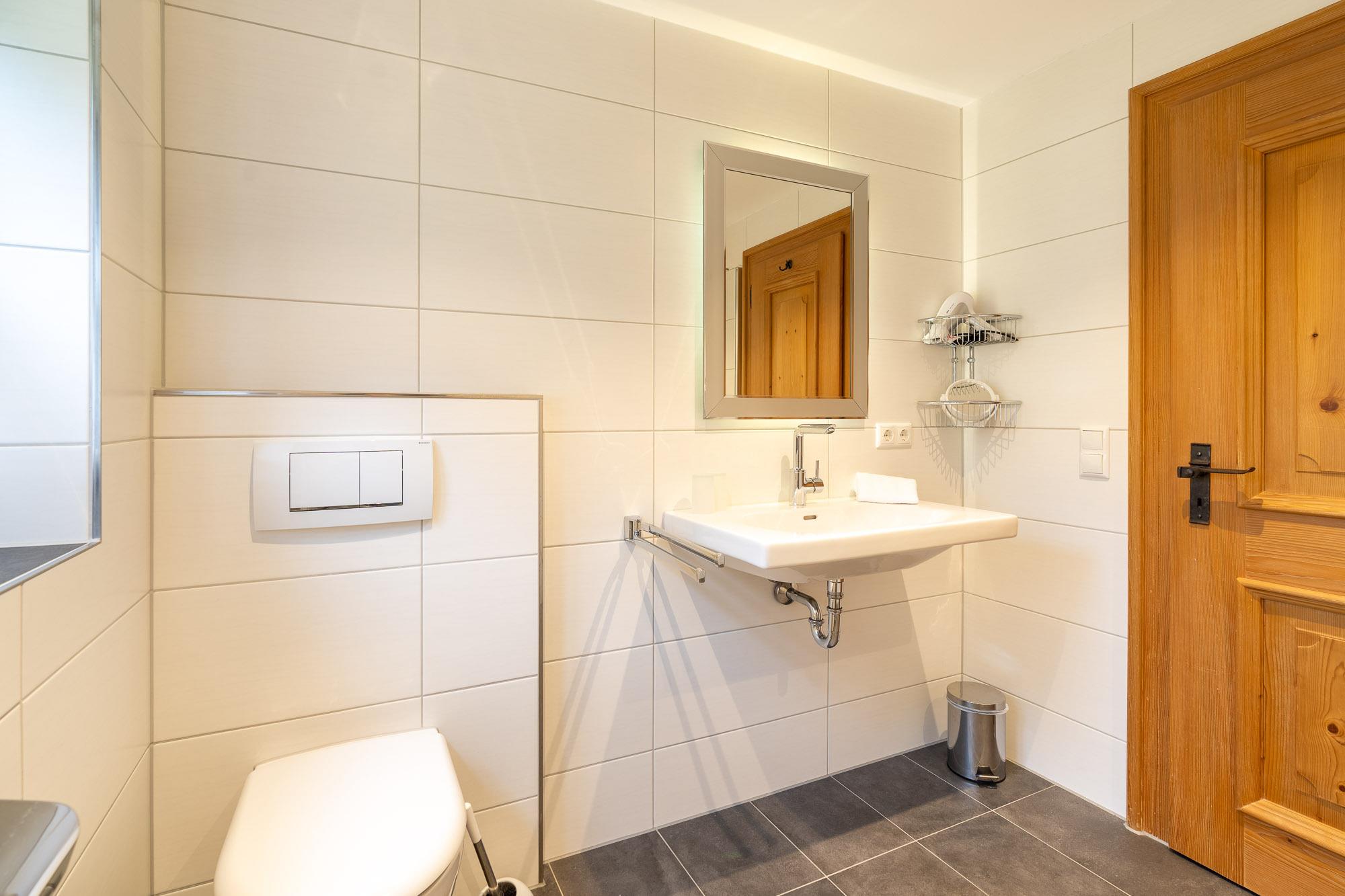 Im Erdgeschoss erwartet Sie eine kleine Küche von welcher Sie in den geräumigen Wohn-Essbereich gelangen. Hier können Sie sich an einem der beiden Essplätze, einer gemütlich am warmen Kachelofen der andere in einem Erker mit Ausblick bei einem ausgiebigen Frühstück oder einem Gläschen Wein entspannen oder Sie machen es sich auf der großen Sofalandschaft im geräumigen Wohnzimmer bequem. Von hier aus gelangen Sie auf die große Terrasse die im Sommer und im Winter ein herrlicher Ort ist um die warmen Sonnenstrahlen und die schneebedeckte, glitzernde Bergwelt zu genießen. In dieser Etage befinden sich zwei Schlafzimmer jeweils mit Doppelbett ausgestattet, ein separates WC und ein Badezimmer mit Dusche, Badewanne, Bidet und WC.