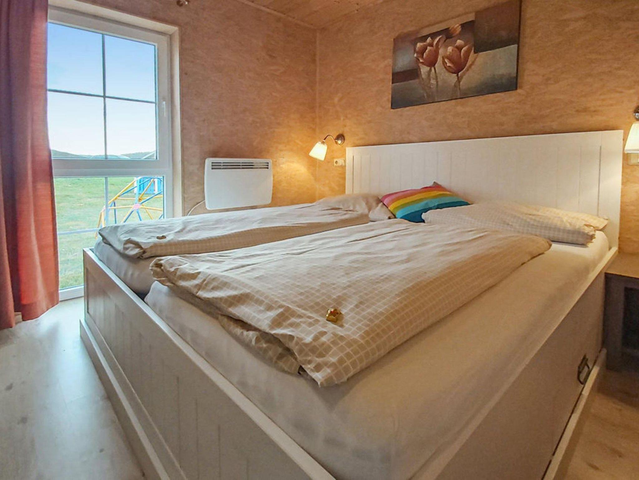 Freistehendes Ferienhaus im skandinavischen Stil mit Terrasse. 20 qm großer Wohn- und Essbereich. Komplett ausgestattete Einbauküche mit Kühlschrank, Herd, Geschirrspüler, Kaffeemaschine, Toaster und Geschirr. Vom Haus aus direkter Blick auf den Badesee. 10 qm großes Schlafzimmer mit Doppelbett und Kinderbettchen. 4 qm großes Badezimmer mit bodenebener Dusche, WC und Waschbecken. Terrasse und Gartenmöbel. 2400 qm großes gepflegtes Grundstück mit Kleinkinderspielplatz.