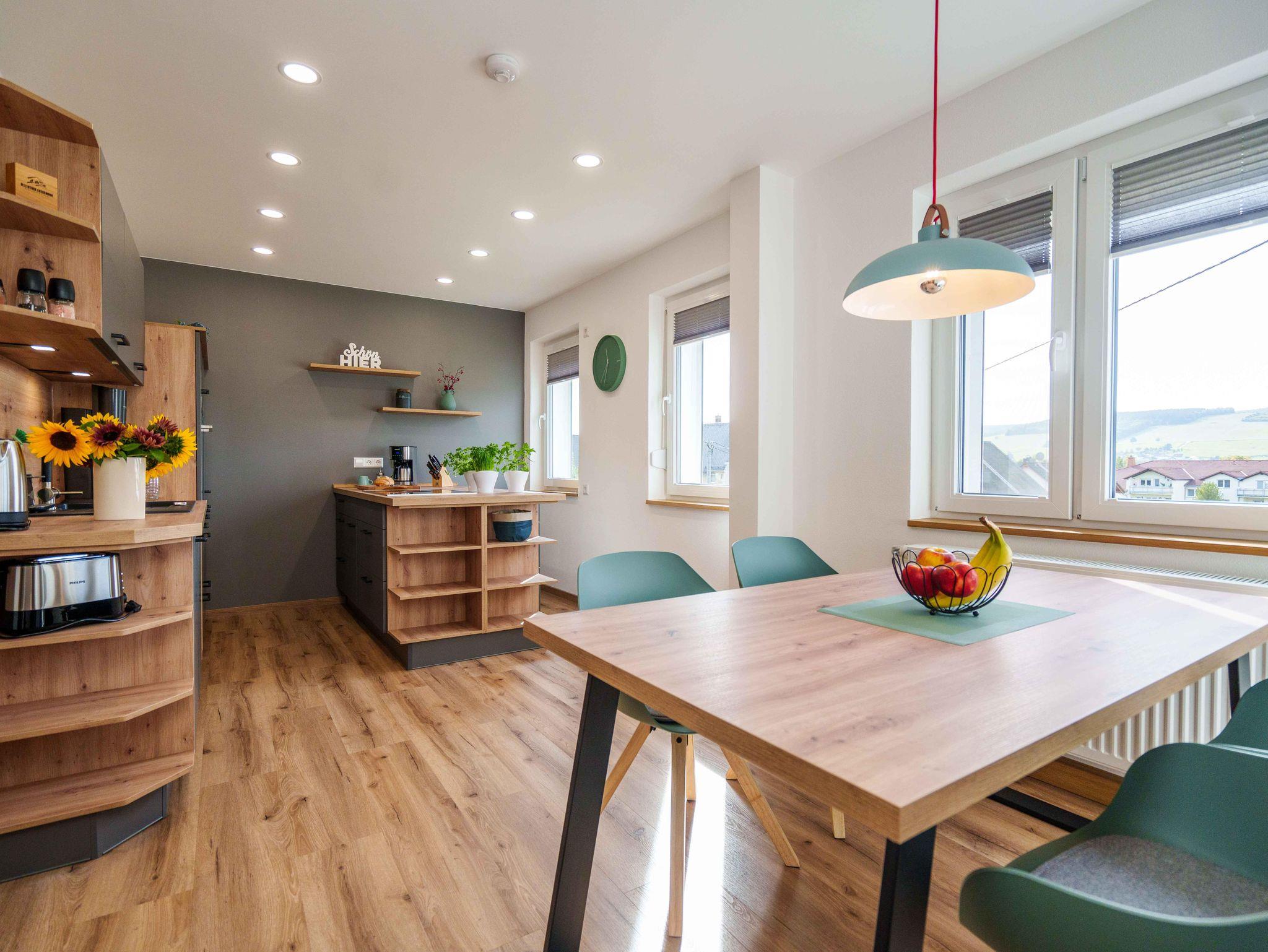 Unsere komfortable Ferienwohnung verfügt über ein großzügiges Wohnzimmer. Hier finden Sie einen gemütlichen Sessel, um den Ausblick zu genießen und ein bequemes Sofa für einen entspannten Tagesausklang. Für unsere kleinen Gäste ist eine Kinderecke eingerichtet. Wohn- und Essbereich sind lichtdurchflutet, dank der großen Fenster auf der Südseite, die ein optimales Raumklima schaffen. In der offenen Küche mit Kochinsel und Kochfeldabzug finden Sie alles, was Sie zum Zubereiten einer gelungenen Mahlzeit benötigen. Der große Esstisch lädt zum gemeinsamen Genießen ein. Das Schlafzimmer ist ein wahrer Traum für alle, die viel Platz mögen. Hier erwartet Sie ein großzügiges Massivholzbett mit einer Breite von 2,70 Metern. Für Familien mit kleinen Kindern ist unser Familienbett sicher ein besonderes Erlebnis. Die Naturholzmöbel und Applikationen aus Zirbe und Almheu schaffen ein angenehmes Schlafambiente. Das hochwertige Badezimmer ist mit einer ebenerdigen Dusche und Badewanne ausgestattet.