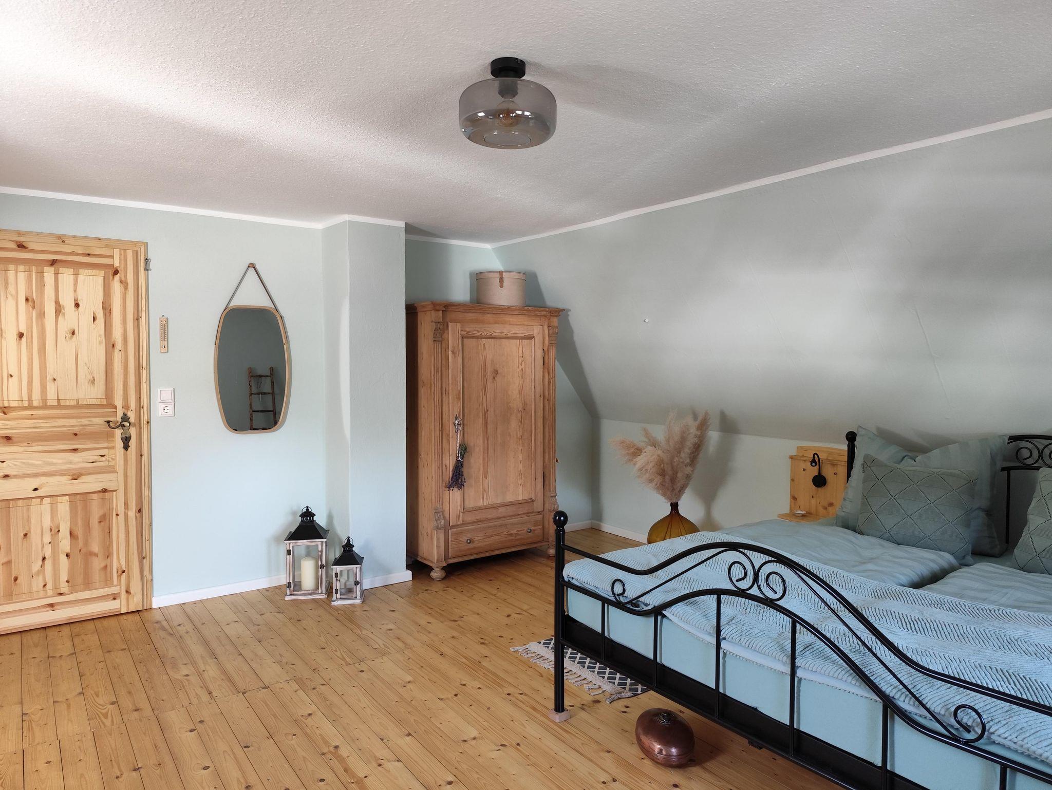 In der oberen Etage, die Sie über eine etwas steilere Holztreppe erreichen, befinden sich die beiden Schlafzimmer. Eines ausgestattet mit einem Doppelbett und das Zweite mit Doppelbett und der Möglichkeit der Aufbettung (Schlafsofa) für eine weitere Person (max. 4 Erwachsene). Falls gewünscht, stellen wir Ihnen auch gern ein Kinderreisebett, einen Kinderhochstuhl sowie ein Kindertöpfchen oder eine Toilettenverkleinerung zur Verfügung, selbstverständlich kostenfrei. Eine gemütliche Lese- bzw. Spielecke sowie ein Büroplatz mit Schreibtisch befinden sich ebenfalls in der oberen Etage.