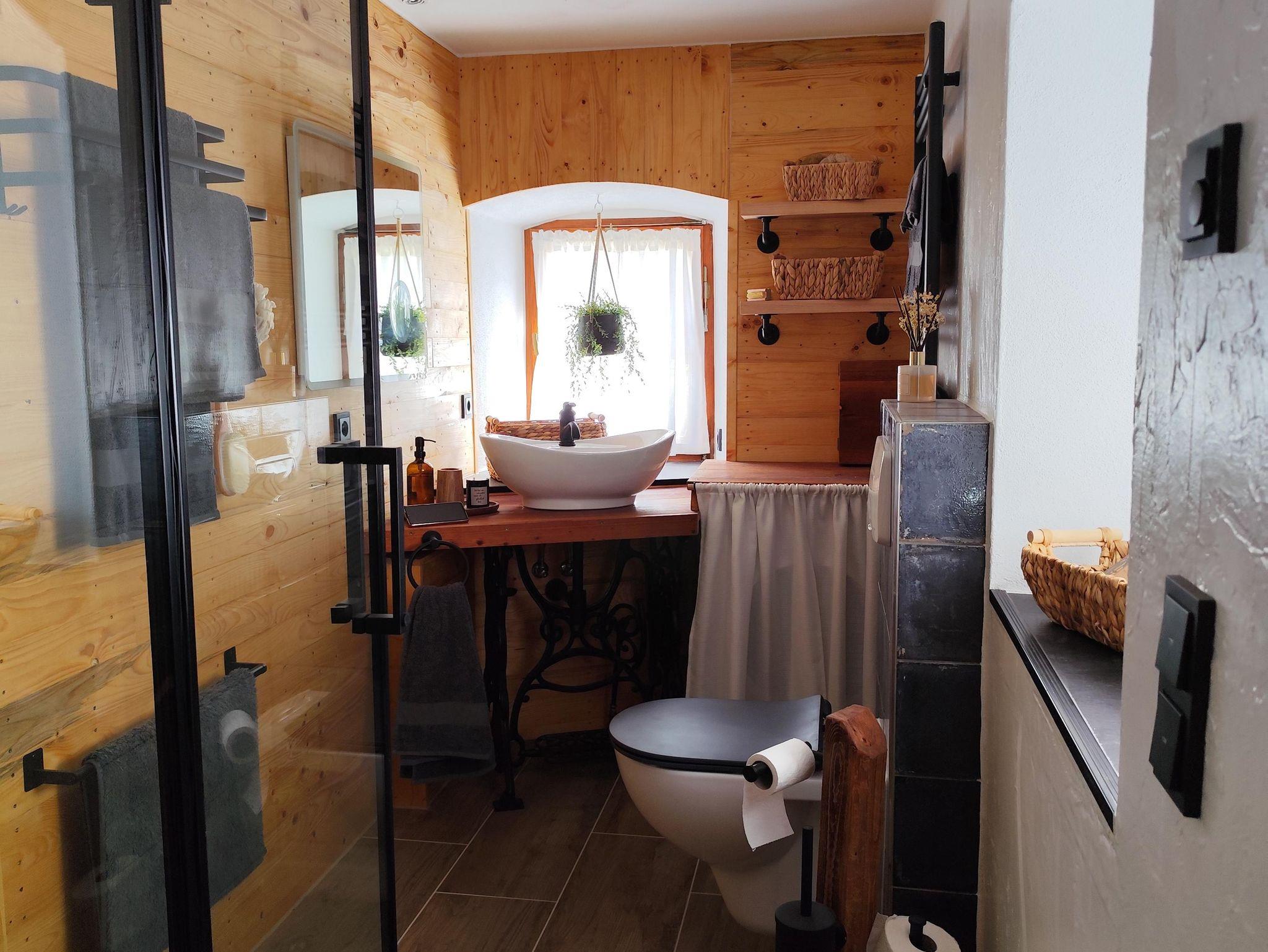 Der Charme der vergangenen Zeit ist natürlich auch gepaart mit dem Komfort der heutigen Zeit. Neben einer vollausgestatteten Küche mit Induktionsherd, Geschirrspüler und Kühlschrank, gehören natürlich auch Kaffeemaschine, Toaster und Wasserkocher zum Inventar. Flachbildfernseher befinden sich in der Küche und im Wohnzimmer. Auch das gemütliche Bad mit Dusche lädt zum Entspannen ein.