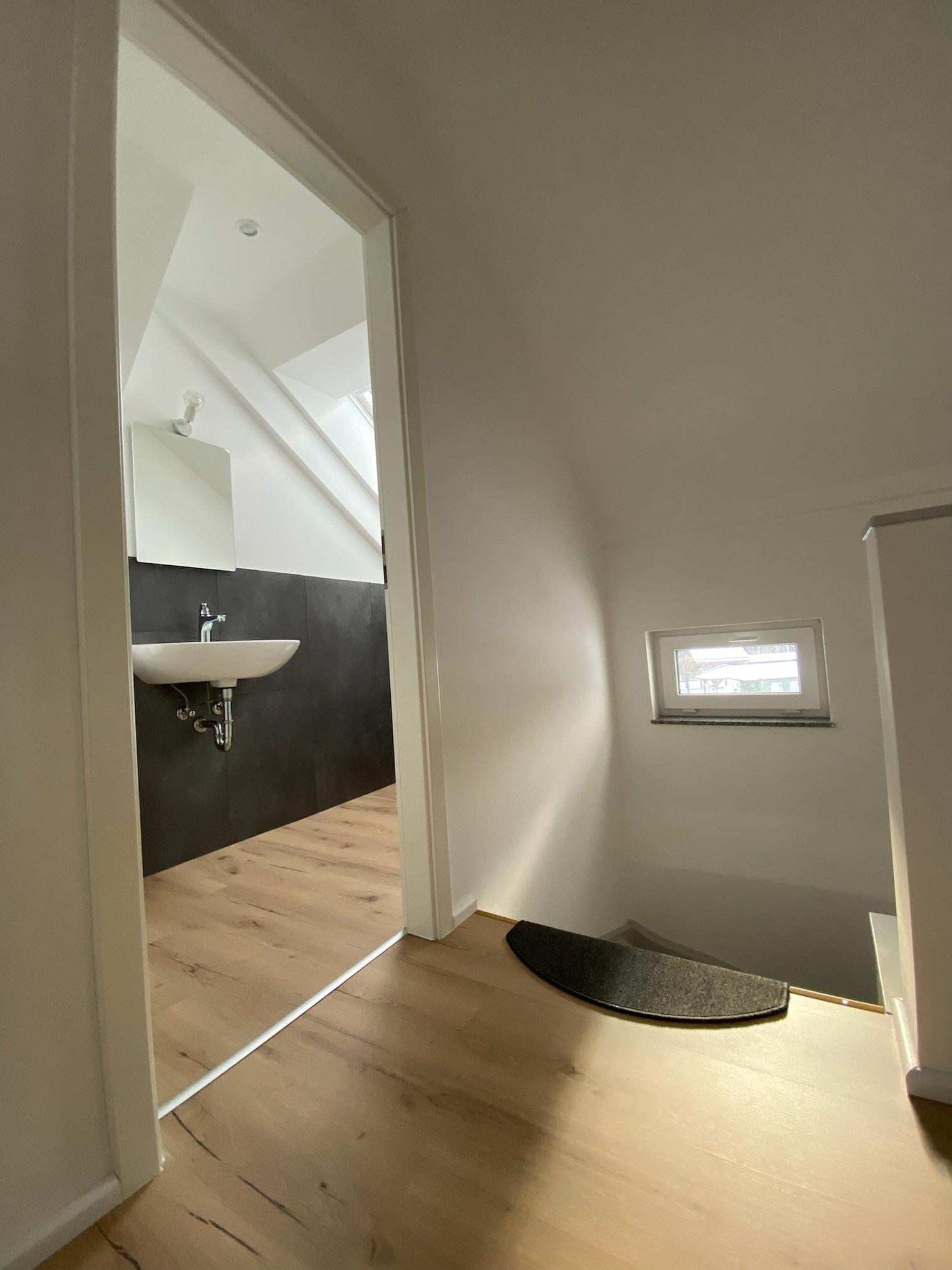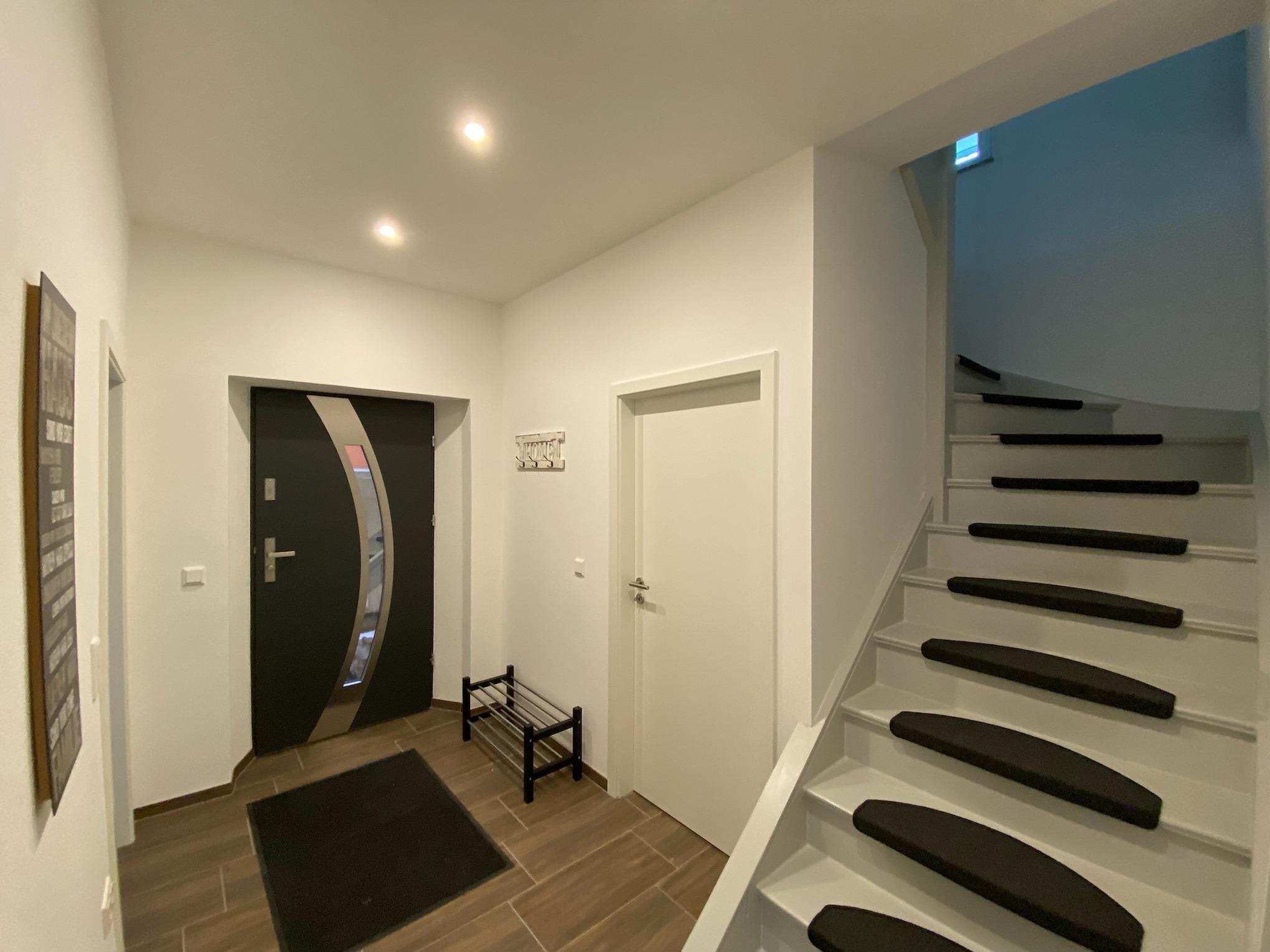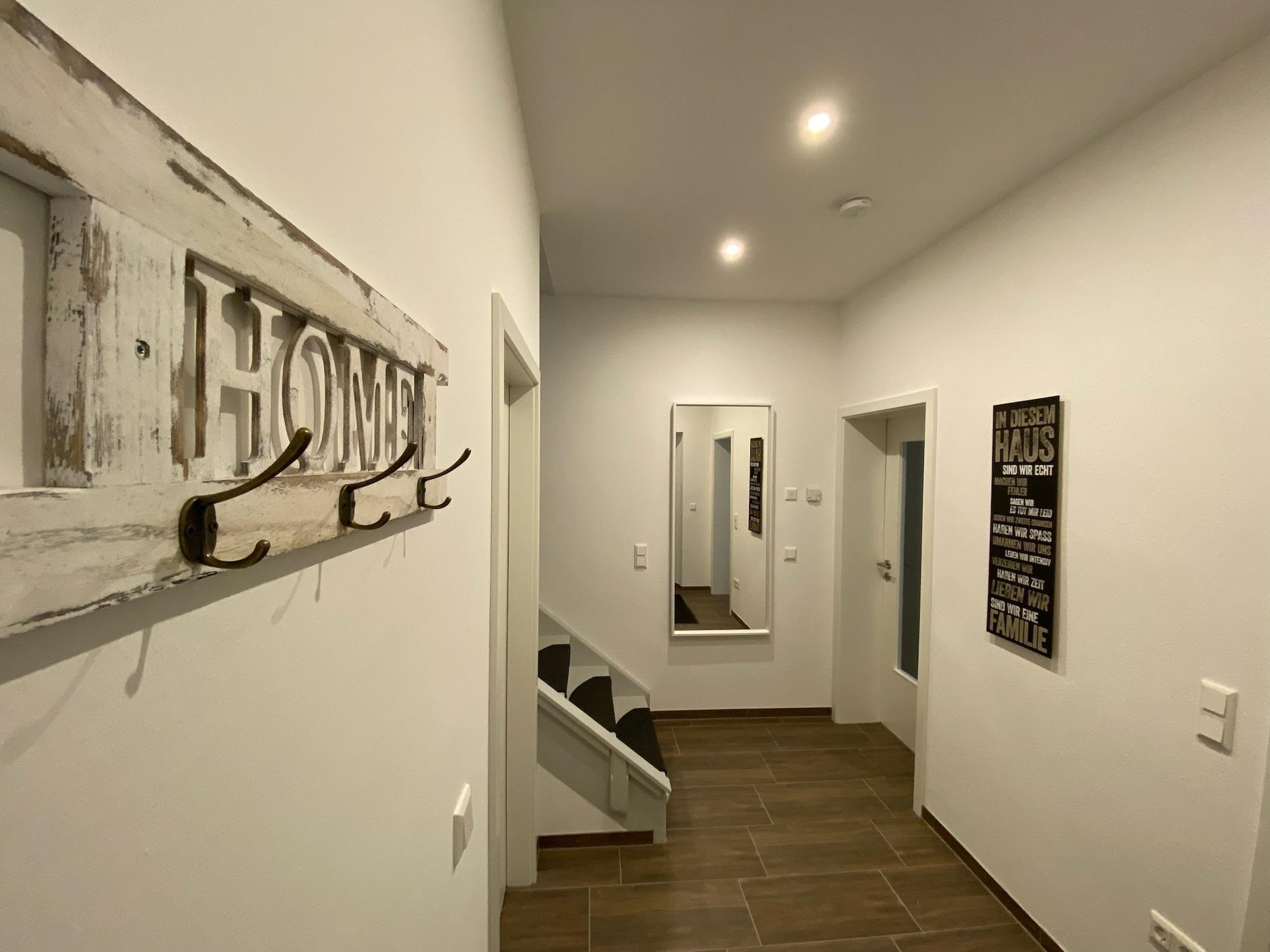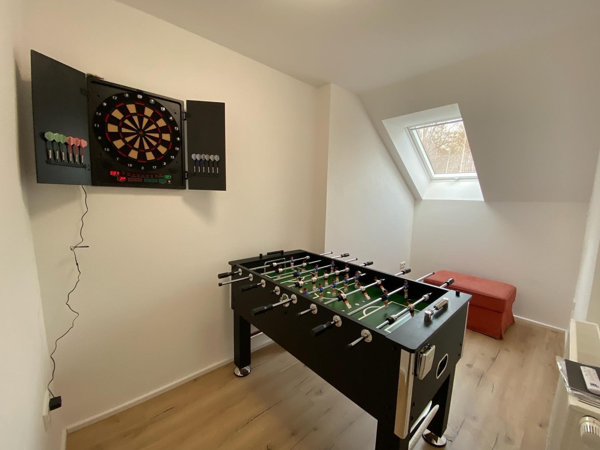 Im Erdgeschoss befindet sich der Wohn und Essbereich das Bad mit Infrarot Sauna sowie ein Abstellraum mit Waschmaschinen. Oben gibt es 3 Schlafzimmern ein kleines Bad und ein Spielzimmer mit Dart und Kicker .