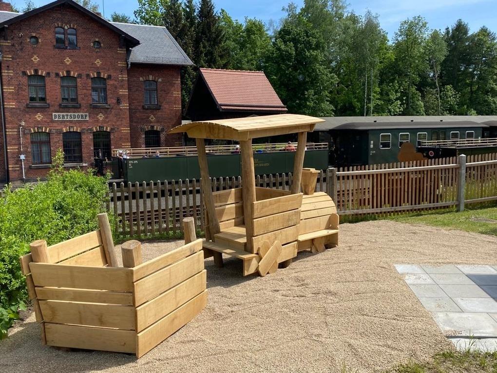 Vom Wohnzimmer gelangt man auf die überdachte Terrasse mit Blick auf den Bahnhof der Schmalspurbahn.