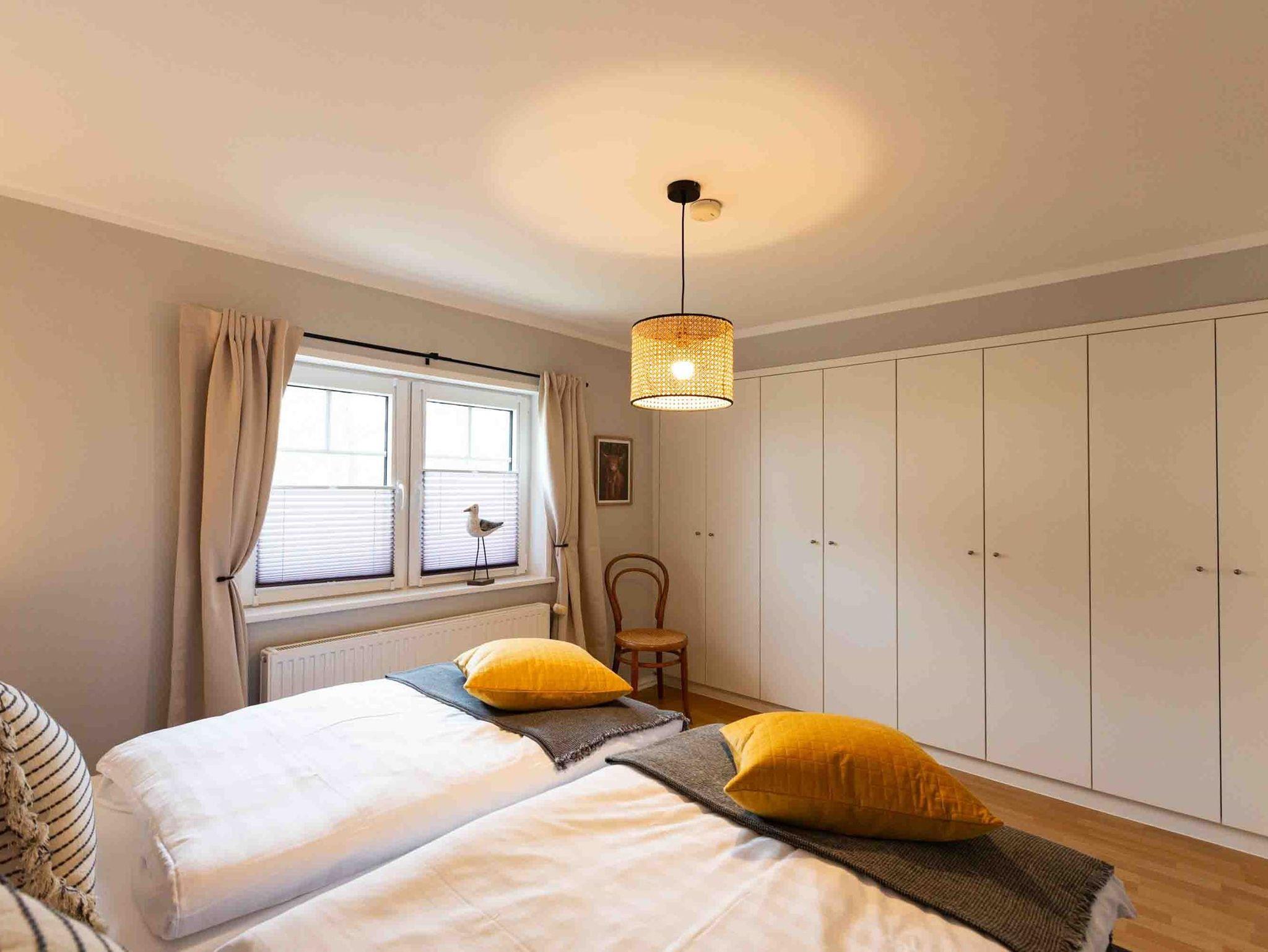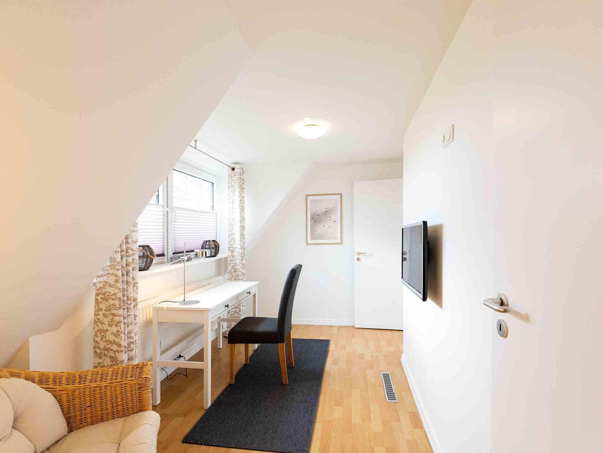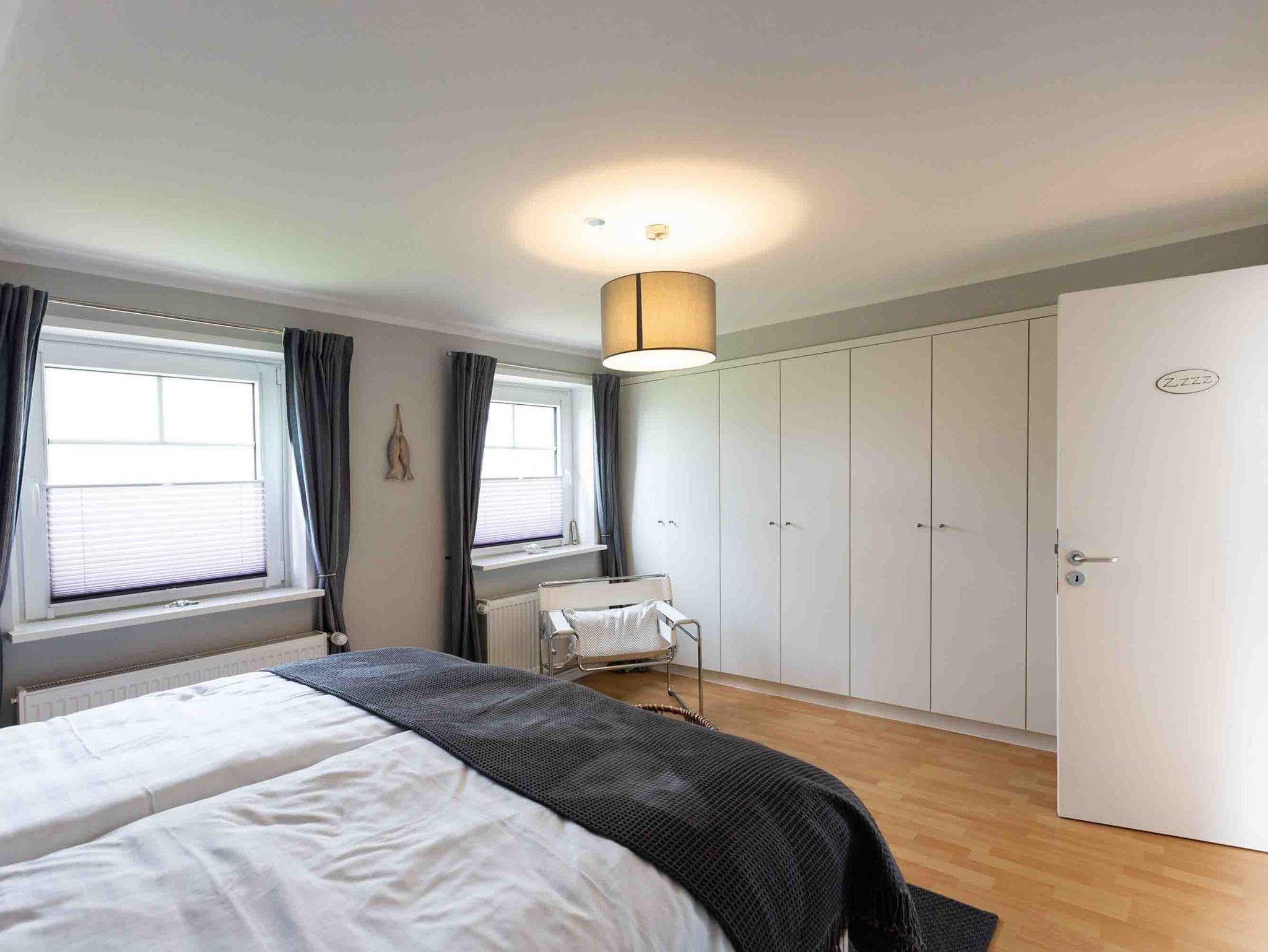 Drei Schlafzimmer mit Doppelbetten (zwei mit 2x 80x200cm, eines mit 1x 90x200cm). Zwei Bäder: eines mit Badewanne, eines mit Dusche. Arbeitszimmer im OG mit Schreibtisch und TV.