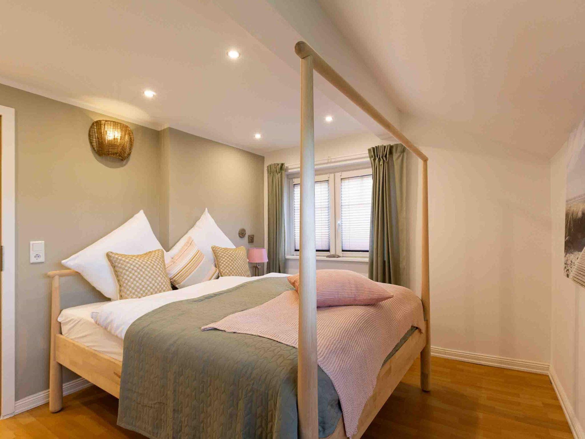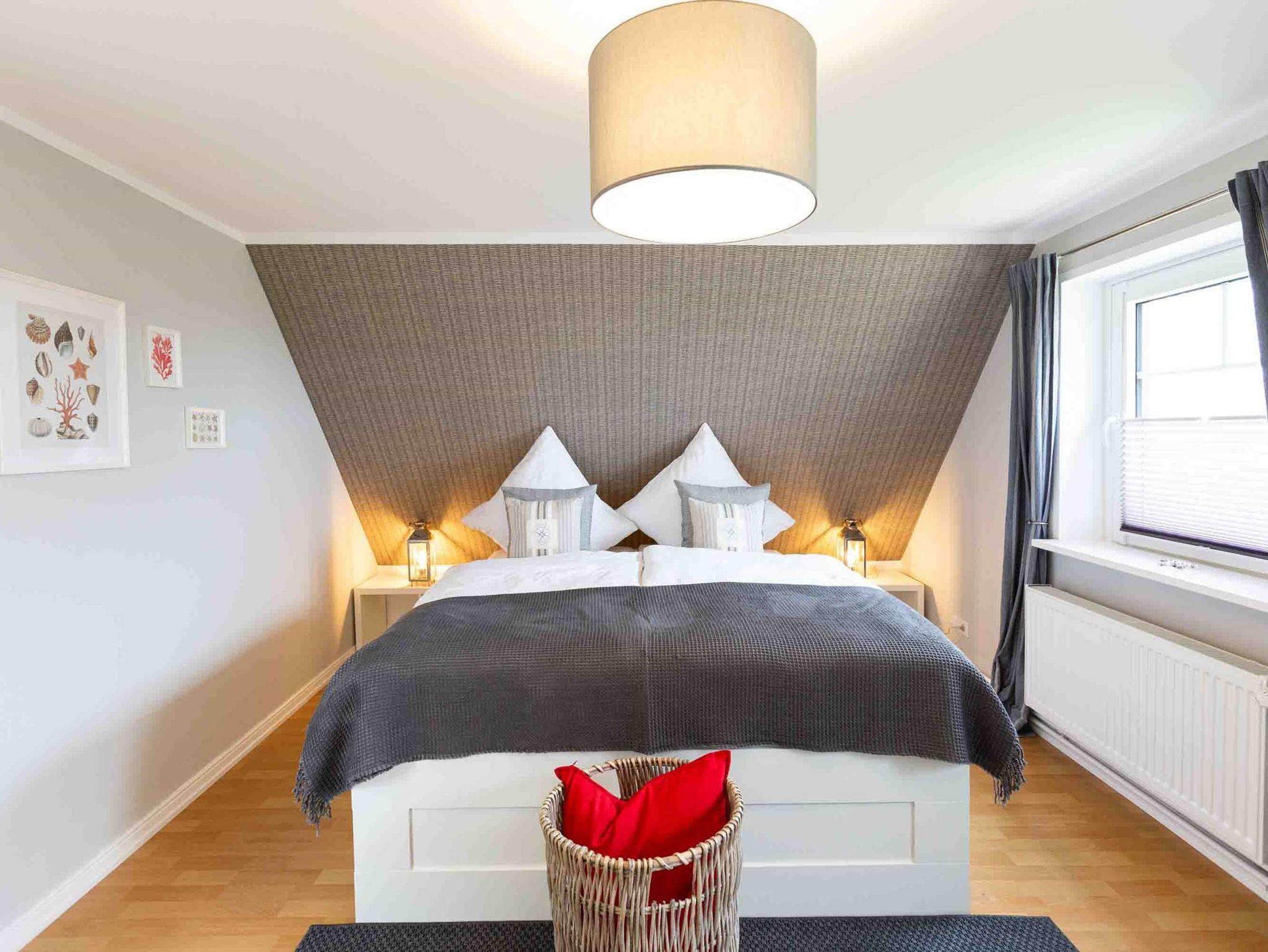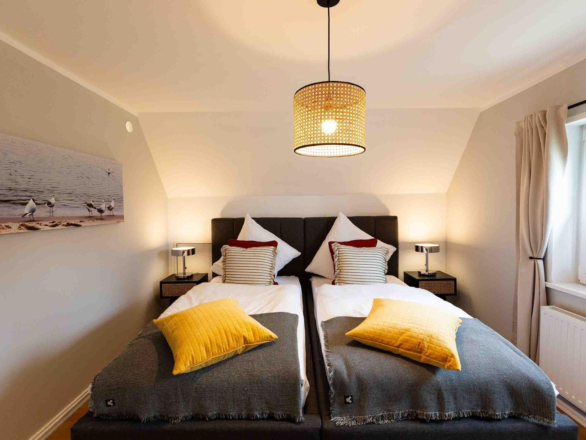 Drei Schlafzimmer mit Doppelbetten (zwei mit 2x 80x200cm, eines mit 1x 90x200cm). Zwei Bäder: eines mit Badewanne, eines mit Dusche. Arbeitszimmer im OG mit Schreibtisch und TV.