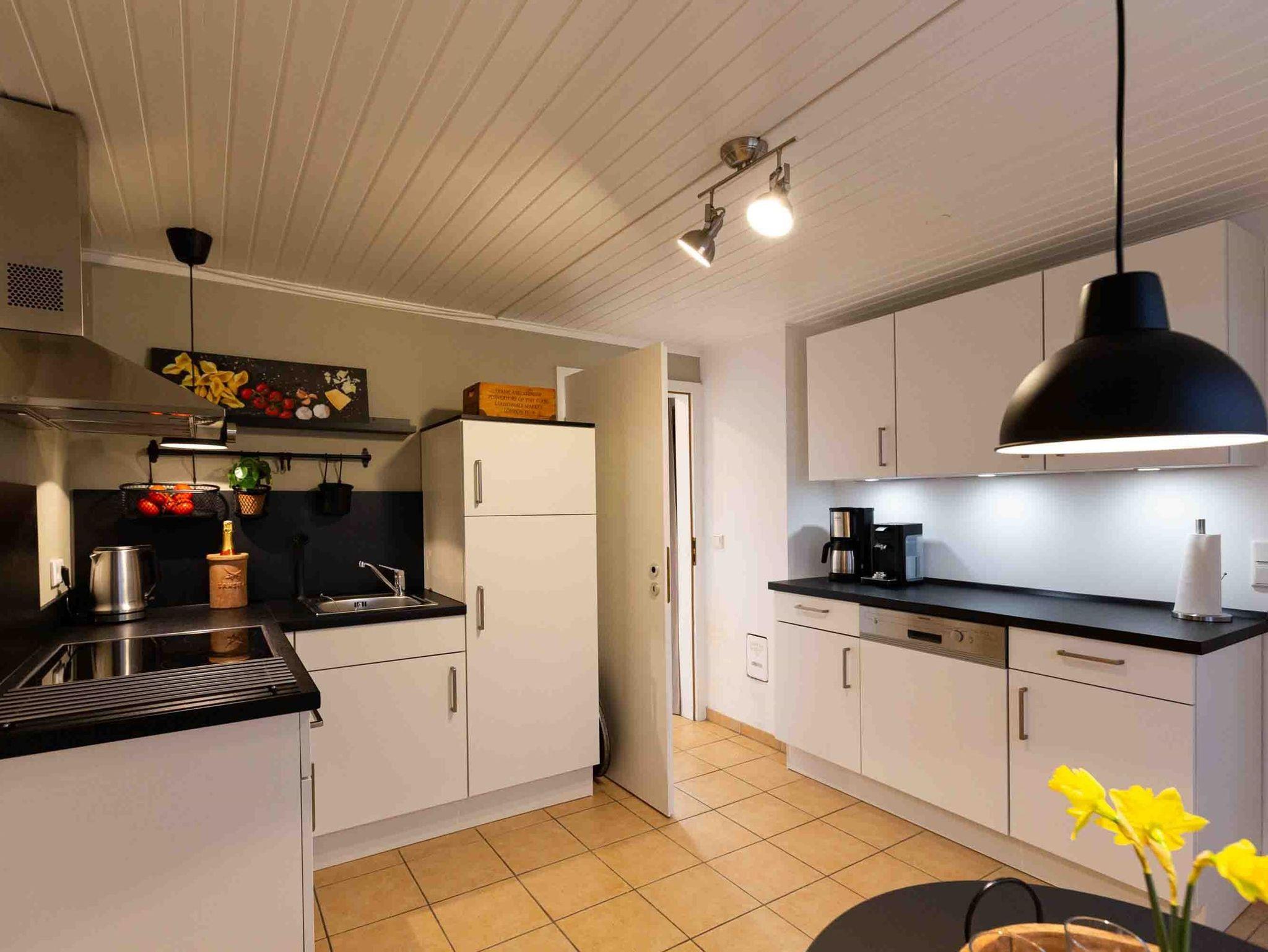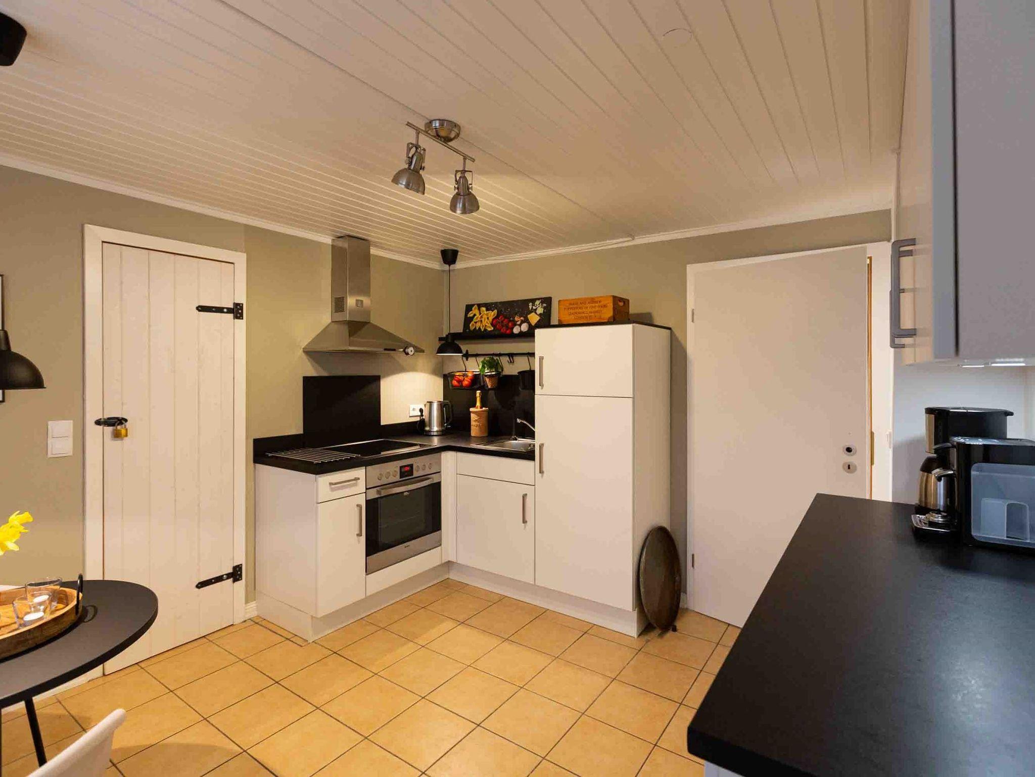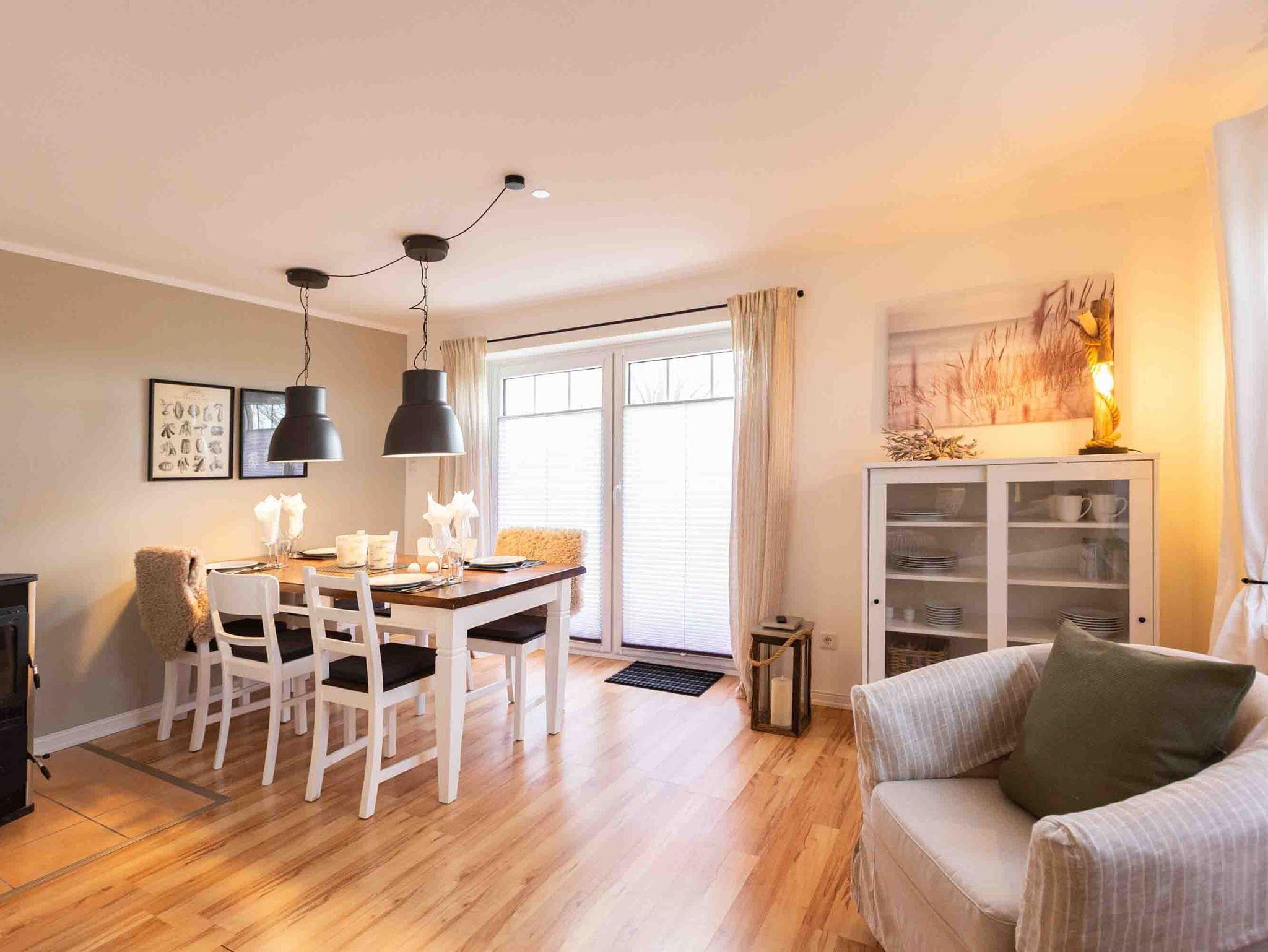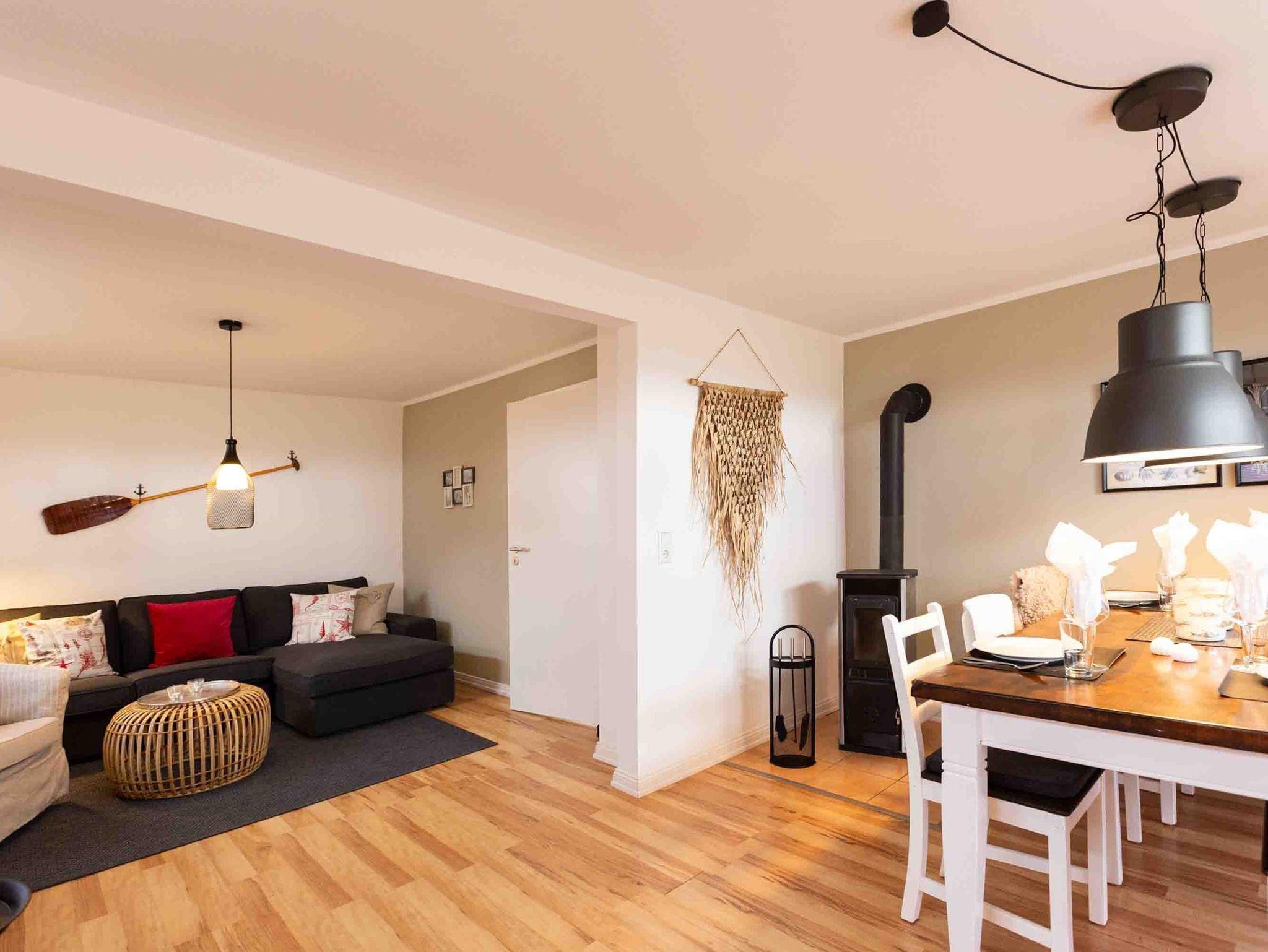 Das Wohnzimmer verfügt über ein Ecksofa, Sessel, Kabel-TV, Bluetooth-Soundanlage, Esstisch und Kaminofen. Zugang zur Süd-Terrasse mit Strandkorb, Kohlegrill und weiterem Freisitz im großen Garten. Die separate Küche ist hochwertig ausgestattet.