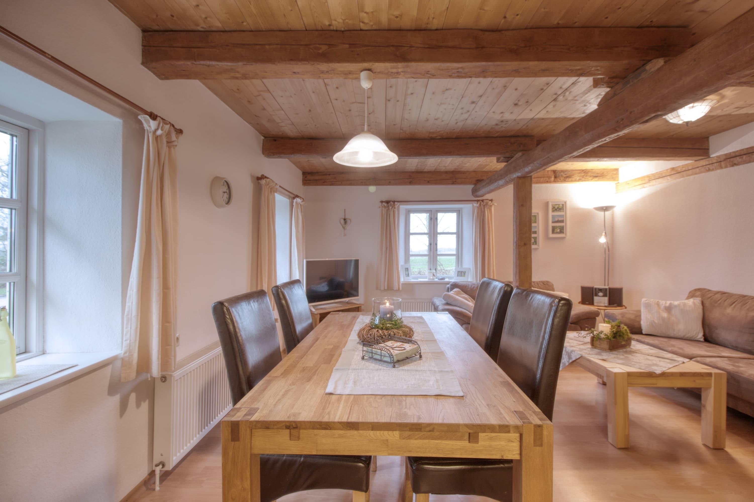 Ein Flachbild-TV sorgen für Unterhaltung, während der Esstisch genug Raum für