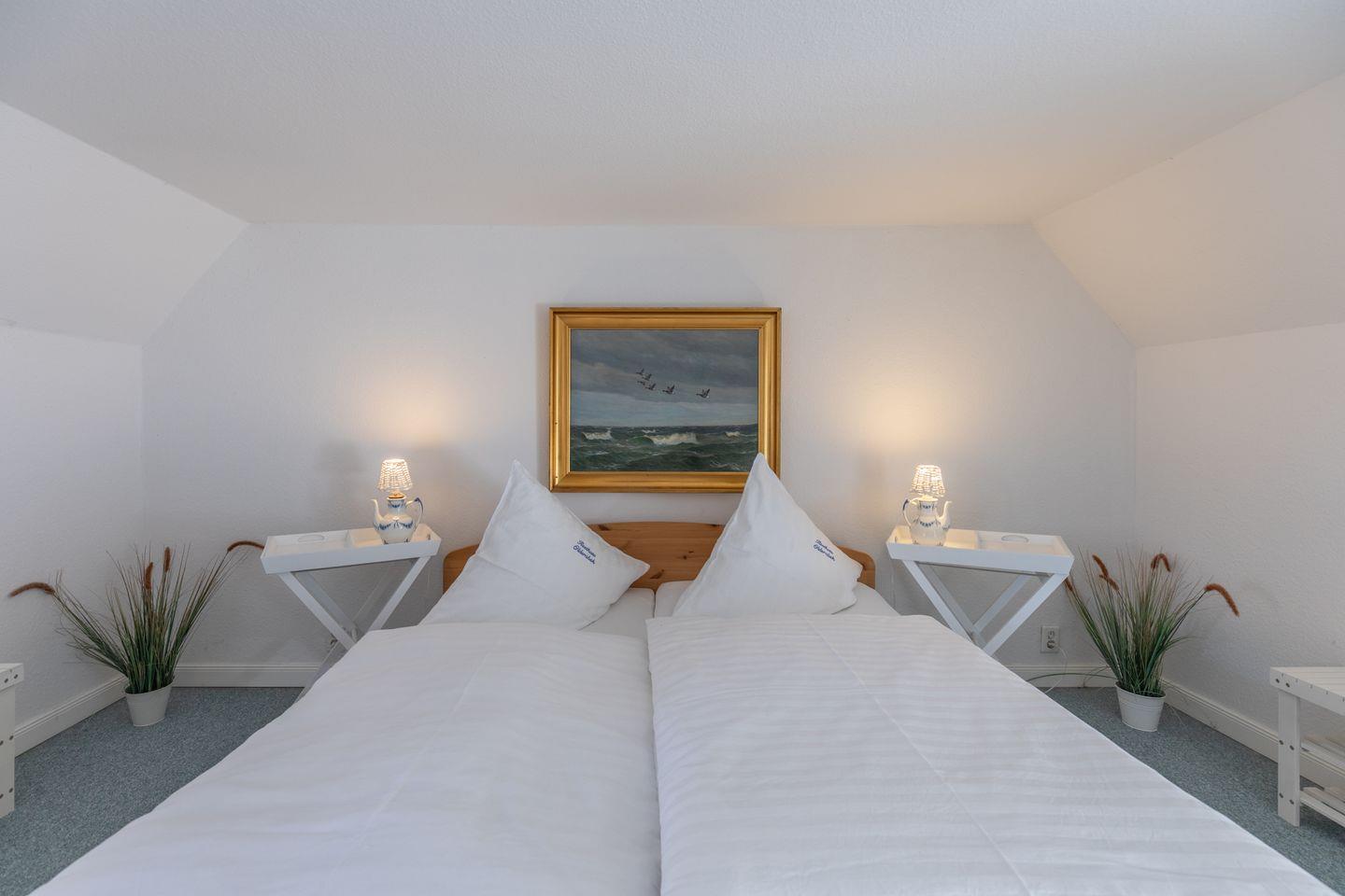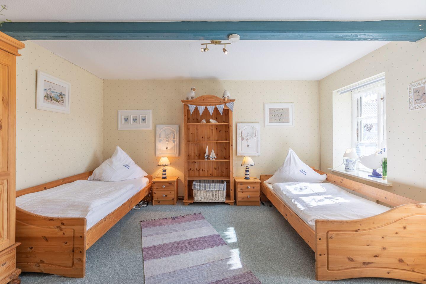 Das Ferienhaus verfügt über drei Schlafzimmer: zwei im Erdgeschoss mit jeweils zwei Einzelbetten und eines im Obergeschoss (über eine Holztreppe erreichbar) mit einem Doppelbett (180 x 200). Die offene Landhausküche ist mit einem Cerankochfeld, Geschirrspüler, Backofen, Kühlschrank, Kaffeemaschinen und Mikrowelle ausgestattet.