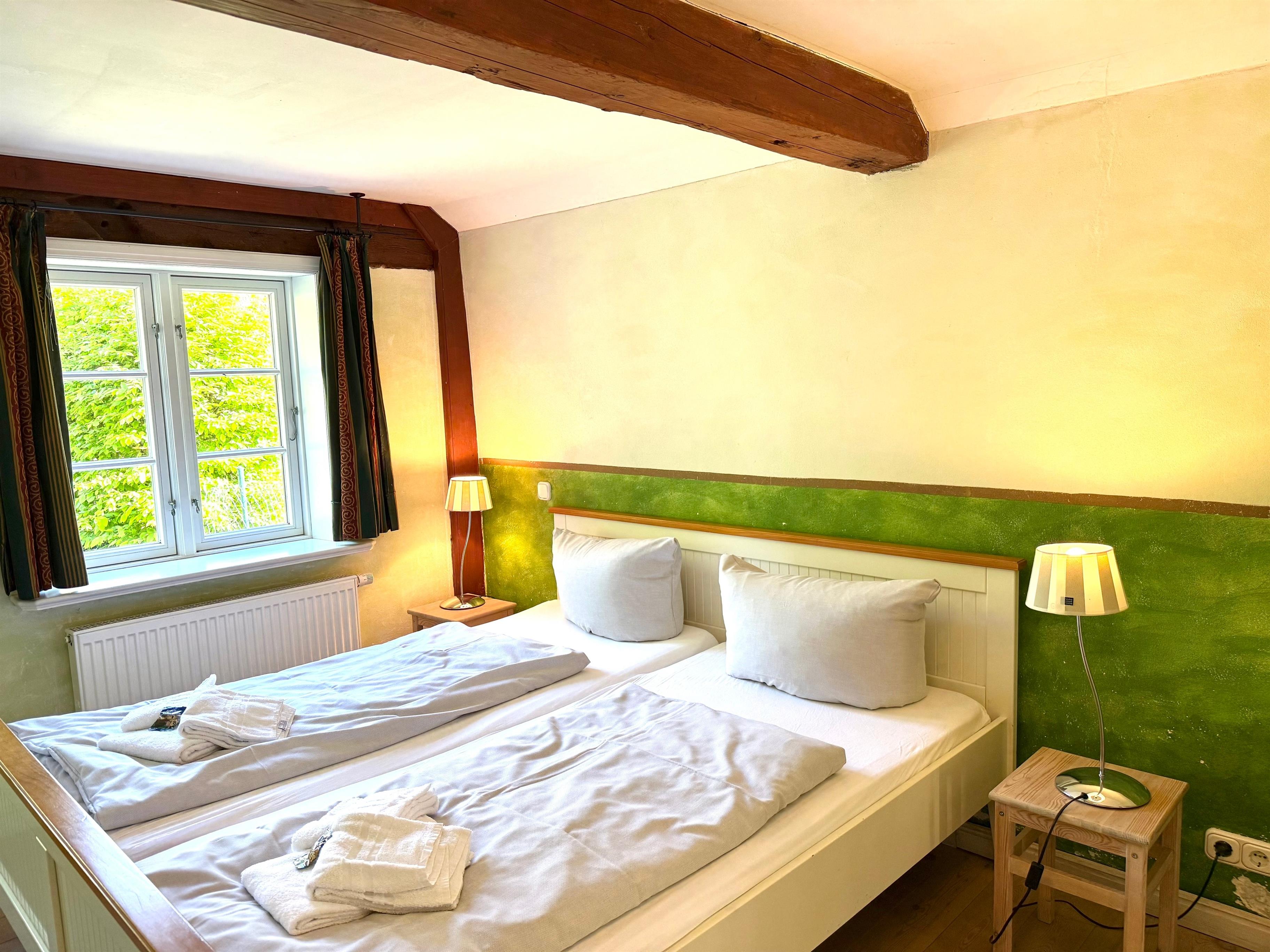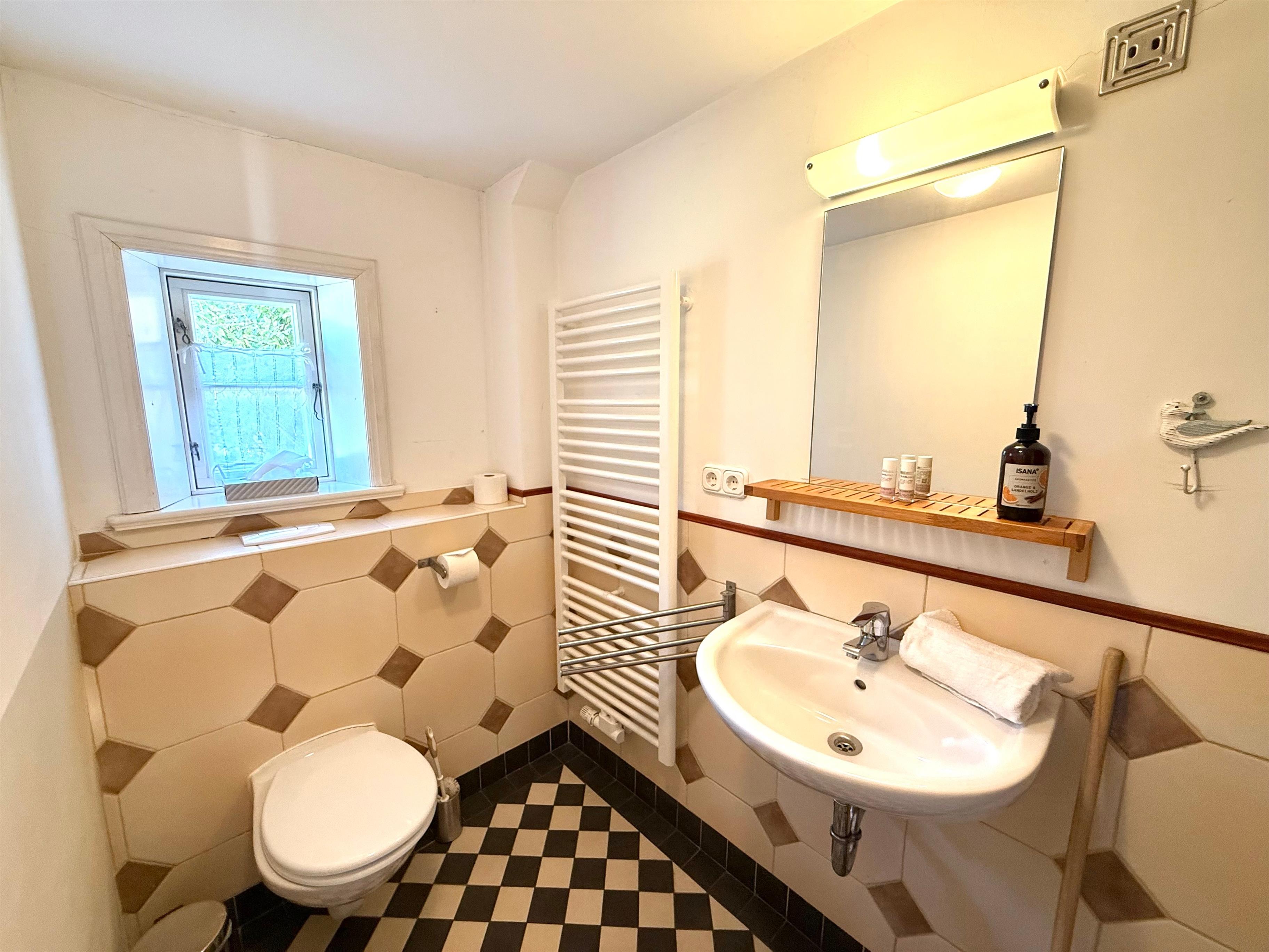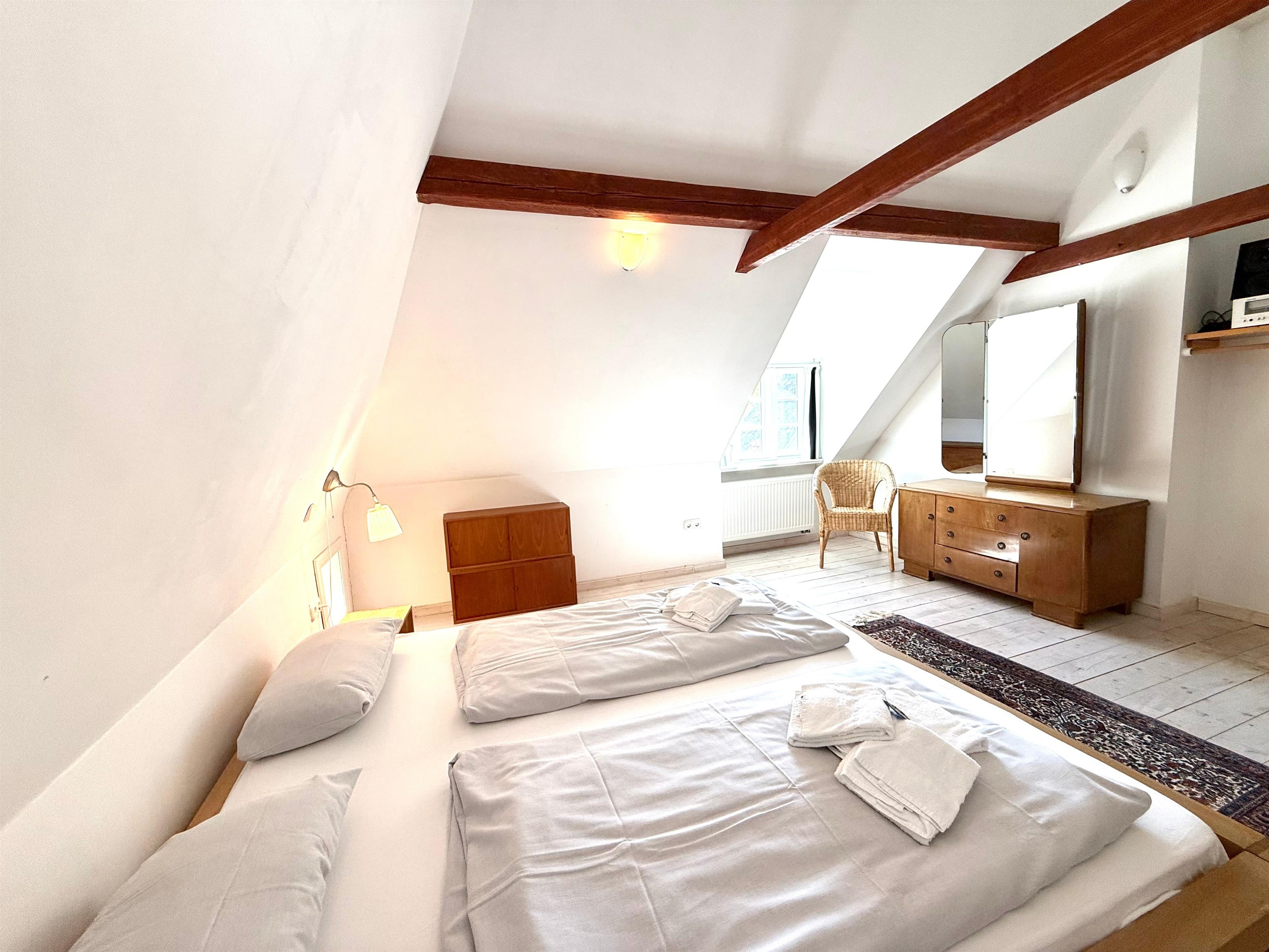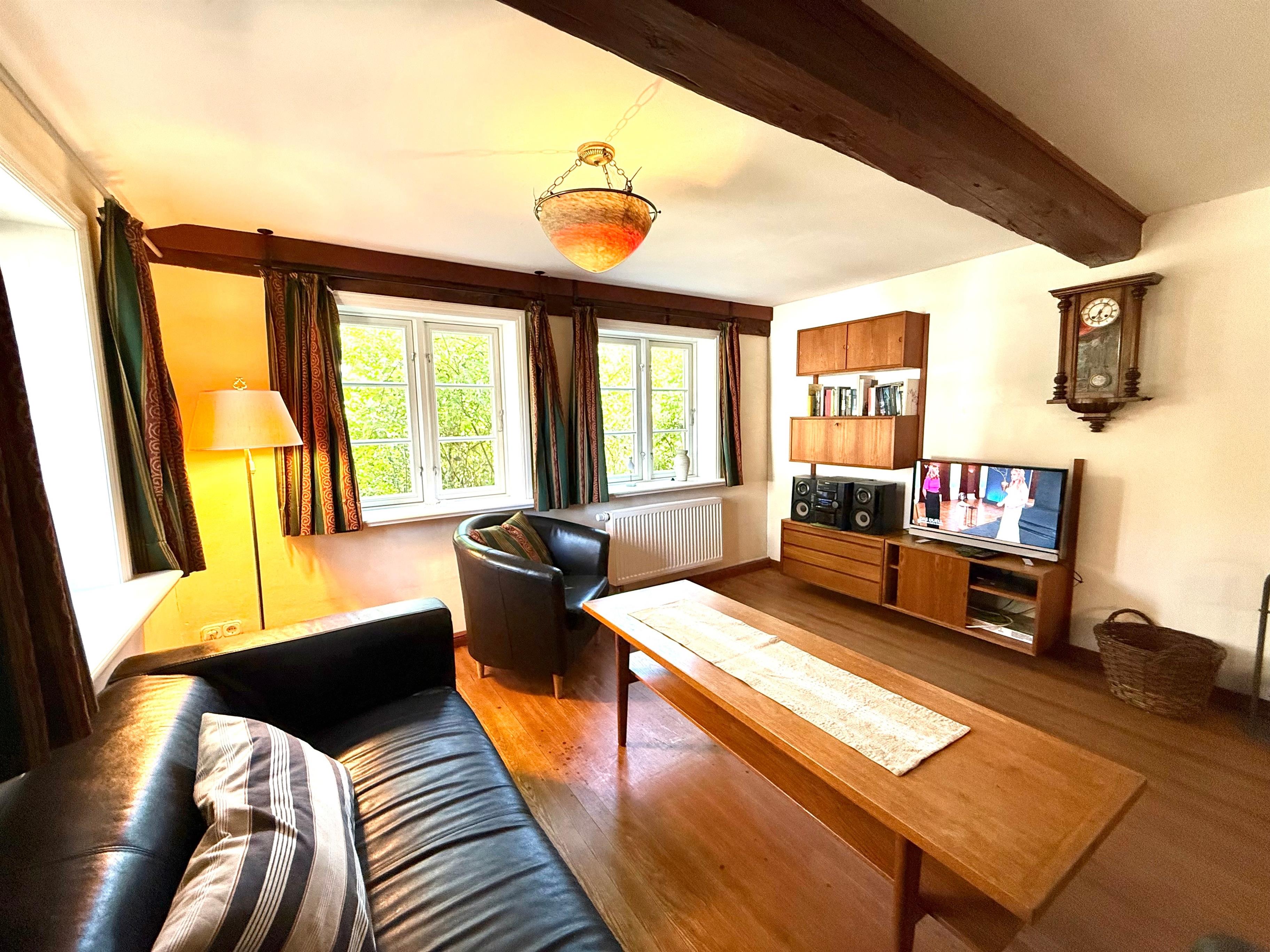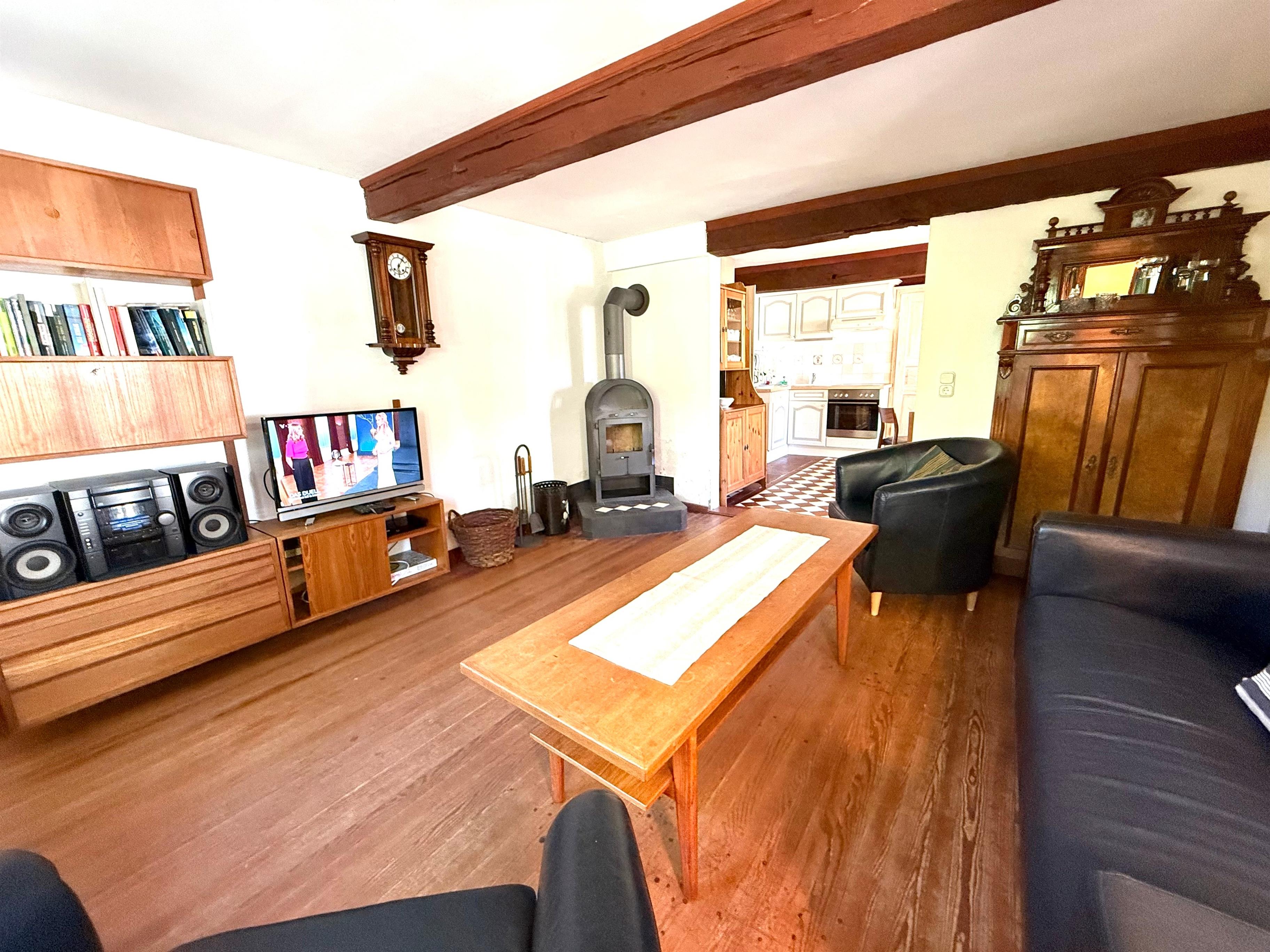 Diese Wohnung für 6 Personen und ist stilvoll und gemütlich eingerichtet. Im Wohnzimmer finden Sie einen Fernseher mit SAT-Anschluss, Musikanlage mit DVD und einen Kaminofen. Die Wohnküche hat noch den alten Fliesenboden und eine Einbauküche mit Spülmaschine. Ebenfalls im Erdgeschoss sind ein Schlafzimmer, ein Duschbad mit seniorengerechter, bodengleicher Dusche und angrenzender Sauna. Im Dachgeschoss sind das Elternschlafzimmer, ein Kinderzimmer mit Etagenbett und ein Wannenbad.