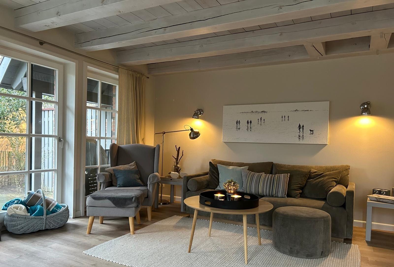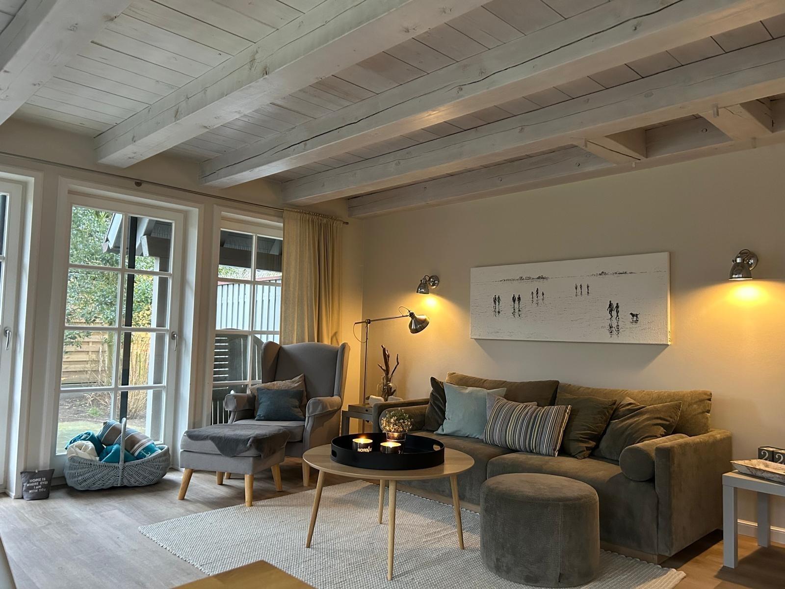 Das Ferienhaus "Auszeit" liegt im idyllischen Oldsum, in einer ruhigen kleinen Seitenstraße, am Rande der Marsch. Das ca. 100 qm große Haus ist gerade sehr aufwendig saniert und modernisiert worden. Es besticht durch seine hochwertige, komfortable Ausstattung sowie die helle und freundliche Farbgebung, die sich in allen Räumen wiederfindet. Im Wohnbereich befindet sich eine moderne Einbauküche, die mit Markengeräten ausgestattet ist. Sie beinhaltet, Geschirrspüler, Cerankochfeld, Umluftbackofen, Kühlschrank mit Gefrierfach. Die Grundausstattung wie Toaster, Kaffeemaschine, Wasserkocher, Geschirr, Besteck und alles, was man zum Kochen und Backen braucht, ist ebenfalls neu und in ausreichender Menge vorhanden. Der großzügige Essplatz eignet sich für gesellige Mahlzeiten, aber auch für lange Spieleabende. Eine Auswahl an Gesellschaftsspielen ist vorhanden. Die gemütliche Sitzecke lädt ein, die Abende auch bei schlechterem Wetter entspannt zu genießen. WLAN, Sat-TV mit Blue Ray Player und einer Musikanlage inklusive Bluetooth, an der alle herkömmlichen Smartphones angeschlossen werden können, tragen zur Unterhaltung bei.