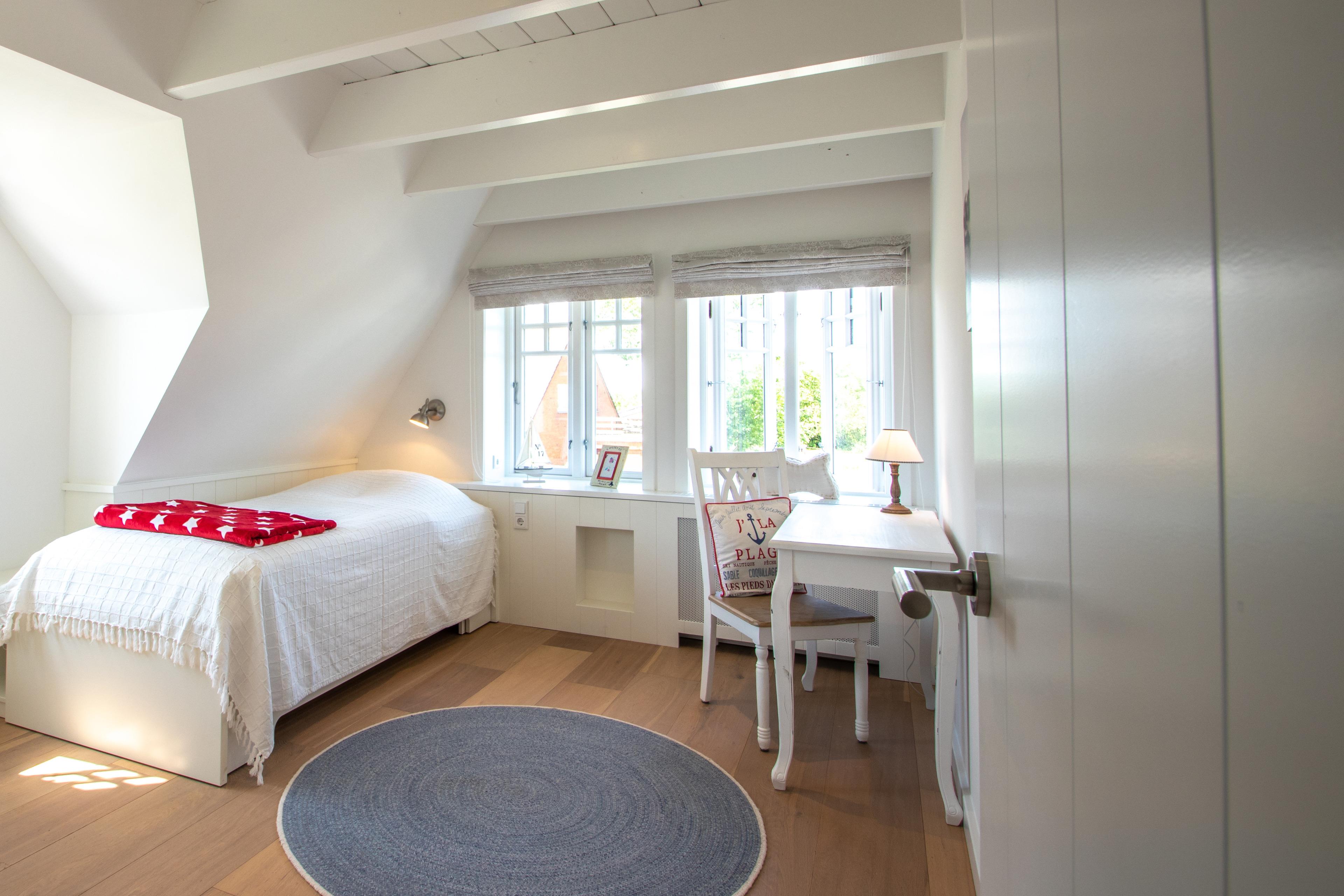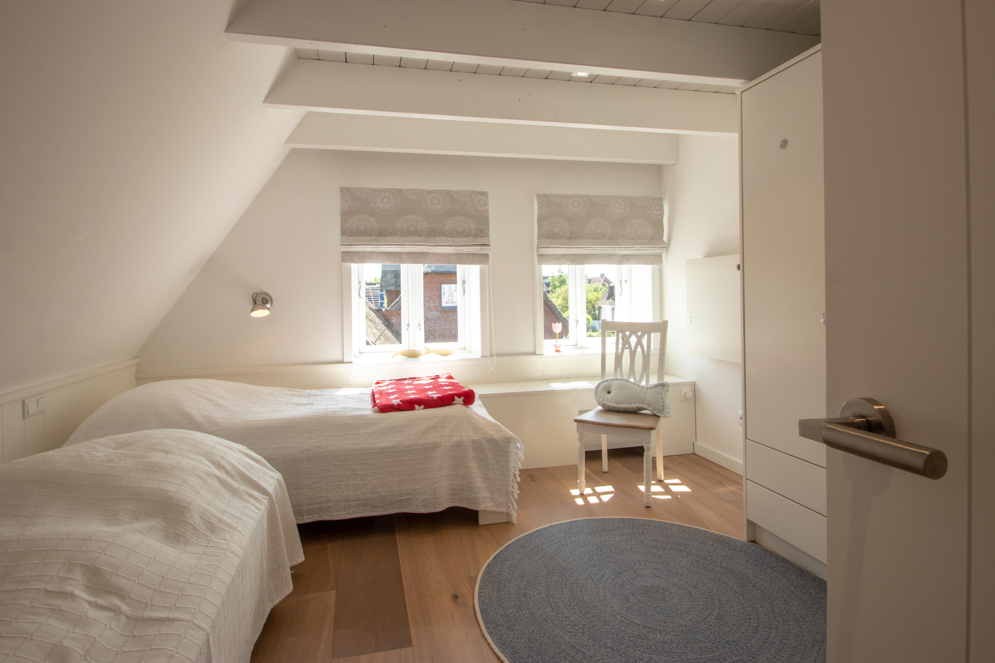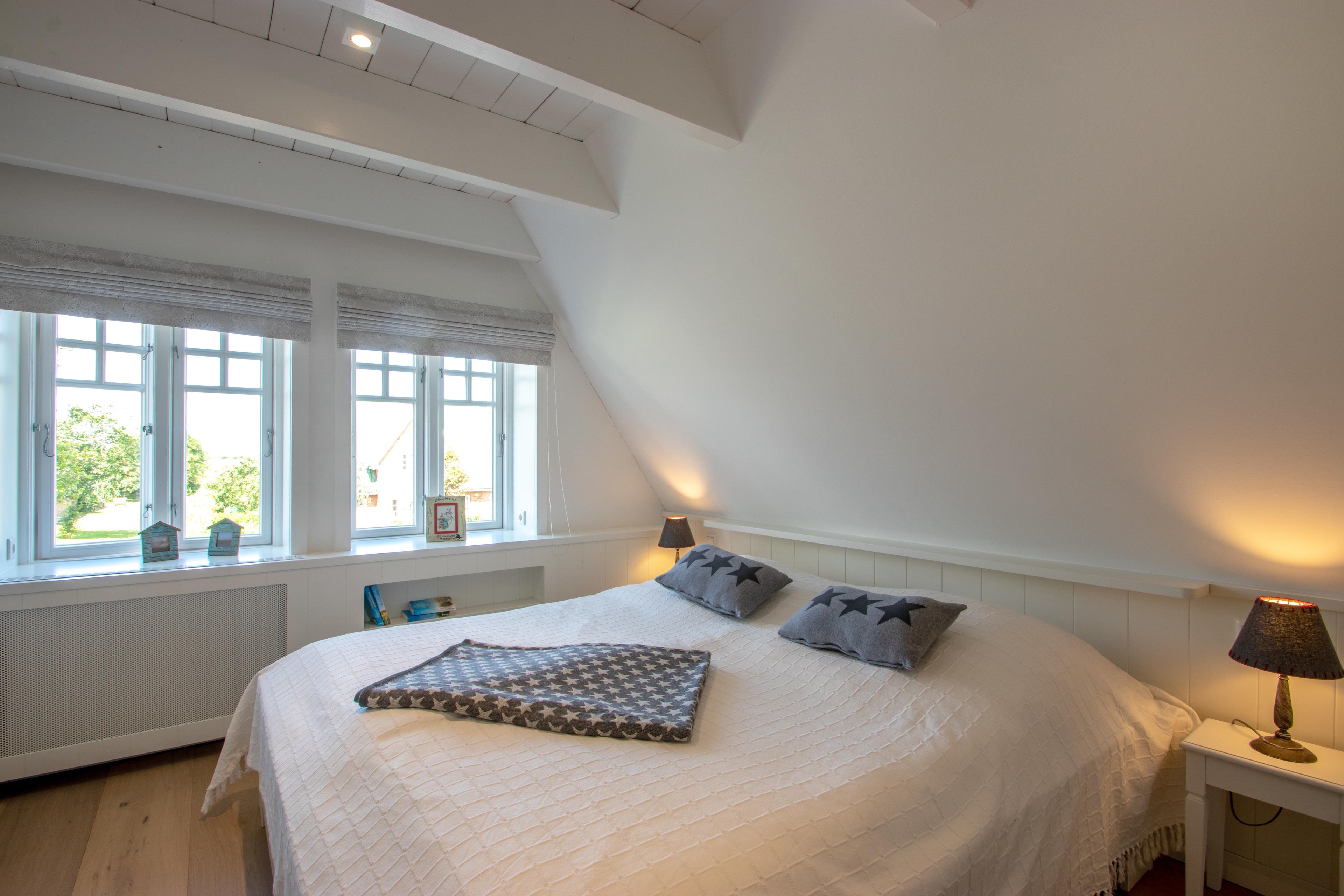 Im Obergeschoss befinden sich drei Schlafzimmer, eines davon mit einem Doppelbett (Breite 1,80 m). Die beiden Einzelbetten des zweiten Schlafzimmers können zu einem Doppelbett zusammengeschoben werden. Das ausziehbare Einzelbett des dritten Schlafzimmers kann in ein Doppelbett "verwandelt" werden. Ferner befindet sich hier das komfortable Hauptbad mit Badewanne, Dusche, Doppelwaschbecken und als Highlight eine Sauna mit Außenfenster. Der geräumige Flur wurde gemütlich mit Lese- und Fernsehecke eingerichtet (weitere Fernsehmöglichkeiten im Wohnzimmer und in einem der Schlafzimmer).