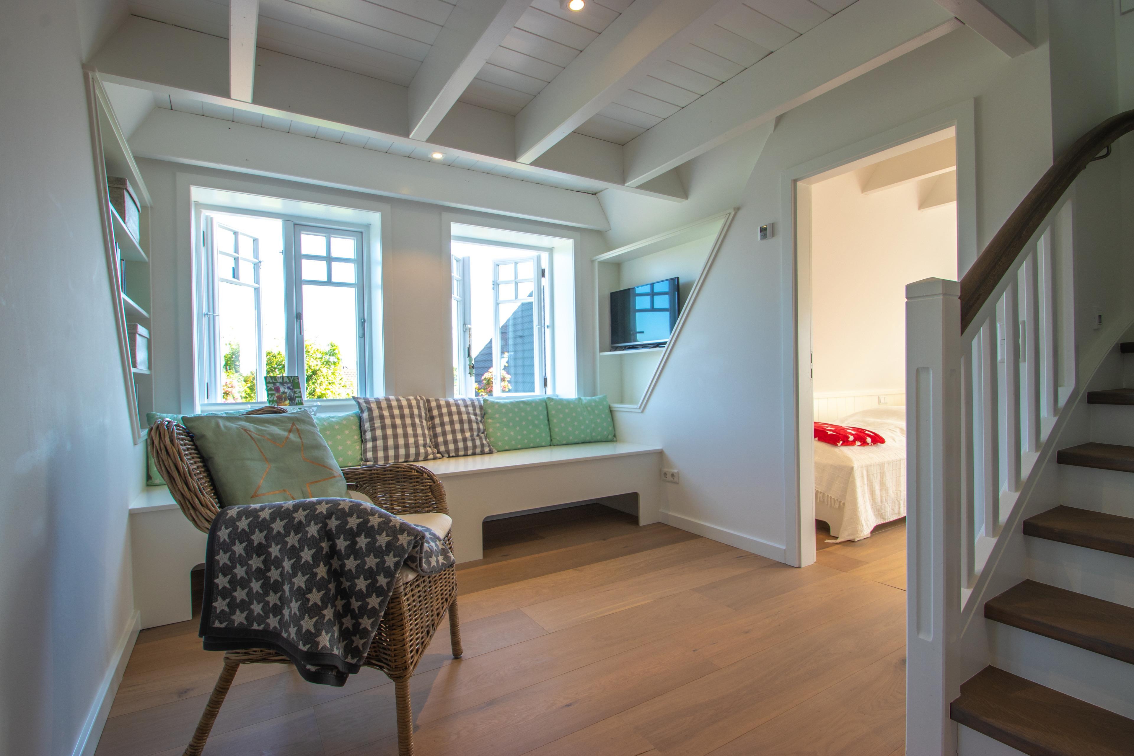 Das Haus liegt am Rande des historischen Oldsumer Dorfkerns. Die beliebten Cafés, das Lebensmittelgeschäft, die Bushaltestelle sowie ein großzügig angelegter Kinderspielplatz sind bequem zu Fuß erreichbar. Aus den oberen Stockwerken dieses Traumhauses haben Sie einen herrlichen Blick über Oldsum und über die Marsch hinüber bis zum Deich. Bei klarer Sicht können Sie sogar die Nachbarinsel erspähen!
