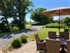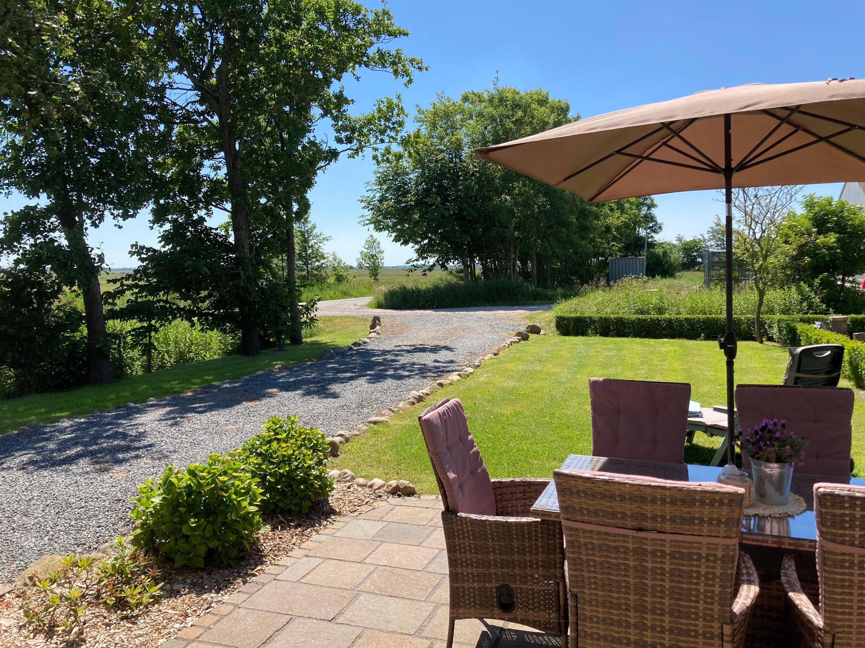 Zur Wohnung gehört eine nach Süden gerichtete Terrasse mit Gartenmöbel, Sonnenschirm, Grill, Strandkorb und angrenzendem Garten.