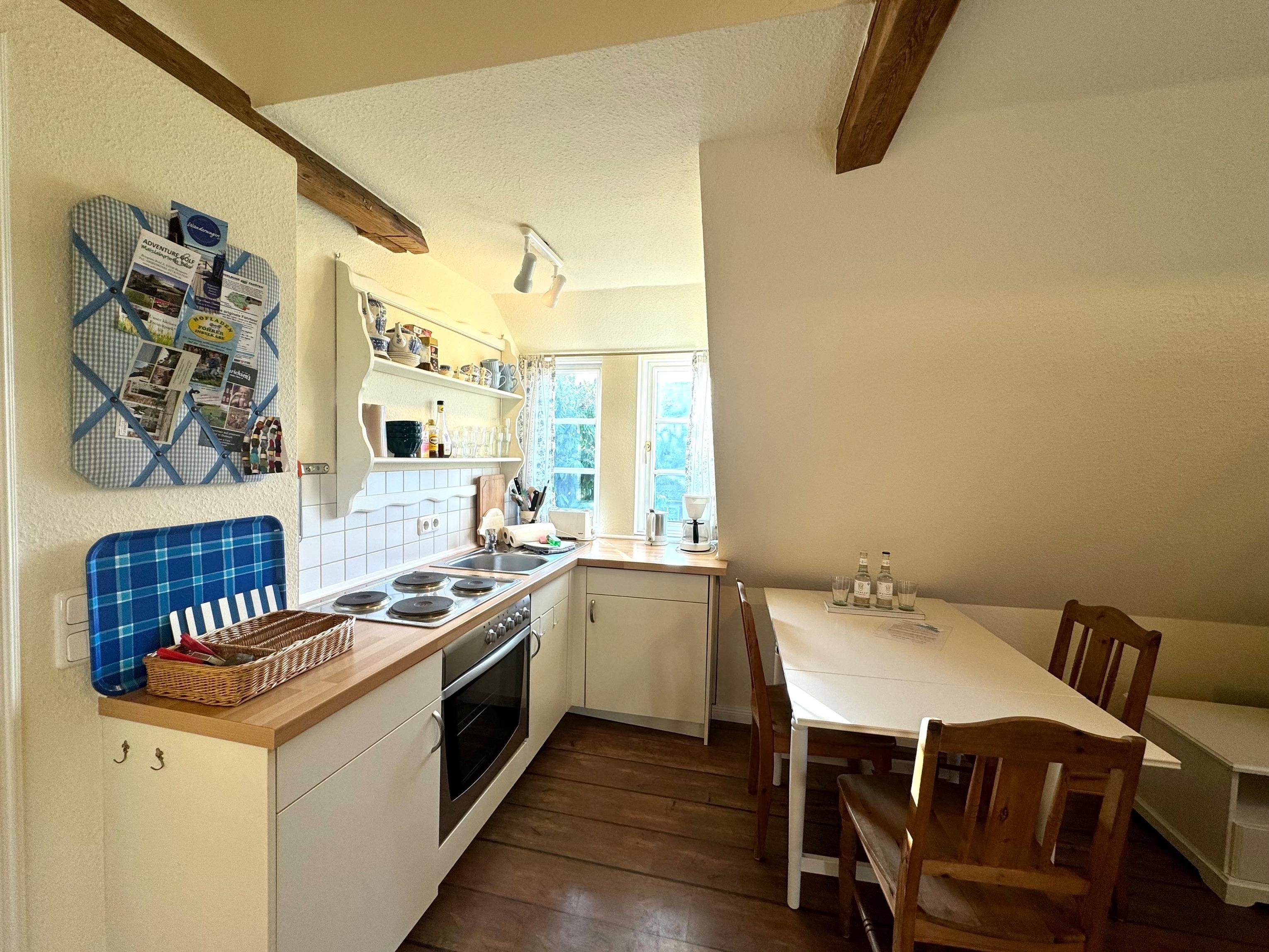 Die voll ausgestattete Küche verfügt über Kühlschrank, Ofen, Kaffeemaschine und Toaster.