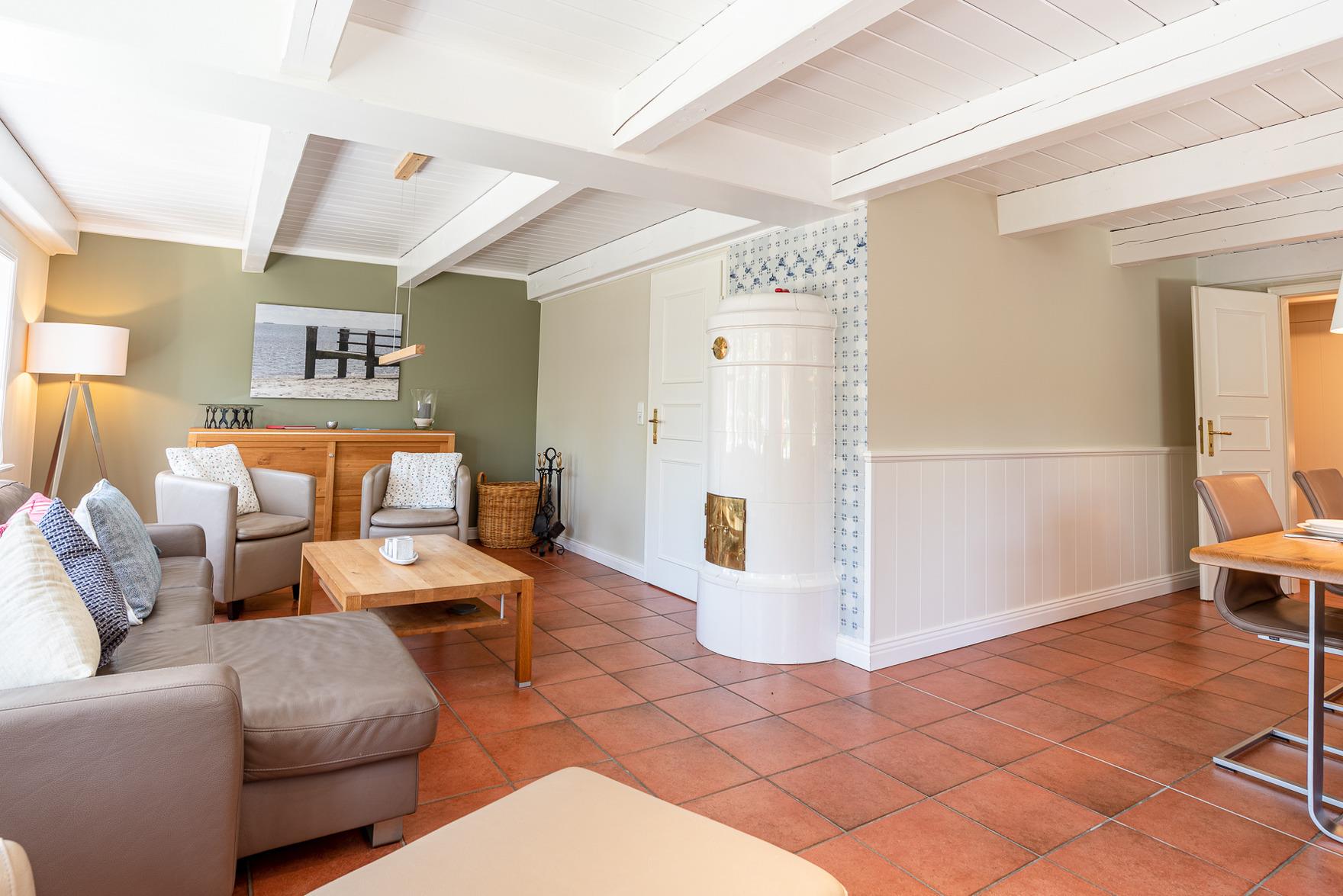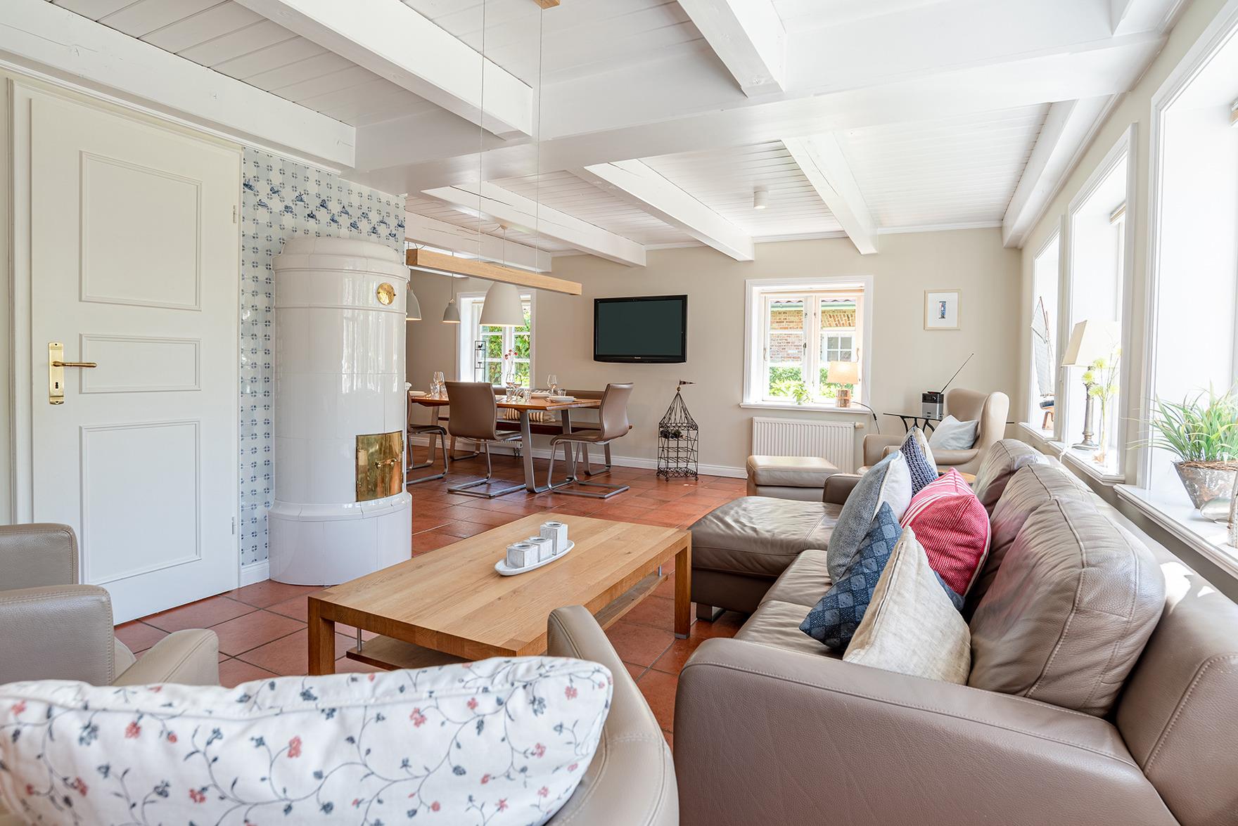 großes Wohn- und Esszimmer mit histor. Mylin-Kachelofen, großem Flat-TV, Musik-