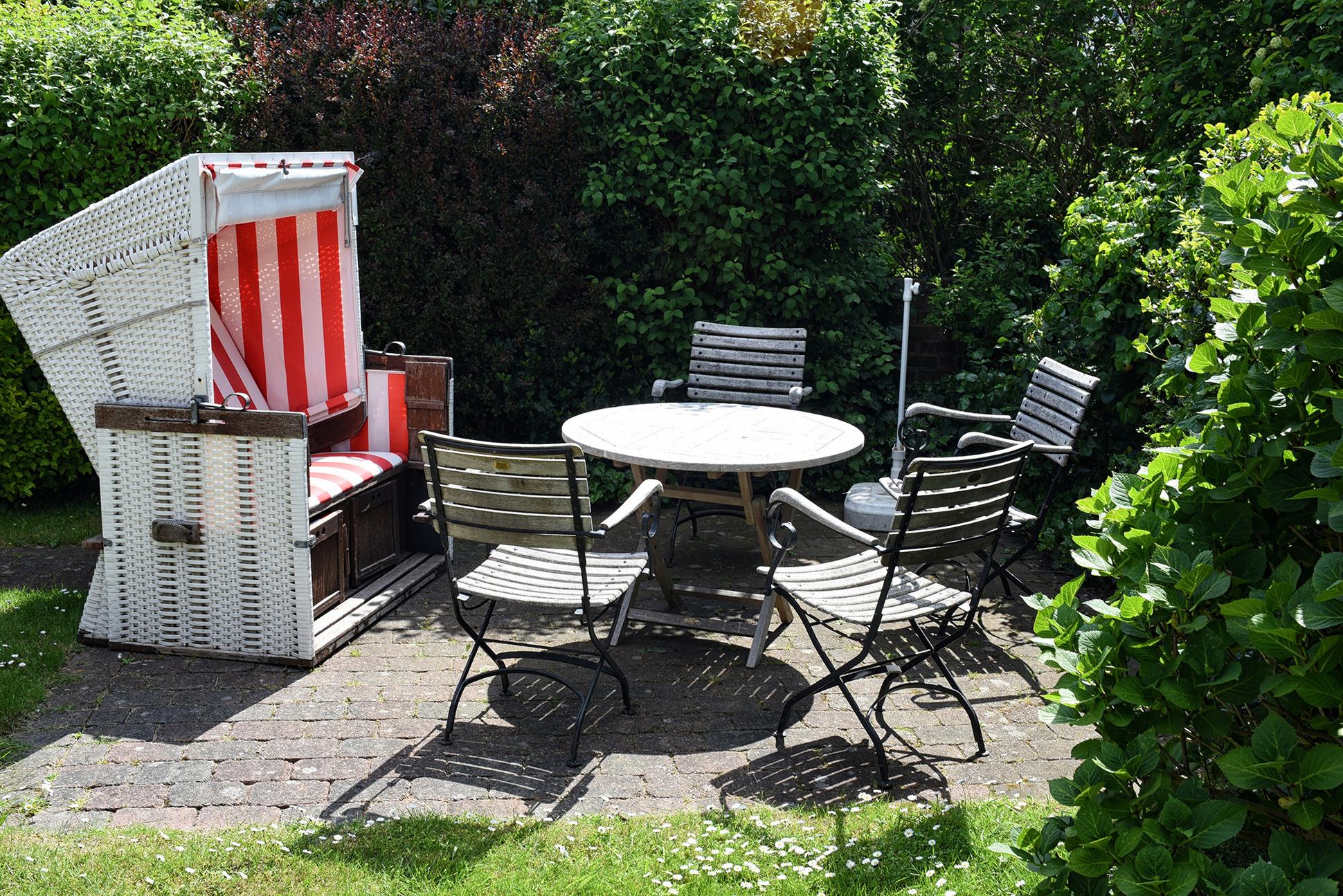mit Strandkorb und Gartenmöbeln.