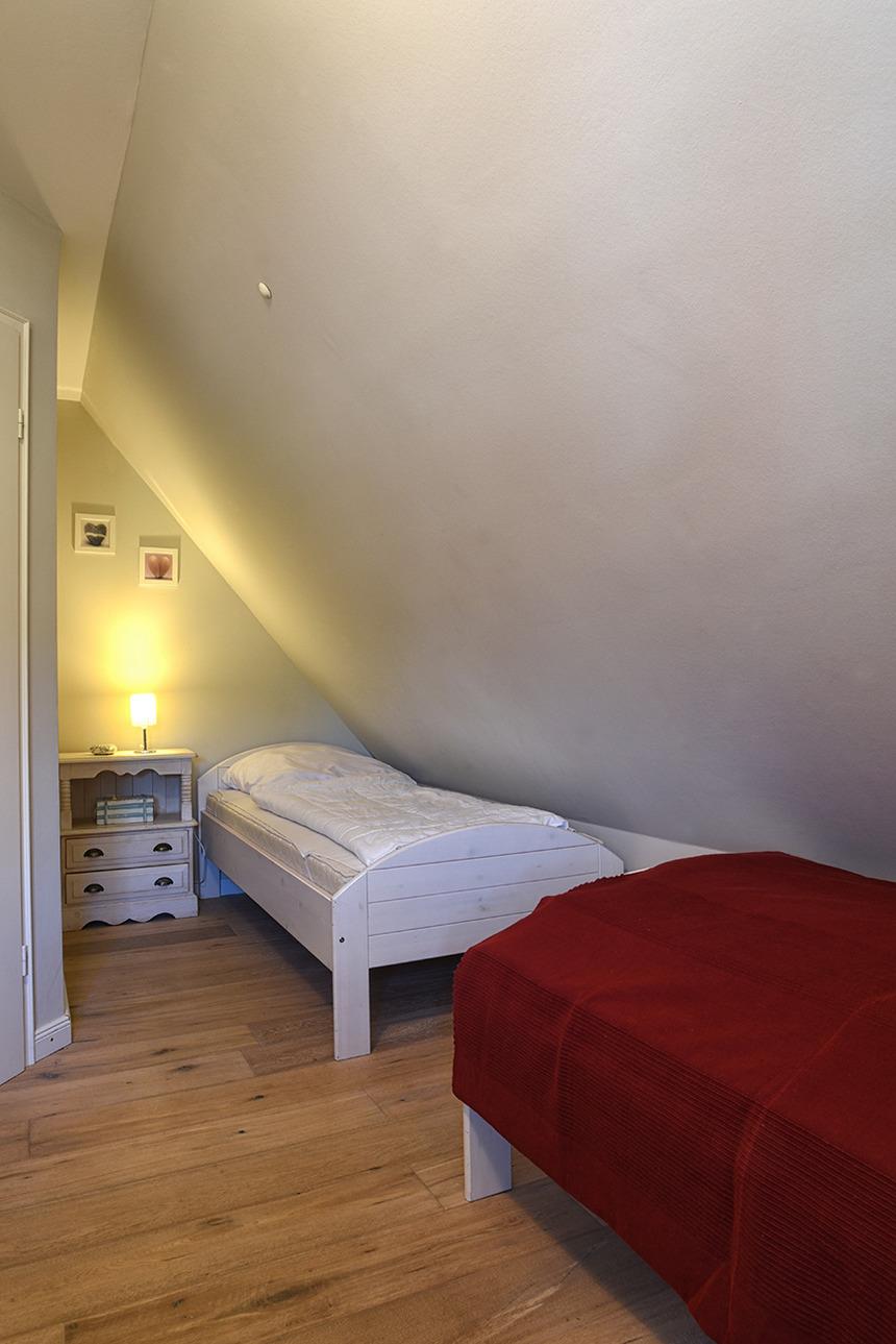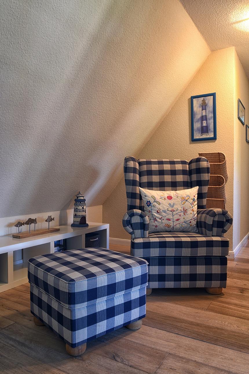 Dachgeschoss: Diele mit gemütlicher Leseecke, zwei Schlafzimmer jeweils mit Doppelbett, drittes Schlafzimmer mit zwei Einzelbetten, Wannenbad/WC.