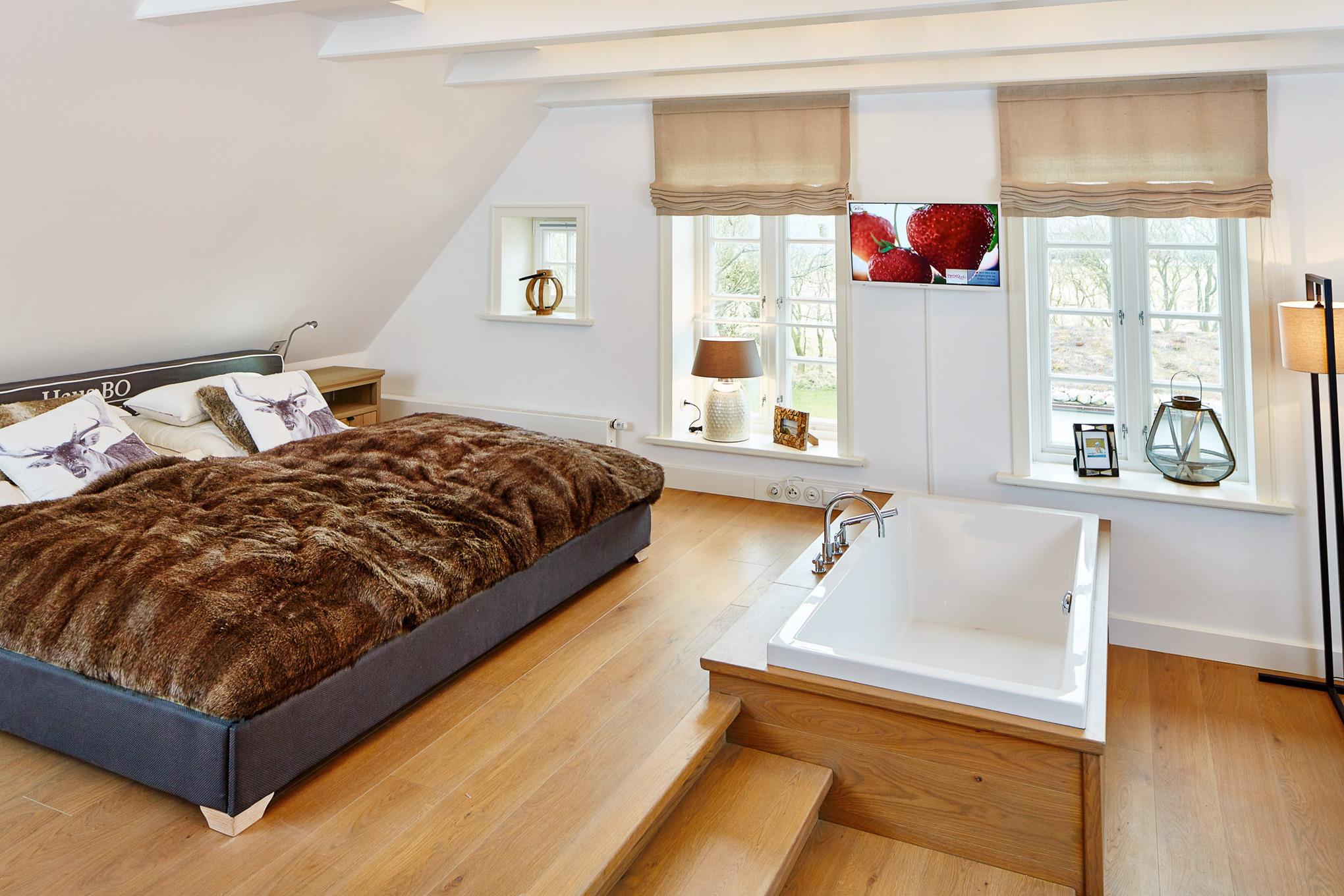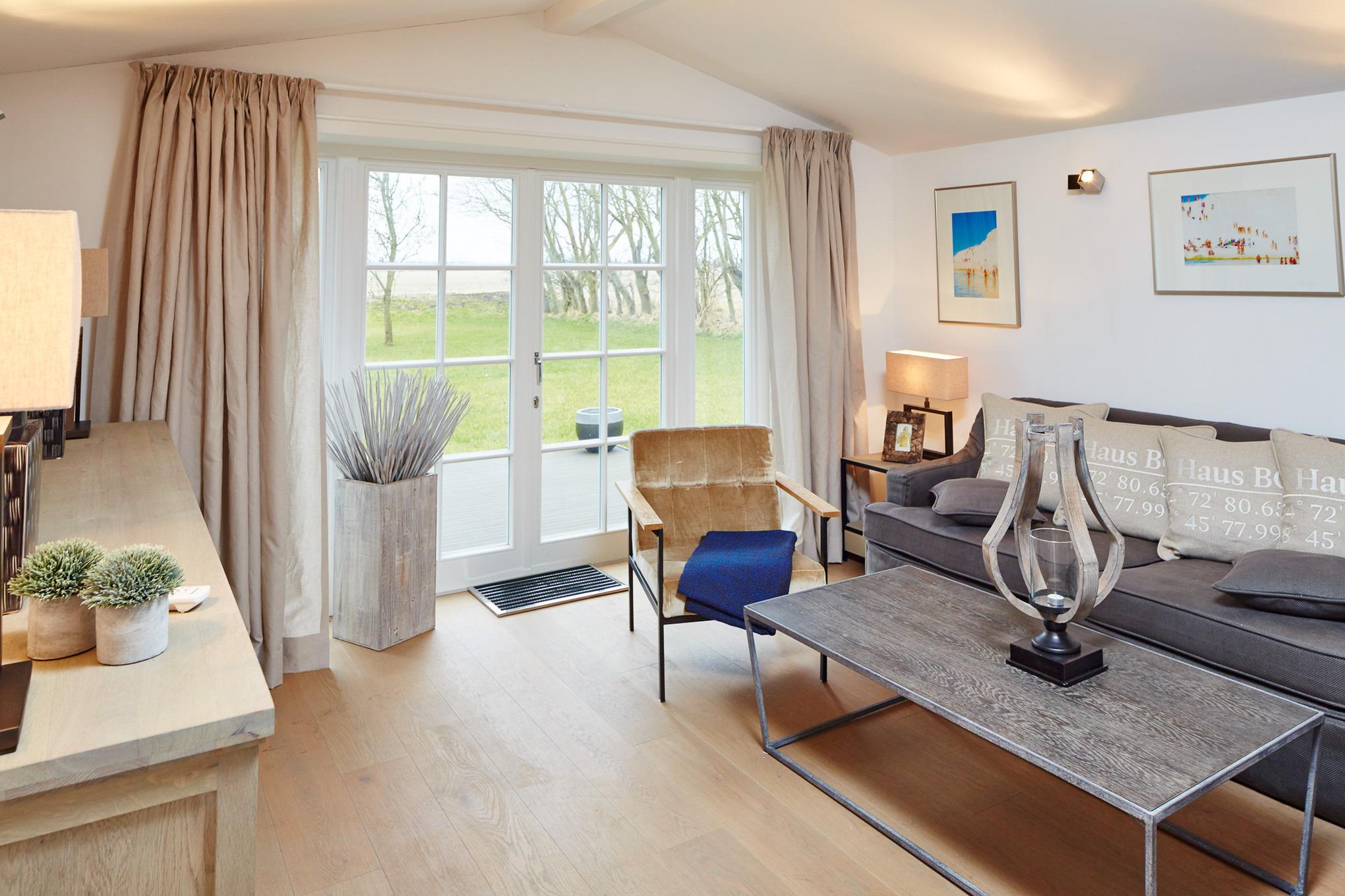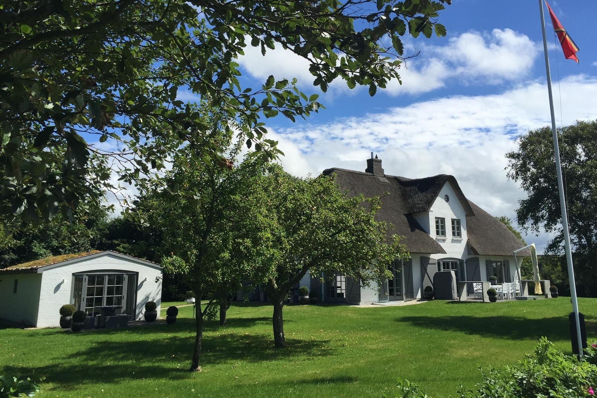 Mit viel Liebe zum Detail und in höchster Qualität ausgestattet, finden Sie in diesem Reetdachhaus Ruhe, Entspannung und Weitblick. Mitten in der Natur, umgeben von ländlichem Ambiente. Urlaub wie im eigenen Zuhause genießen - nach dieser Philosophie haben die Besitzer das Landhaus BO konzipiert und besonders anspruchsvoll ausgestattet. Ein charmantes Grundstück mit alten Obstbäumen und drei großzügigen Terrassenflächen laden zum Verweilen im Garten ein. In der kälteren Jahreszeit bieten die Sauna im separaten Sauna- und Gästehaus sowie ein Kamin im Haupthaus eine perfekte Gelegenheit für erholsame und gemütliche Stunden. Eine große und helle Bulthaup-Küche mit allen technischen Geräten lädt zum Kochen ein. Esszimmer und Wohnbereich gehen ineinander über und lassen den Blick zu auf die großen Terrassenflächen nach Süden und Westen. Die perfekten Voraussetzungen für einen fantastischen Urlaub im kleinen oder großen Kreis, denn dieses Haus bietet sogar Platz für zwei Familien. Der idyllische Ort Oldsum verfügt über einen eigenen kleinen Supermarkt und Bäcker und ist über die Grenzen Föhrs für seine Schönheit bekannt. Die Fähre sowie die weitläufigen Strände in Utersum, Nieblum und den Südstrand in Wyk erreichen Sie in nur 10 Minuten mit dem Auto