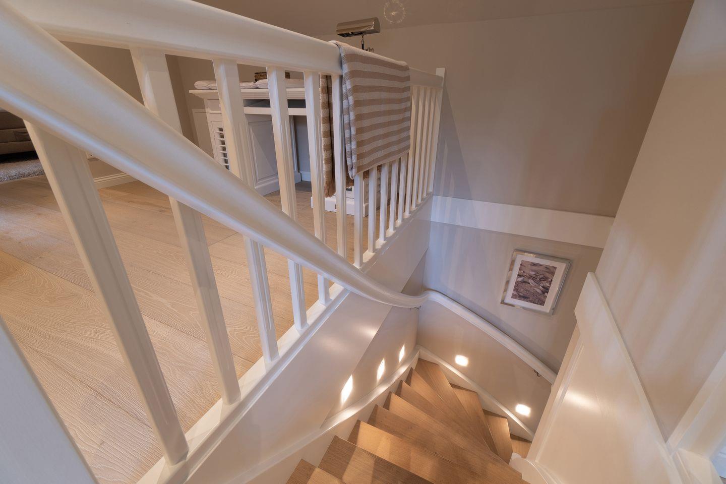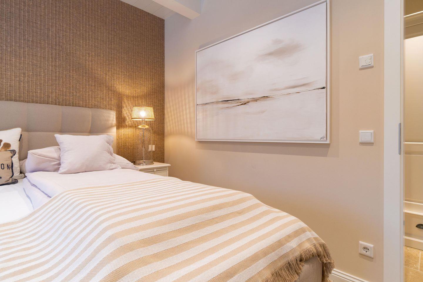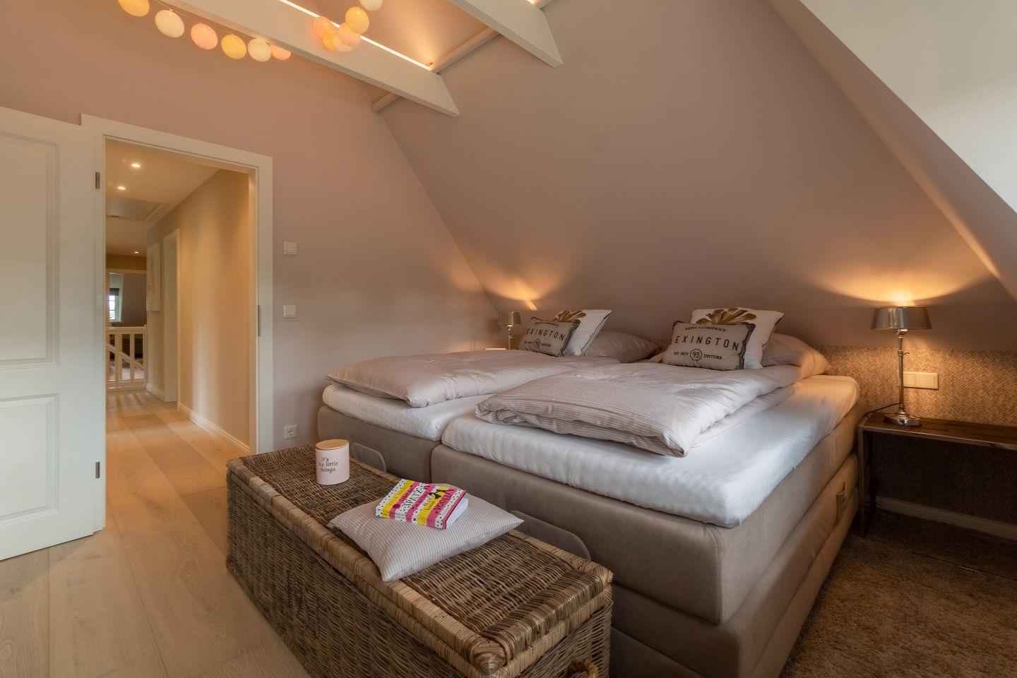 Im Obergeschoss befinden sich die beiden weiteren Schlafzimmer, zwei Bäder mit bodengleicher Dusche und der Ruheraum samt hauseigener Sauna. Sämtliche Betten verfügen über einen elektrisch verstellbaren Motorrahmen.