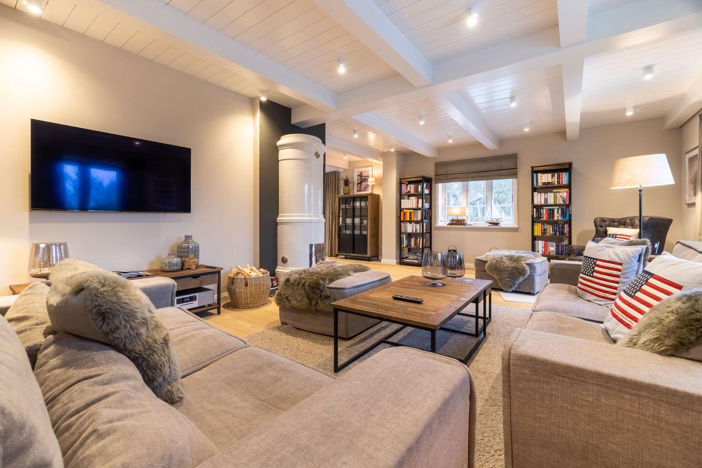 In allen Schlafräumen sowie im Wohnbereich befinden sich Smart-TVs mit Aufnahmefunktion zum zeitversetzten Fernsehen. In allen Bädern sowie im Wohnbereich stehen Sonoro Musikanlagen mit CD-Player, UKW-, DAB- und Internetradio bereit. Bei allen Betten im Haus handelt es sich um sehr wertige Boxspringbetten, welche über elektrische Motorrahmen verfügen. Die Bettwäsche und Handtücher stammen allesamt von Lexington.