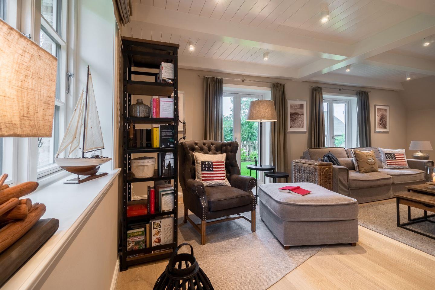 Im Erdgeschoss befinden sich der großzügige Wohn- und Essbereich mit offener Küche, eines der drei Schlafzimmer, ein Bad mit bodengleicher Dusche und ein Hauswirtschaftsraum. Der offene Wohn-, Ess- und Küchenbereich bildet das Herzstück des Hauses. Der Original Mylin-Kachelofen sorgt auch an kühleren Tagen für eine wohlige Atmosphäre - und an warmen Tagen ist er ein echter Hingucker! Die Küchenausstattung ist besonders vielfältig und gut. Neben der Kitchenaid mit reichlich Zubehör, einer Nespresso-Kaffeemaschine und Milchaufschäumer zählen wir den englischen Falcon Herd mit verschiedenen Ofen- und Backfunktionen sowie mit Induktionskochfeldern zu den Highlights des Ferienhauses Eva-Marie. Über den Essbereich gelangen Sie auf die Terrasse und in den Garten.