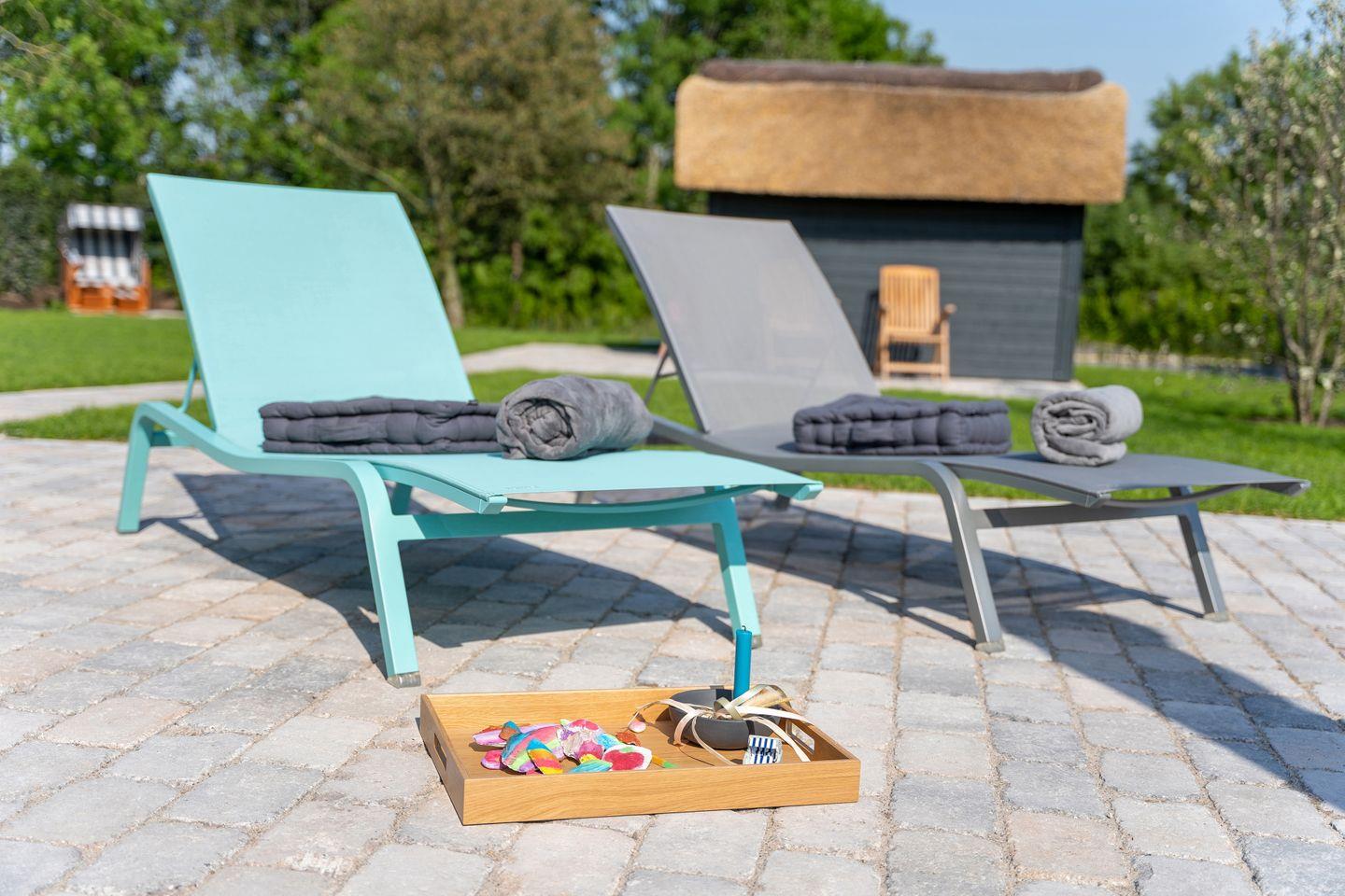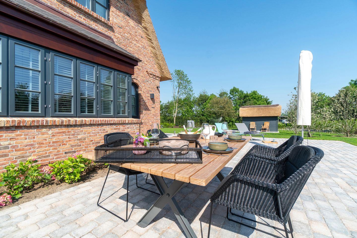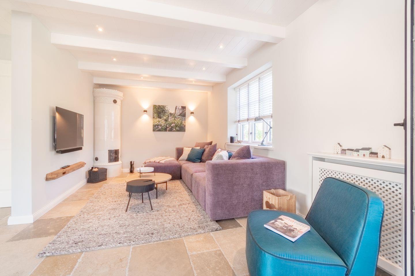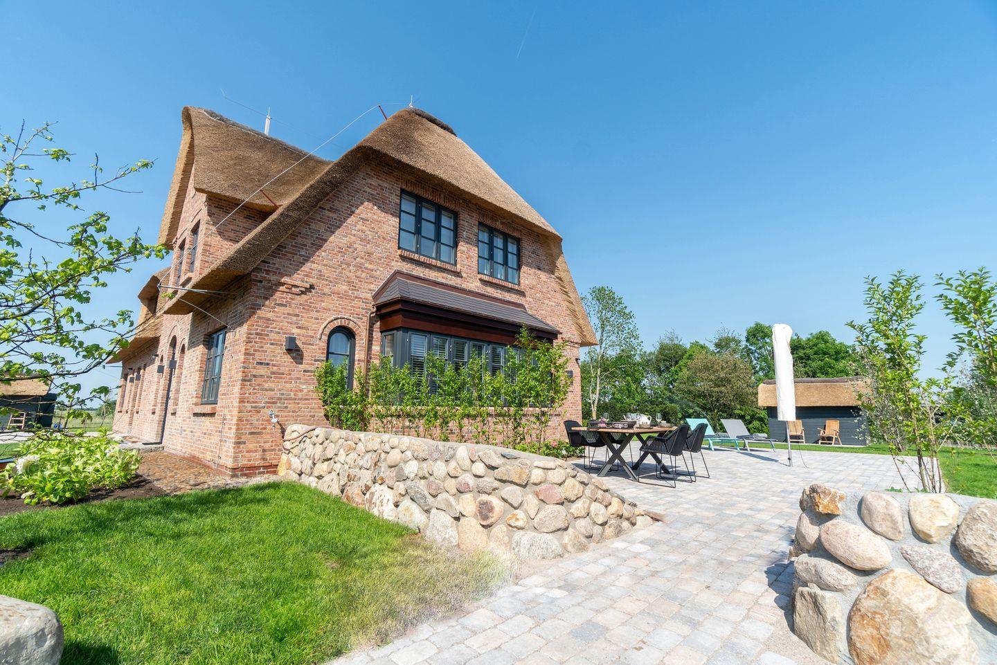 Hochwertig ausgestattete Doppelhaushälfte unter Reet mit Sauna, Kachelofen und Garten mit drei Terrassen.