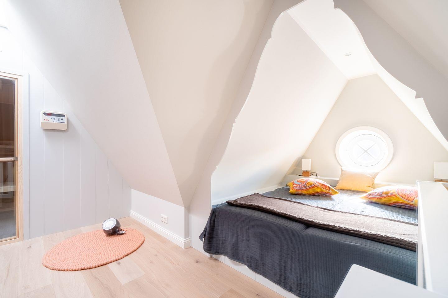 Im Spitzboden befindet sich eine Sauna mit kuscheliger Ruhezone mit Alkoventagesbett.