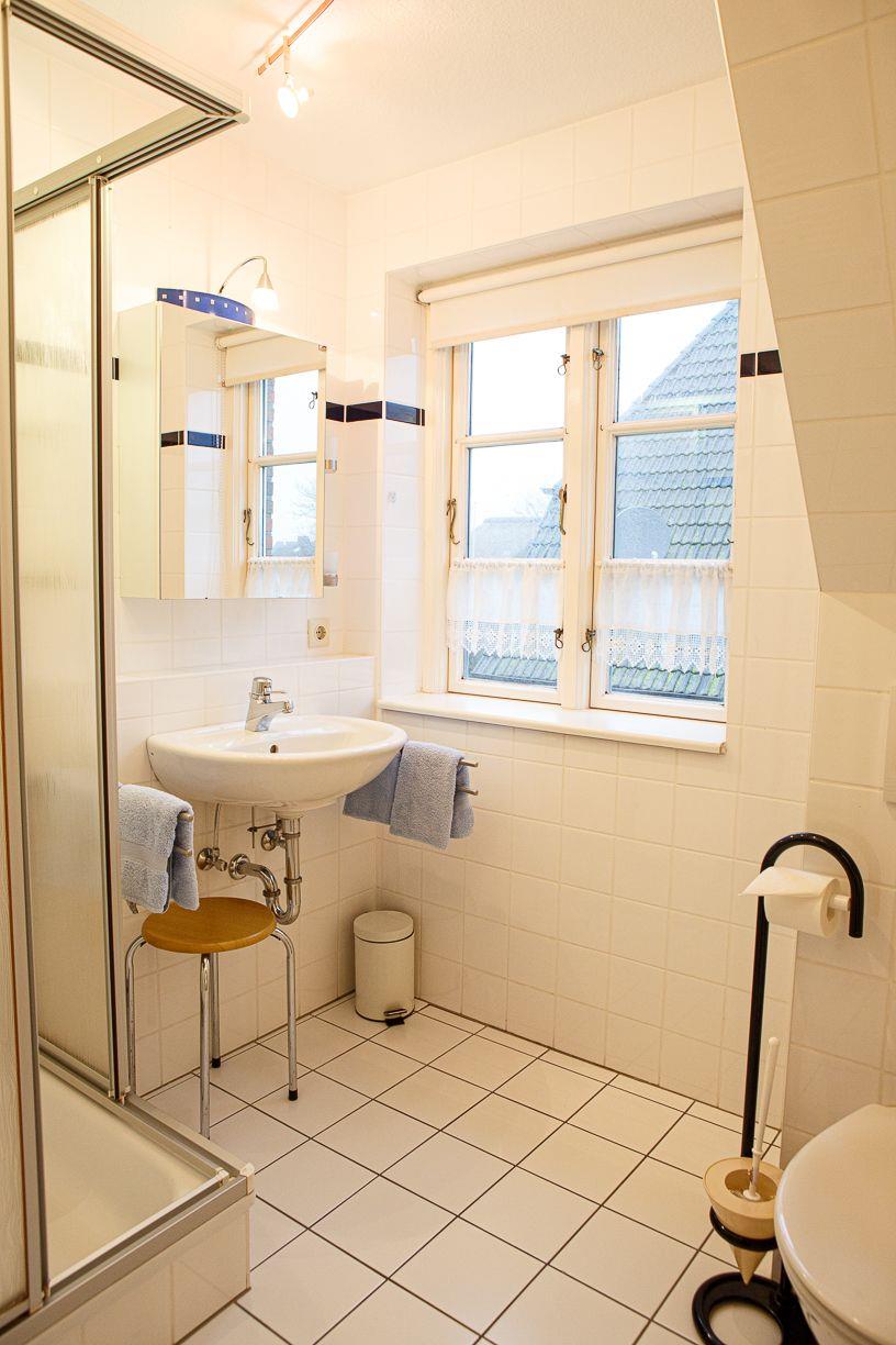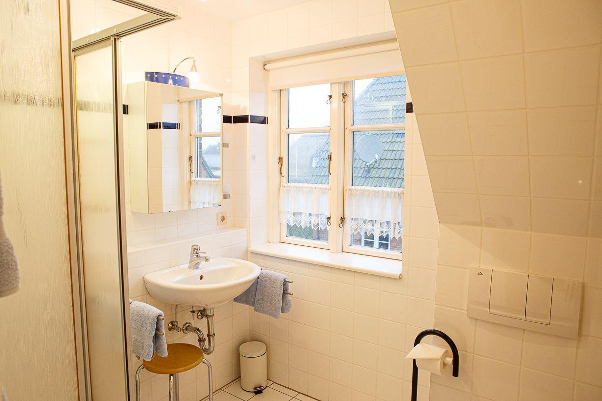 Das Friesennest ist eine freistehende, 90 m² große Nichtraucher-Unterkunft im 1. Stock mit 4 Zimmern, 3 Schlafzimmern, 2 Bädern plus Gäste-WC – ideal für bis zu 4 Personen. Offene Küche zum Wohnzimmer mit Cerankochfeld, Backofen und Spülmaschine, WLAN/Internet, 3 TVs sowie Waschmaschine. Terrasse mit Gartenblick, Strandkorb und Gartenmöbeln, Privatparkplatz. Einkauf 150 m, Strand/Meer ca. 2 km; Auto empfohlen, Haustiere erlaubt.