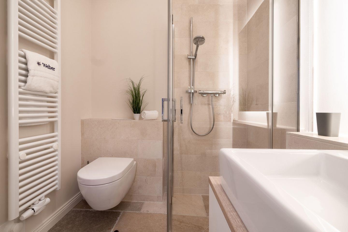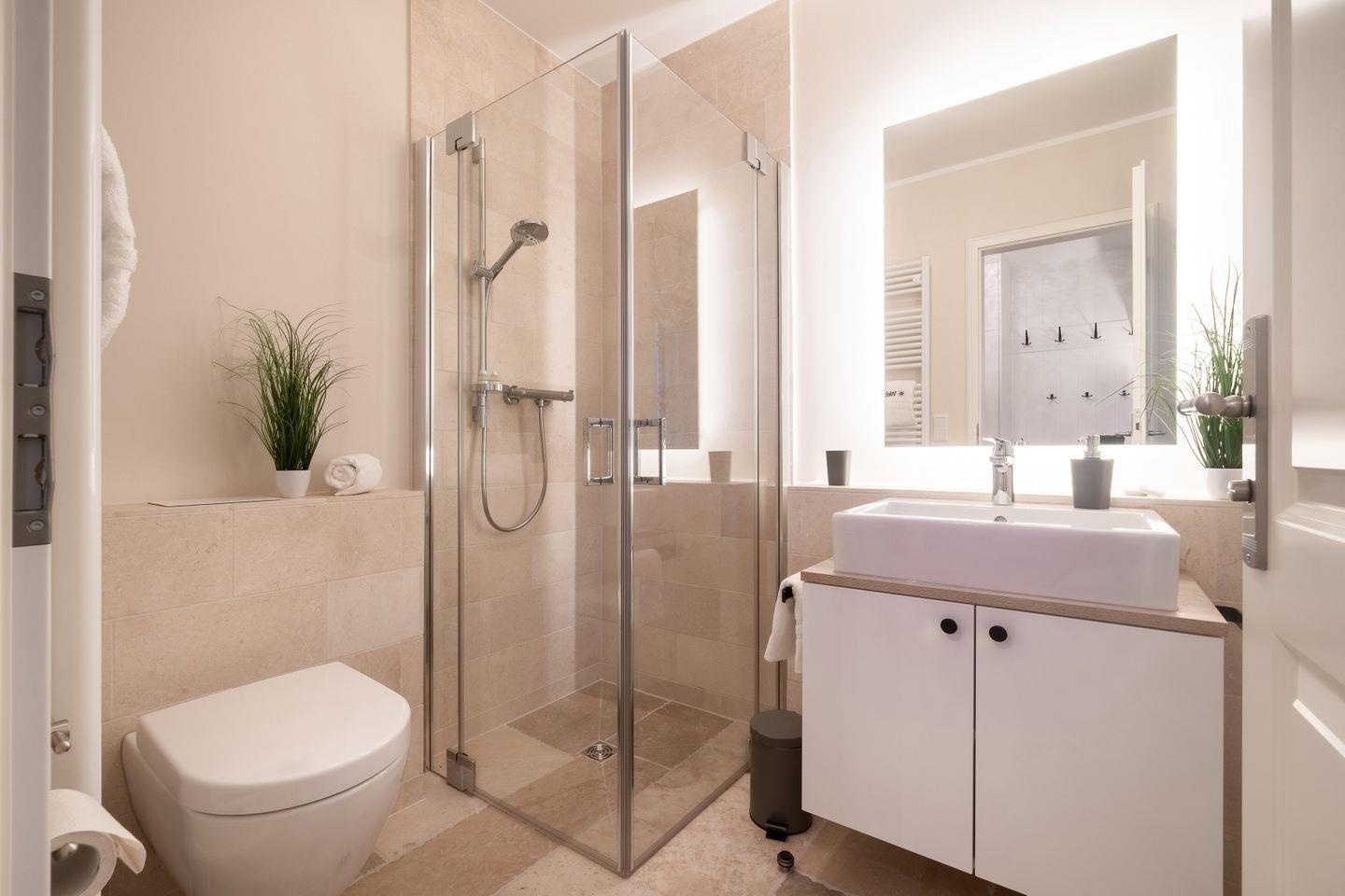 Im Erdgeschoss befinden sich der großzügige Wohn- und Essbereich mit offener Küche, sowie ein Bad mit bodengleicher Dusche. Über den Wohnbereich gelangen Sie auf die eigene Terrasse und in den Garten. Der Kaminofen sorgt an kühleren Tagen für eine angenehme Atmosphäre. Die hochwertig ausgestattete Küche wird das Herz eines jeden Hobbykochs höher schlagen lassen.