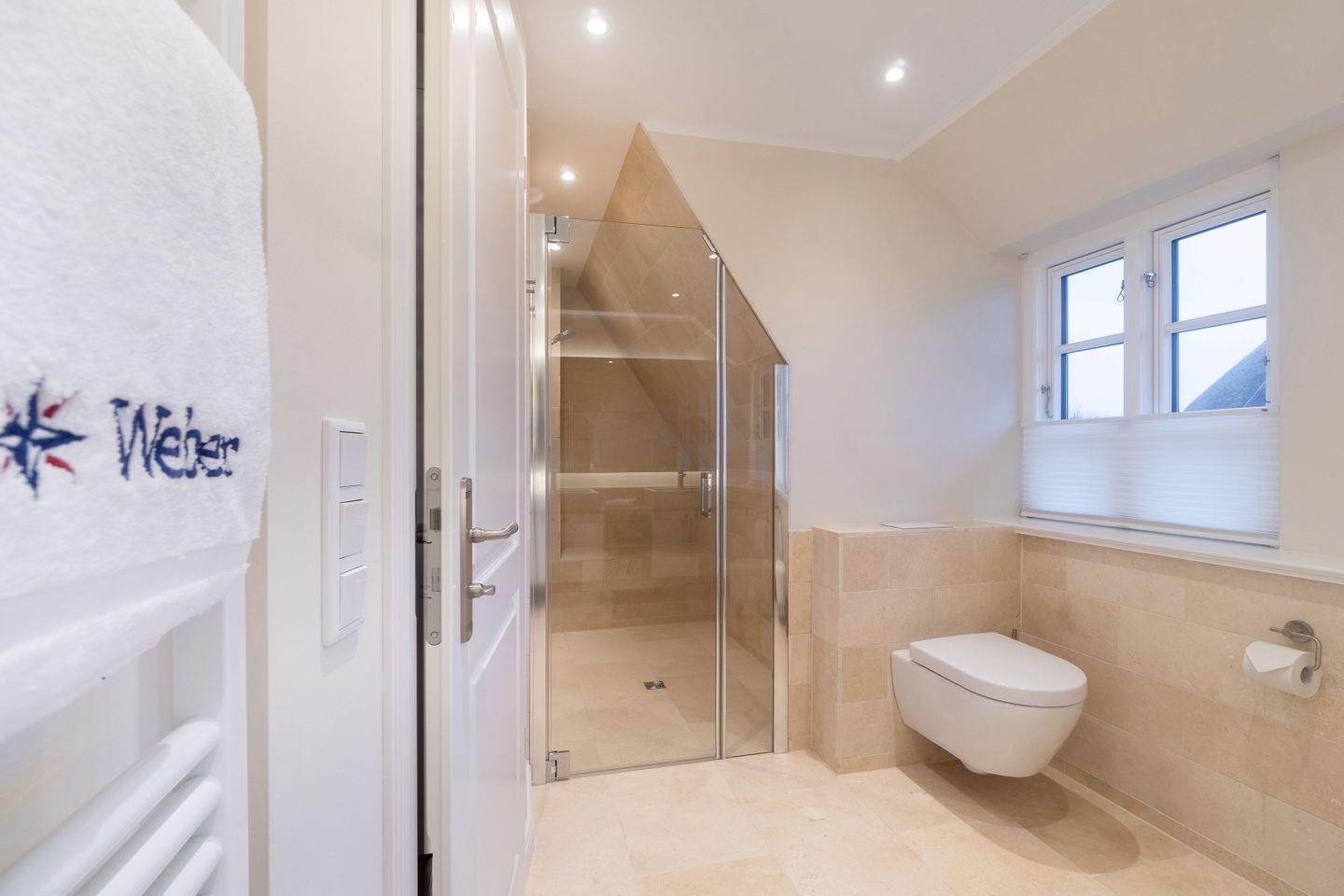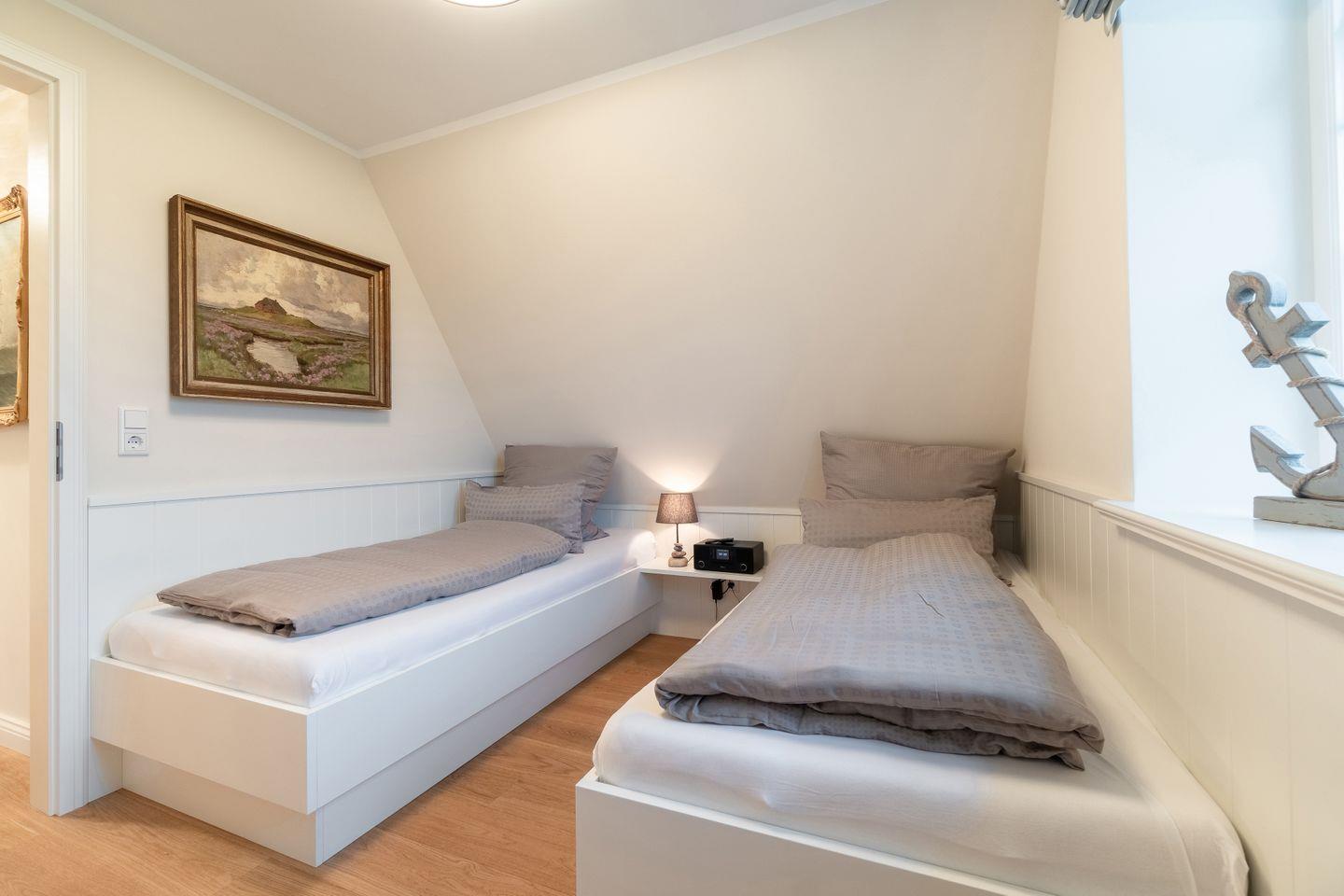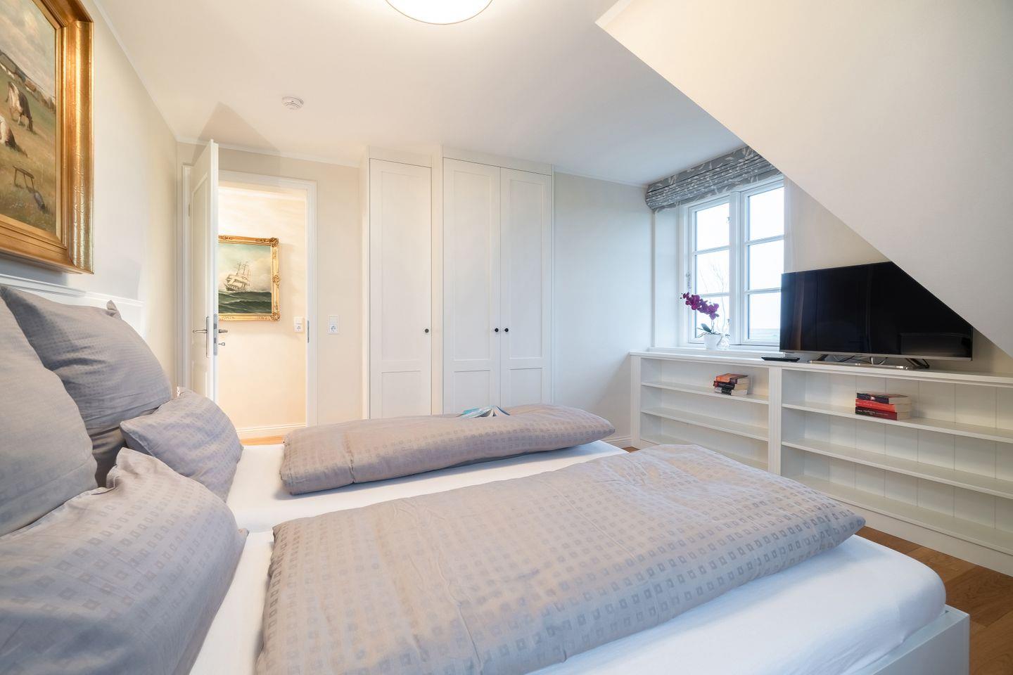 Im Obergeschoss befinden sich die drei Schlafzimmer - zwei mit jeweils einem Doppelbett und eines mit zwei Einzelbetten - sowie das zweite Duschbad. Alle Schlafzimmer sind mit einem Smart-TV ausgestattet.