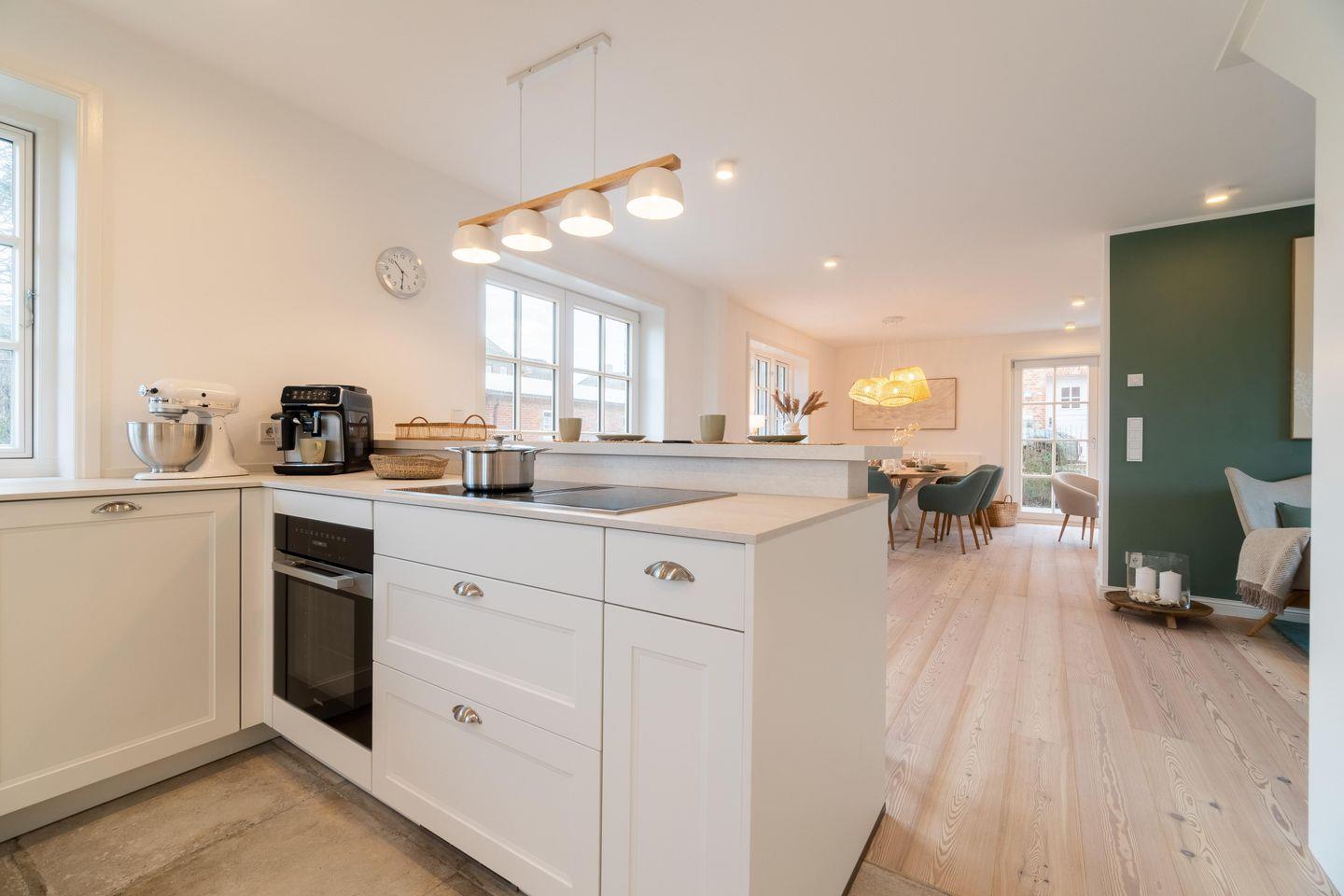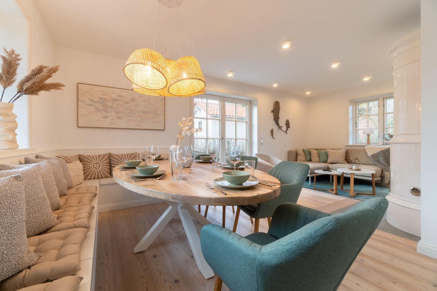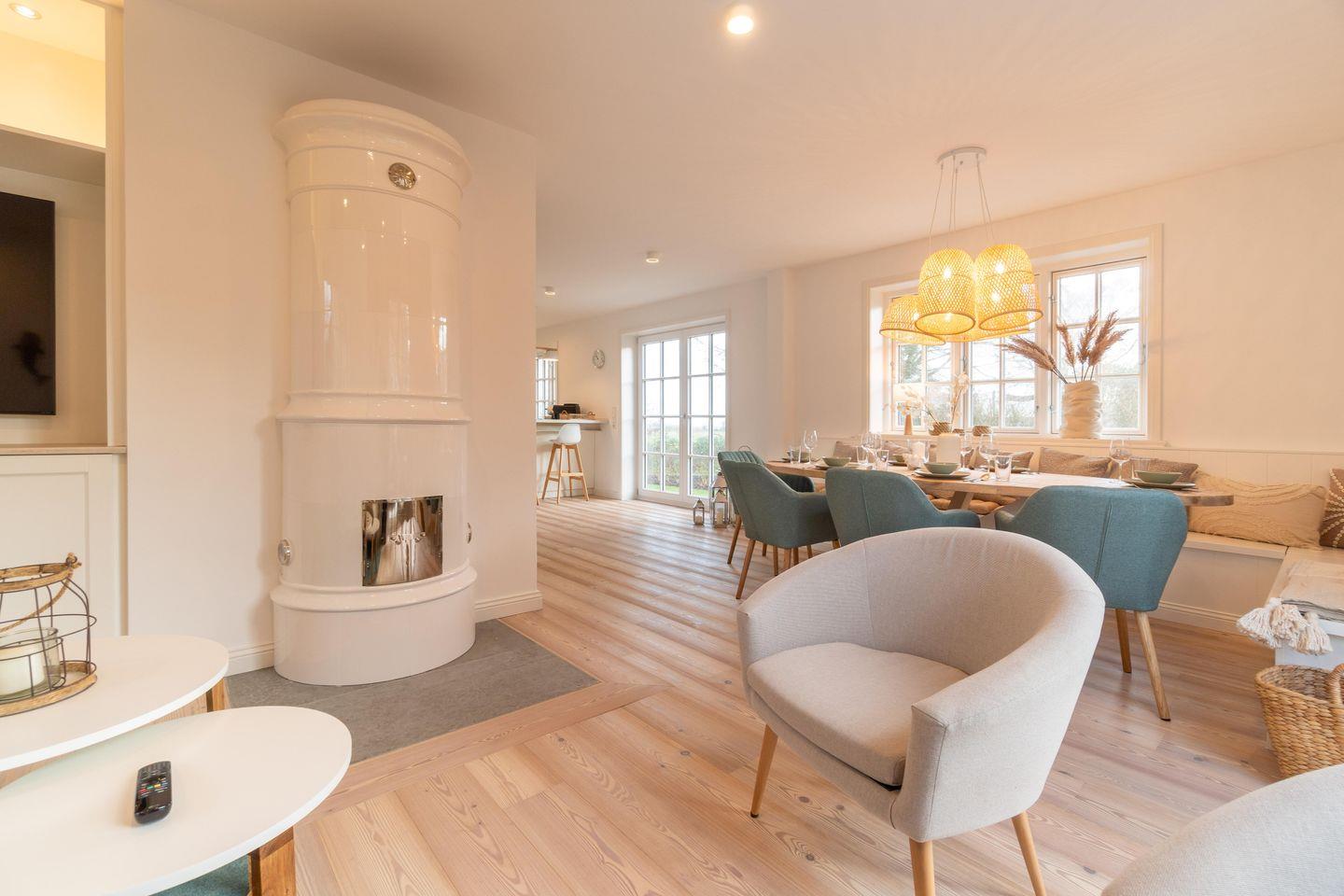 Im Erdgeschoss befinden sich der großzügige Wohn- und Essbereich mit offener Küche, ein Gäste-WC sowie ein Hauswirtschaftsraum mit Waschmaschine und Trockner. An kühleren Abenden sorgt der Original Mylin-Kachelofen für eine angenehme Atmosphäre.