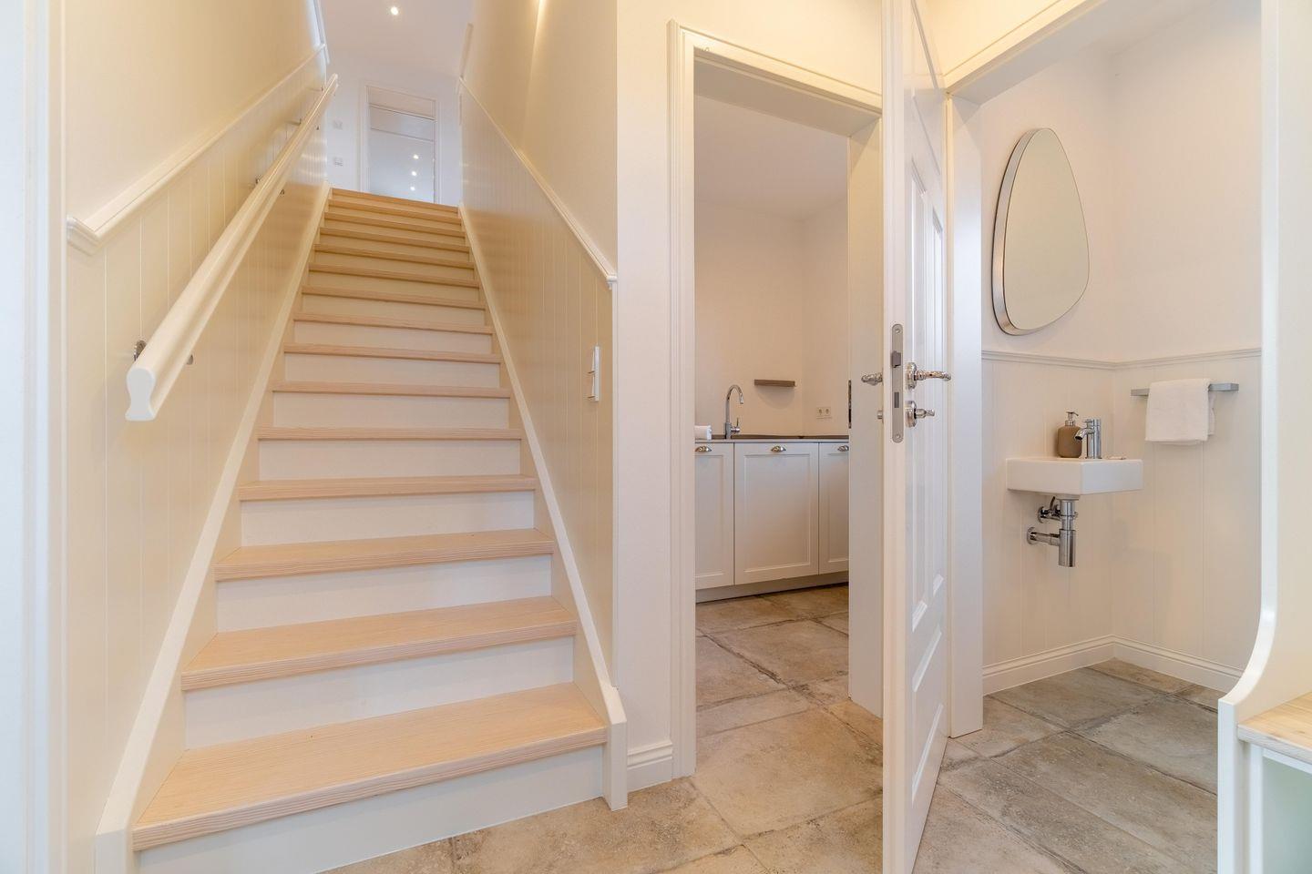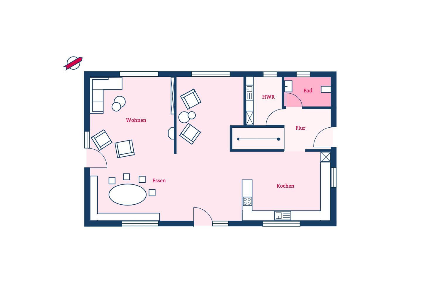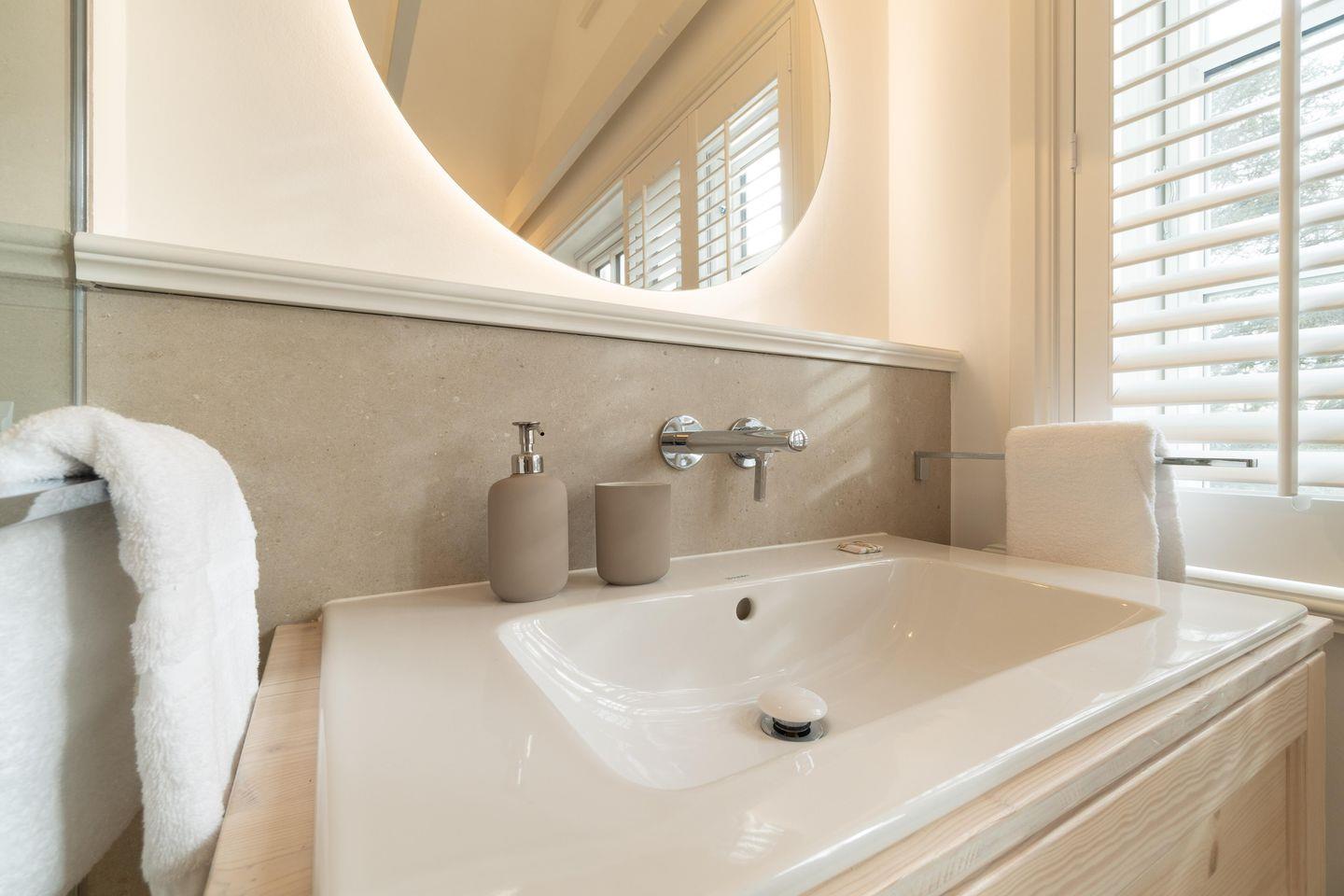Im Erdgeschoss befinden sich der großzügige Wohn- und Essbereich mit offener Küche, ein Gäste-WC sowie ein Hauswirtschaftsraum mit Waschmaschine und Trockner. An kühleren Abenden sorgt der Original Mylin-Kachelofen für eine angenehme Atmosphäre.