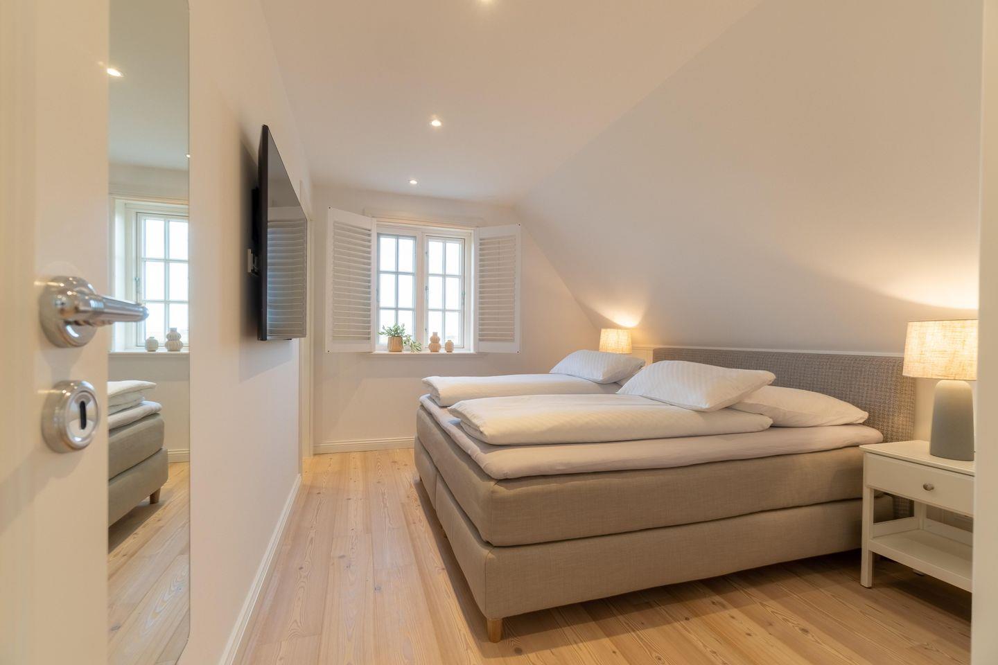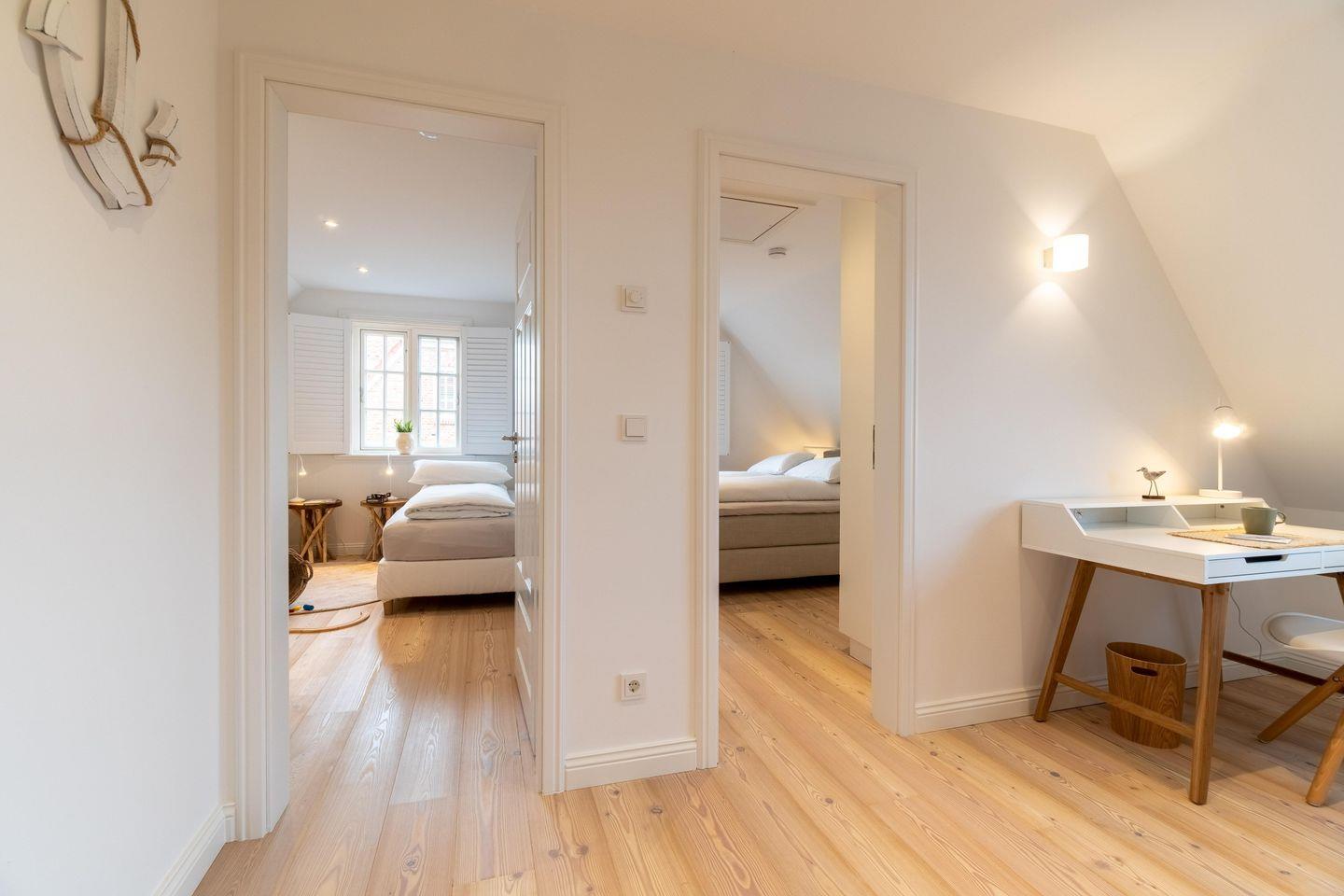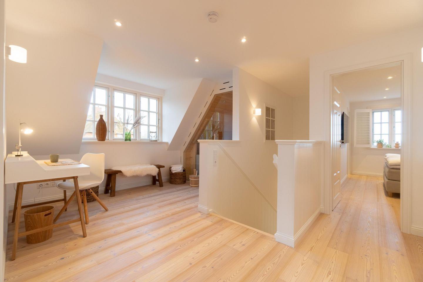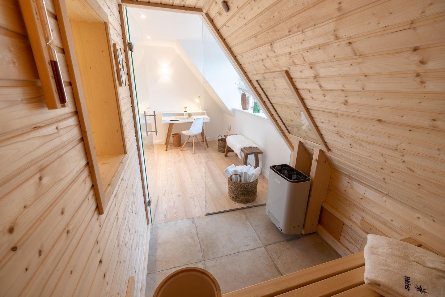 Im Obergeschoss befinden sich die drei Schlafzimmer - zwei mit jeweils einem Doppelbett und eines mit zwei Einzelbetten - ein Duschbad sowie die hauseigene Sauna. Eines der Doppelbettzimmer verfügt zusätzlich über ein Duschbad en Suite.