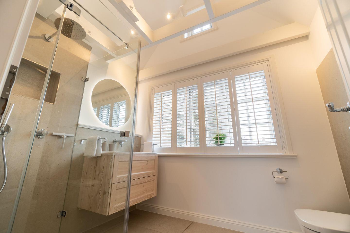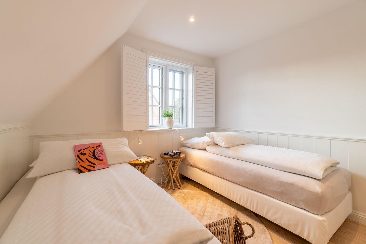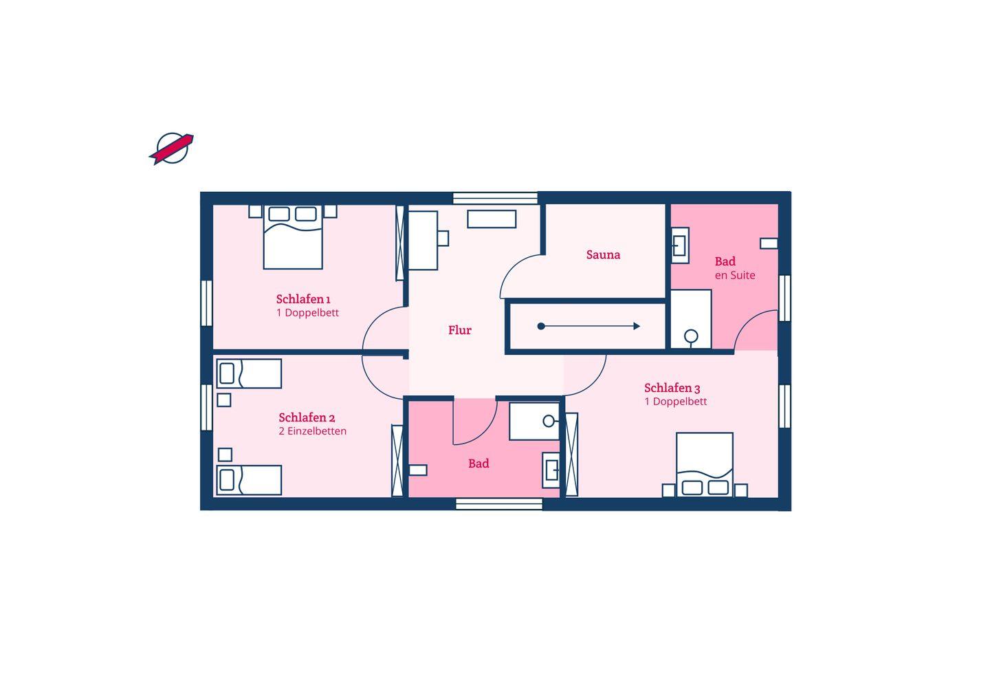 Im Obergeschoss befinden sich die drei Schlafzimmer - zwei mit jeweils einem Doppelbett und eines mit zwei Einzelbetten - ein Duschbad sowie die hauseigene Sauna. Eines der Doppelbettzimmer verfügt zusätzlich über ein Duschbad en Suite.