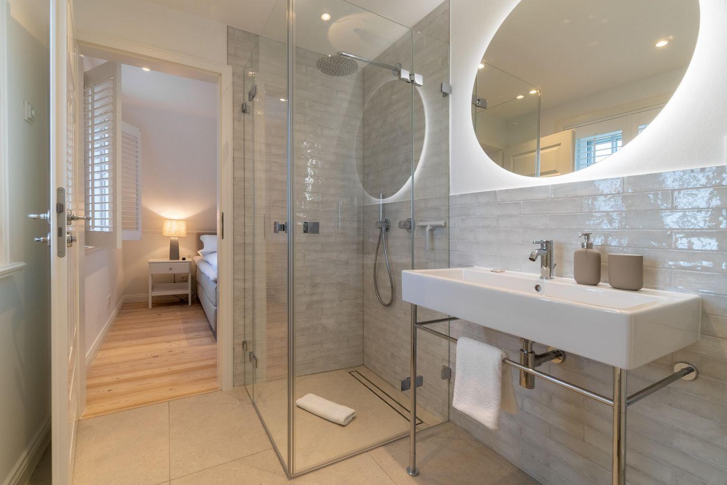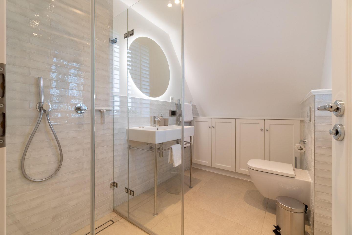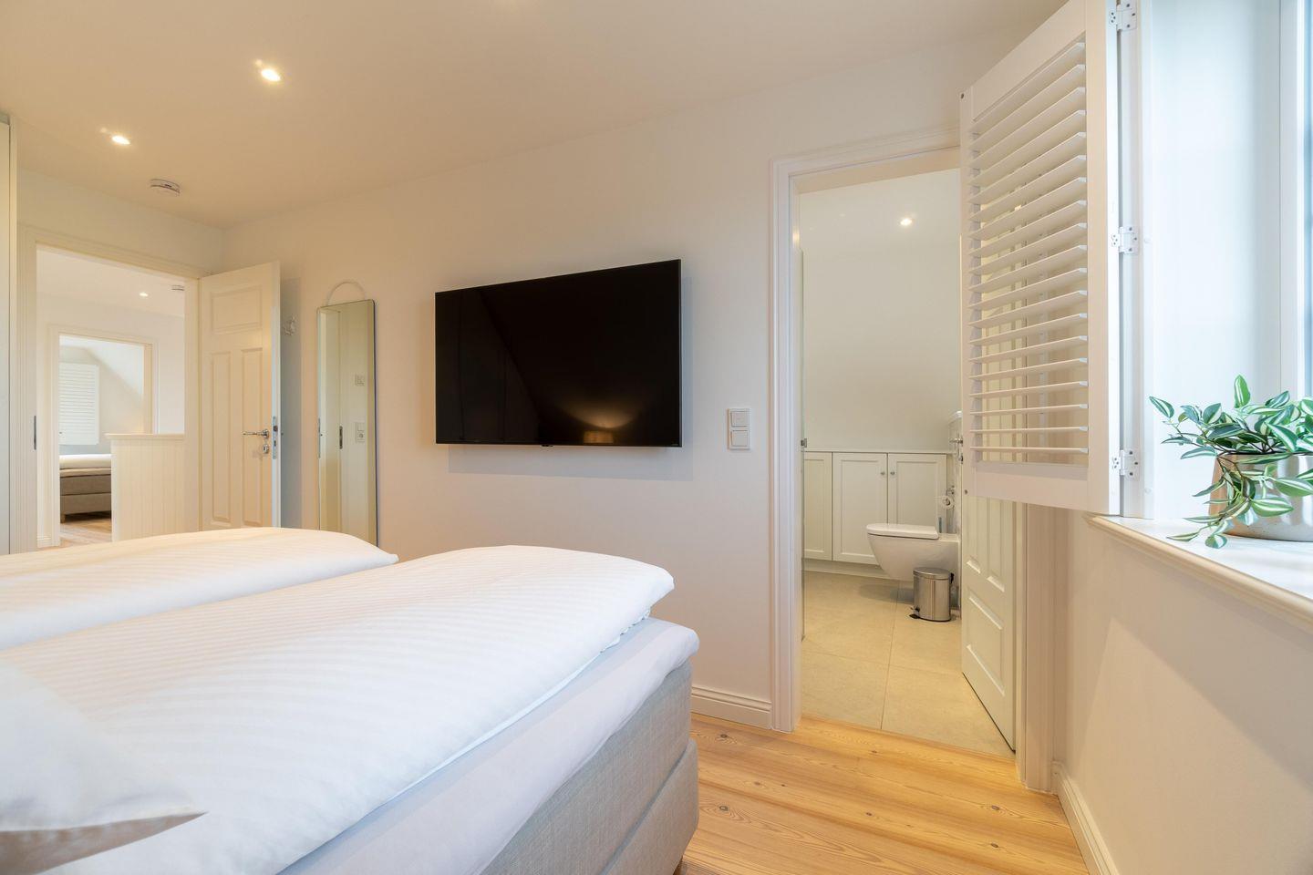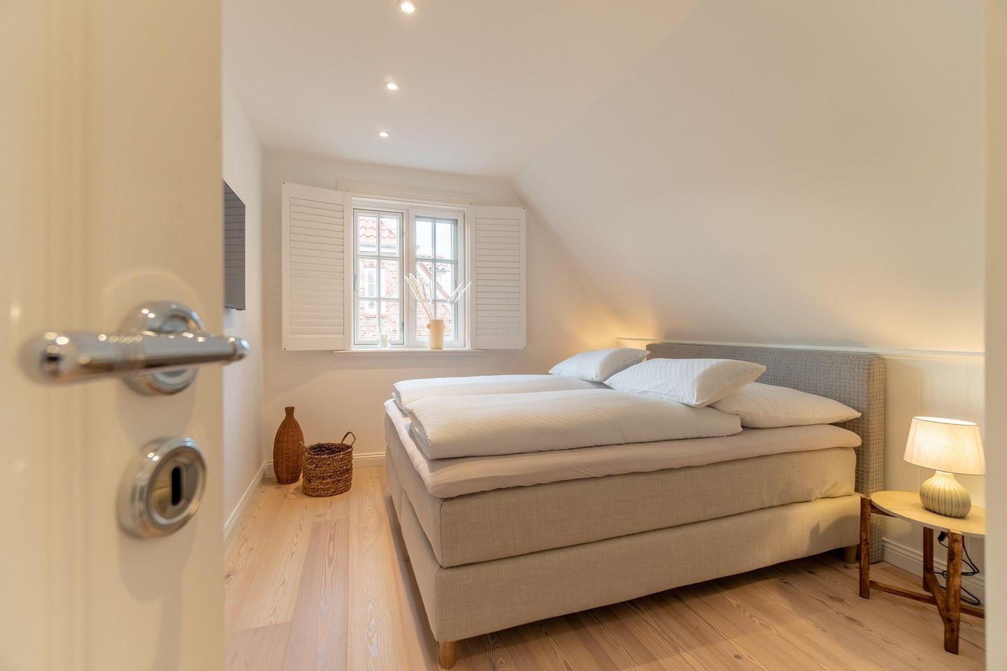 Im Obergeschoss befinden sich die drei Schlafzimmer - zwei mit jeweils einem Doppelbett und eines mit zwei Einzelbetten - ein Duschbad sowie die hauseigene Sauna. Eines der Doppelbettzimmer verfügt zusätzlich über ein Duschbad en Suite.