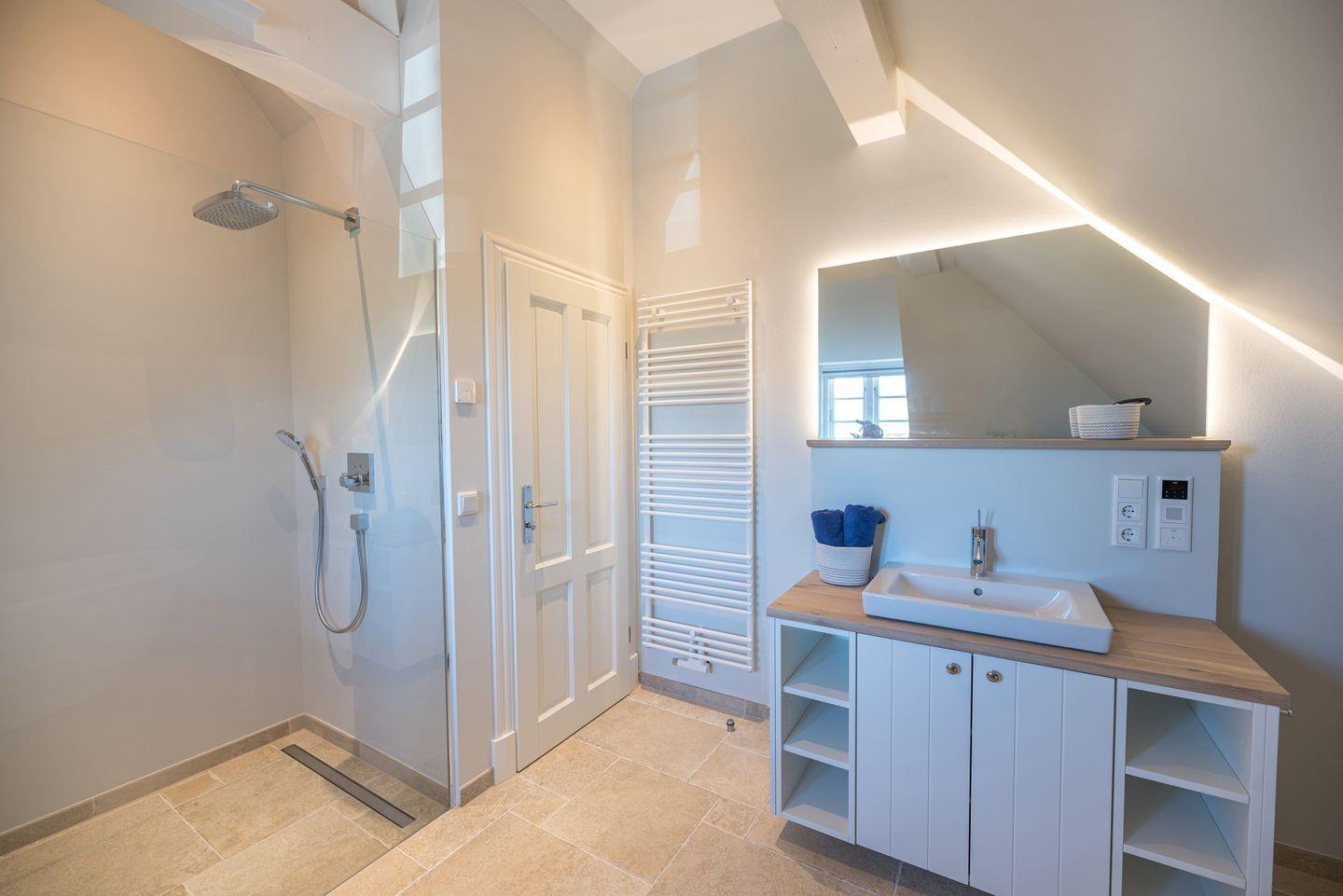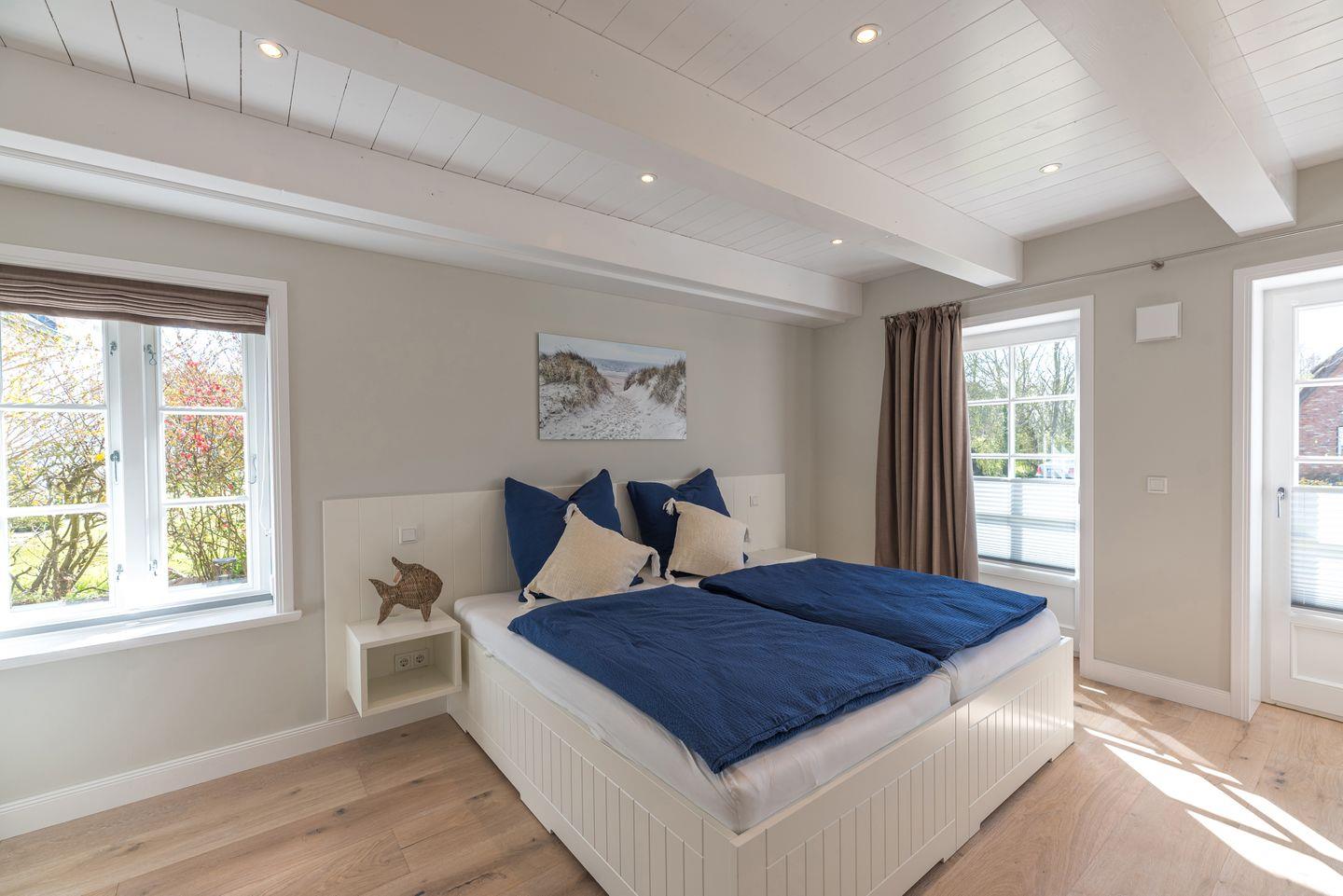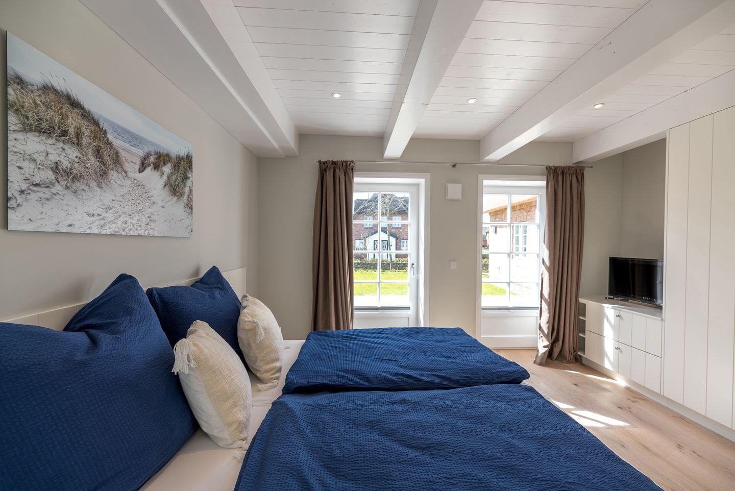 Im Obergeschoss sind zwei weitere Schlafzimmer - jeweils mit einem Doppelbett und einem Smart-TV ausgestattet - und das zweite Duschbad, ein Vollbad gelegen. Alle Bäder im Ferienhaus verfügen über eine Regen-Dusche.