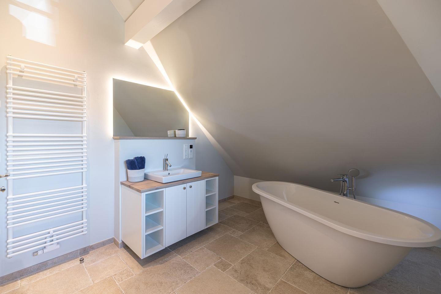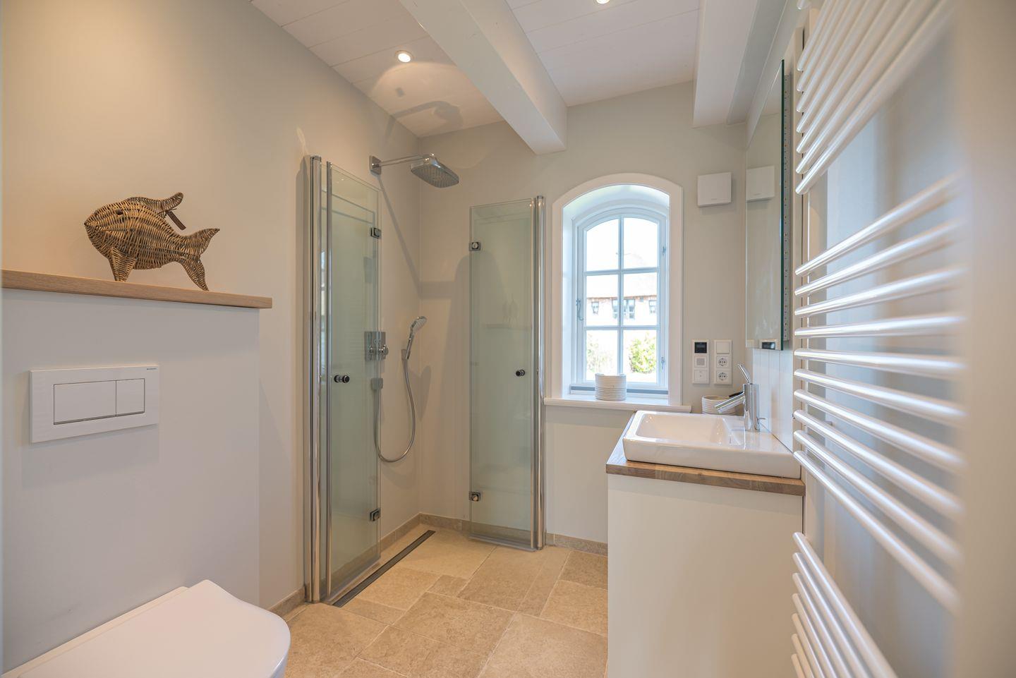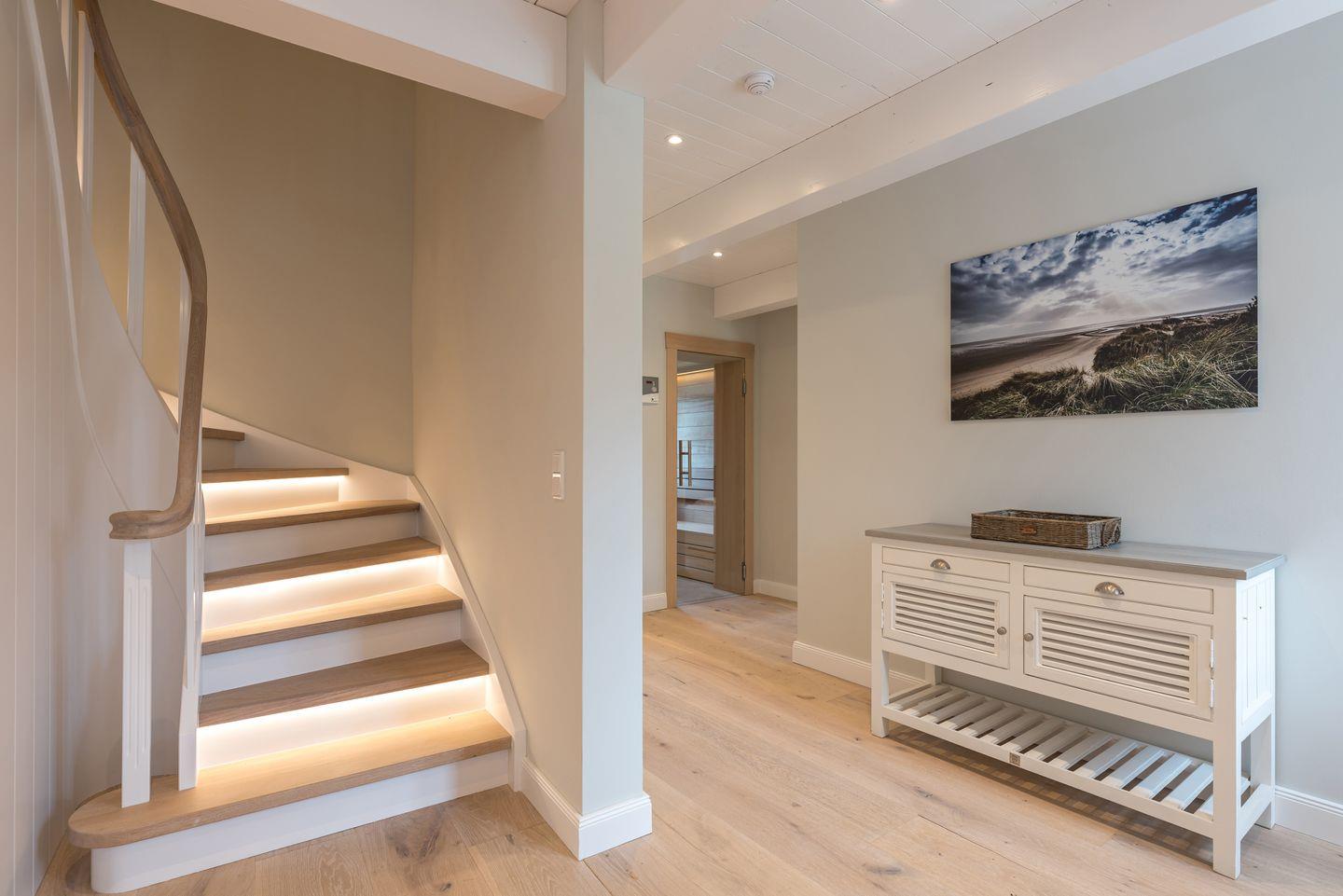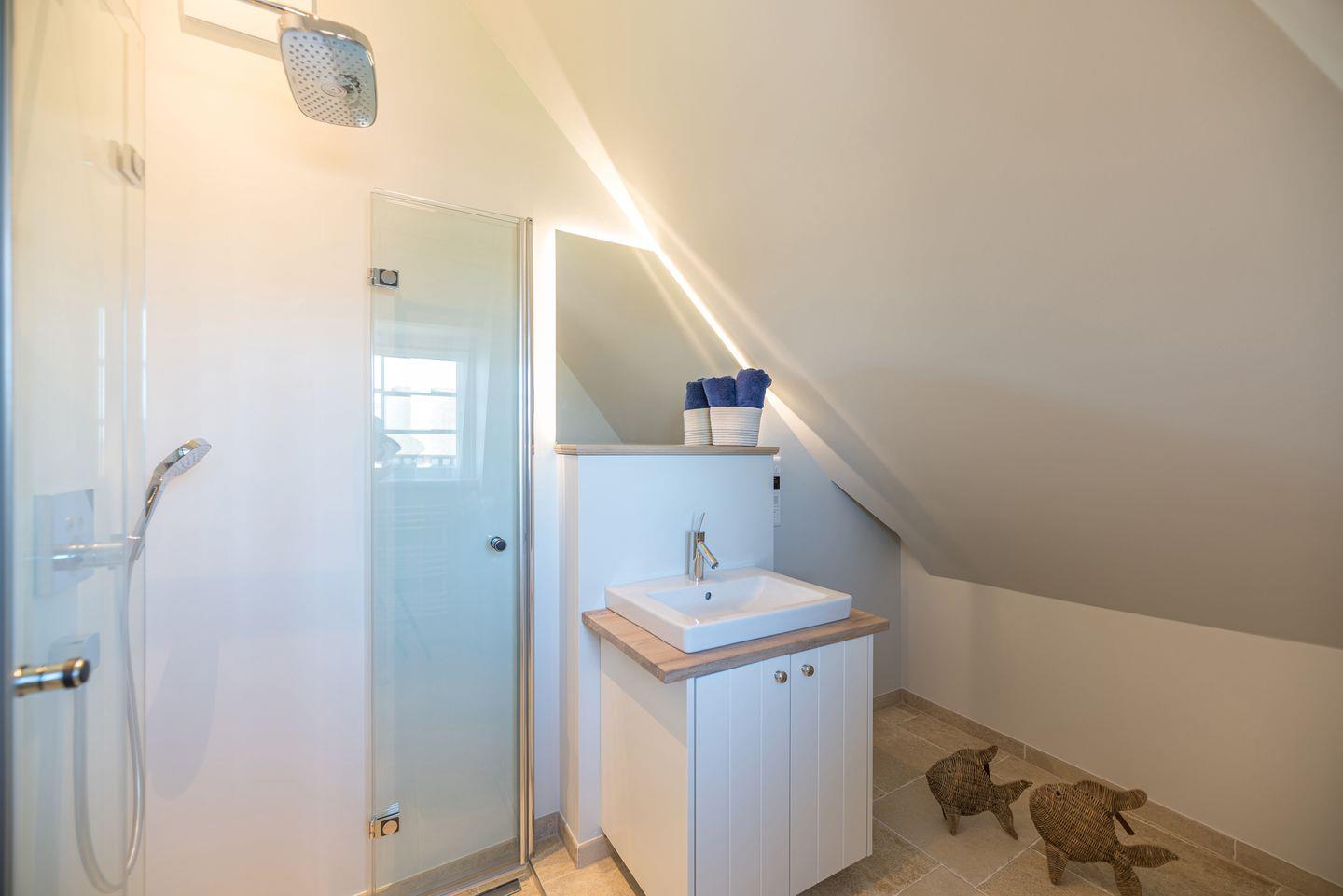 Im Obergeschoss sind zwei weitere Schlafzimmer - jeweils mit einem Doppelbett und einem Smart-TV ausgestattet - und das zweite Duschbad, ein Vollbad gelegen. Alle Bäder im Ferienhaus verfügen über eine Regen-Dusche.