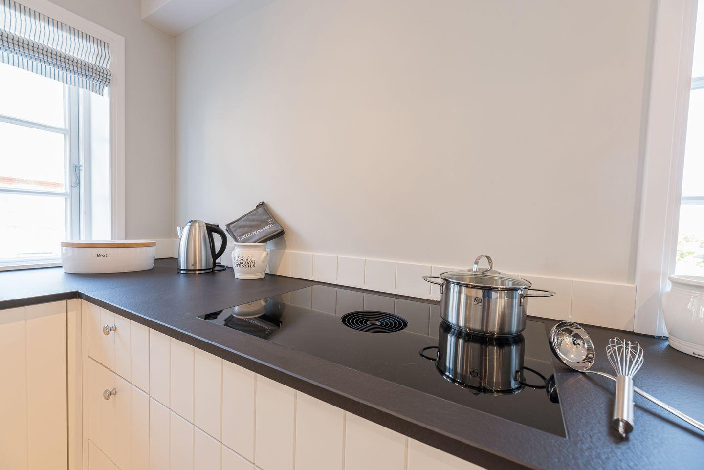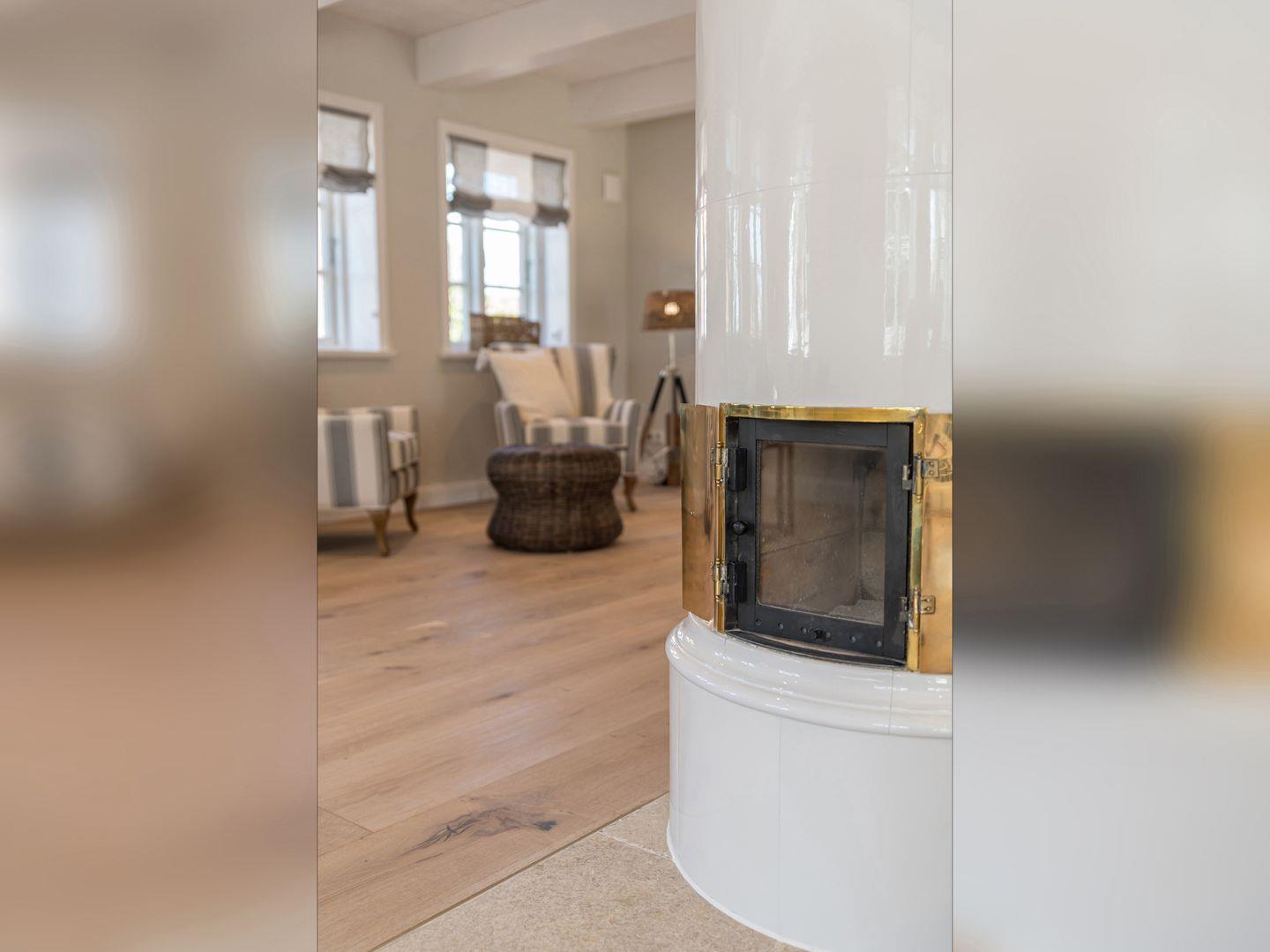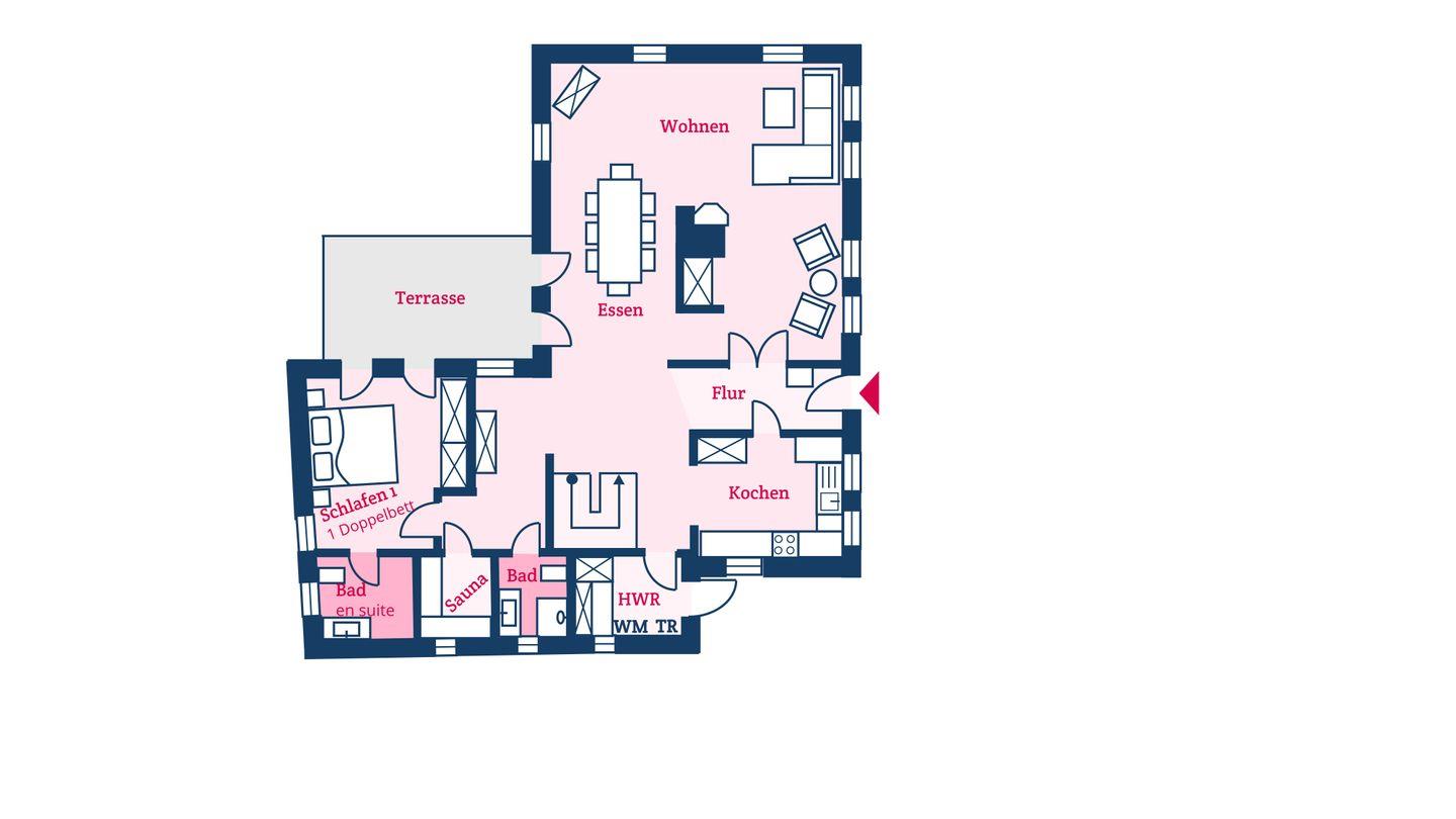 Im Erdgeschoss befinden sich der großzügige Wohn- und Essbereich mit offener Küche, ein Schlafzimmer mit Doppelbett und Smart-TV, die hauseigene Sauna, ein Duschbad und ein Gäste-WC, sowie ein Hauswirtschaftsraum mit Waschmaschine und Trockner. Sowohl über den Wohnbereich als auch das Schlafzimmer gelangen Sie direkt auf die Terrasse und in den eigenen Garten. Der Original Mylin-Kachelofen im Wohnbereich sorgt auch an kühleren Tagen für eine angenehme Atmosphäre.