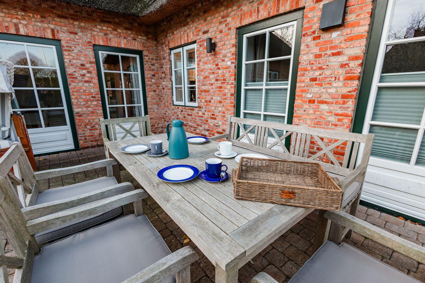 Im Außenbereich steht den Gästen des Ferienhauses Ferhaaling neben einem großzügigen PKW-Stellplatz auch ein Gartenhaus unter Reet zur Verfügung.