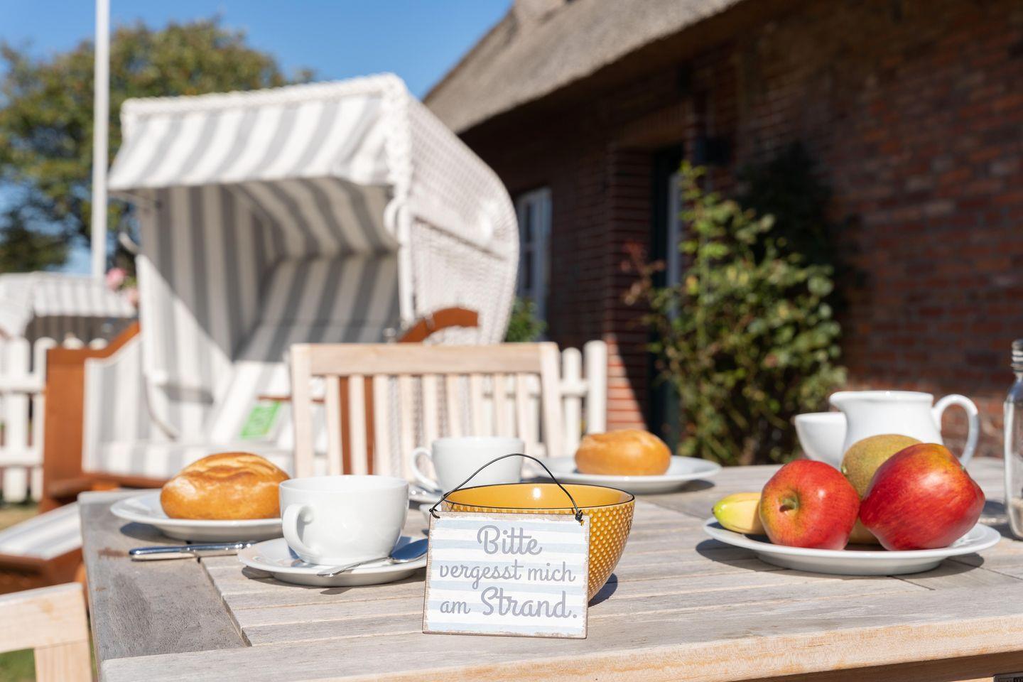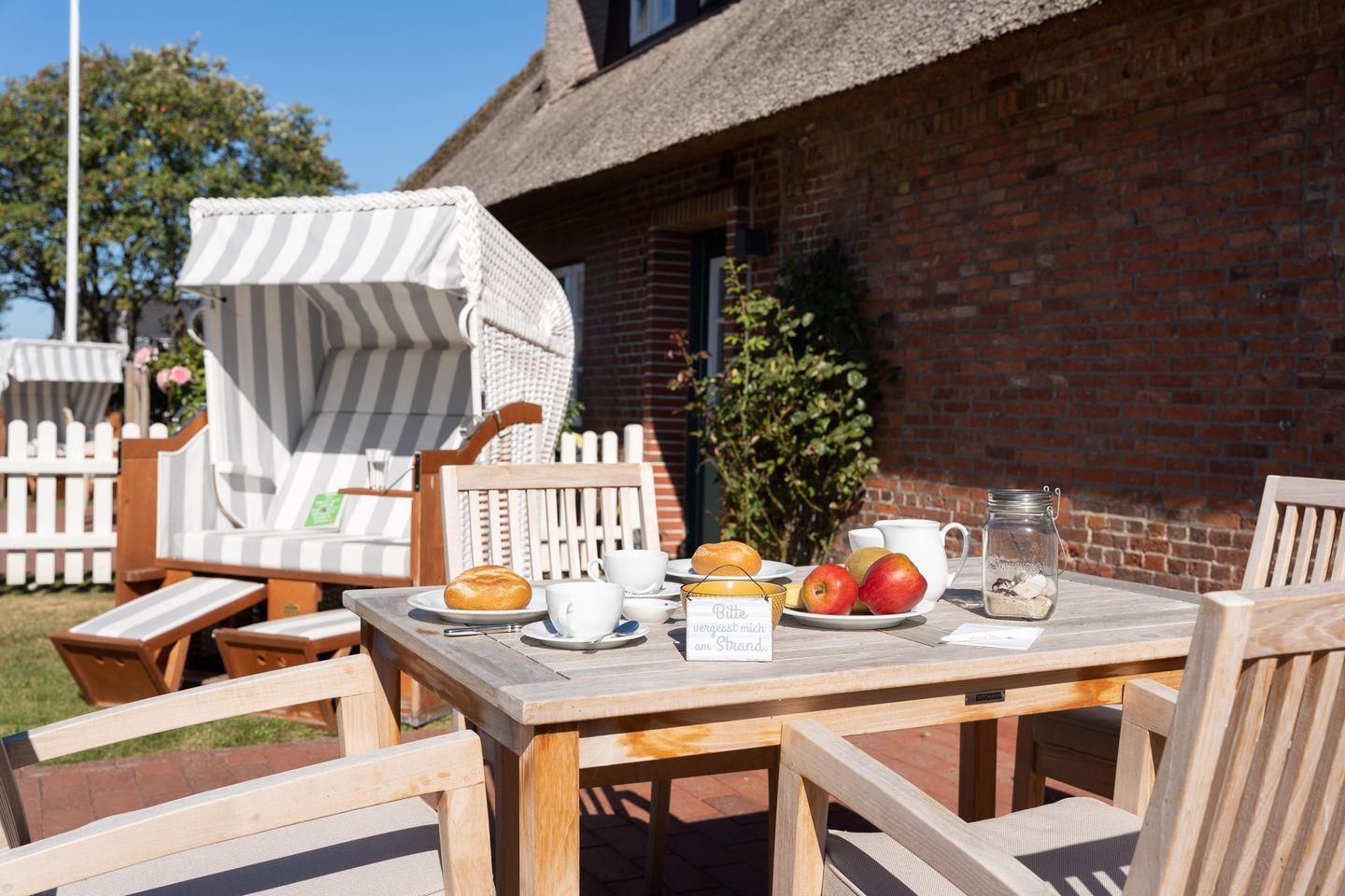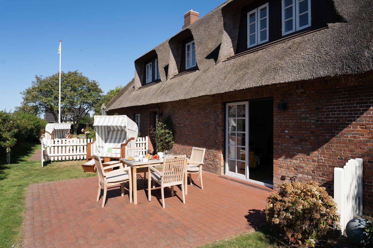 Unser Reethus verfügt über zwei Wohnungen mit separaten Eingängen. Jede Wohnung verfügt über einen Gartenanteil inklusive einer Terrasse und einem Strandkorb.