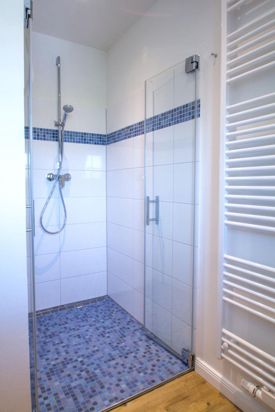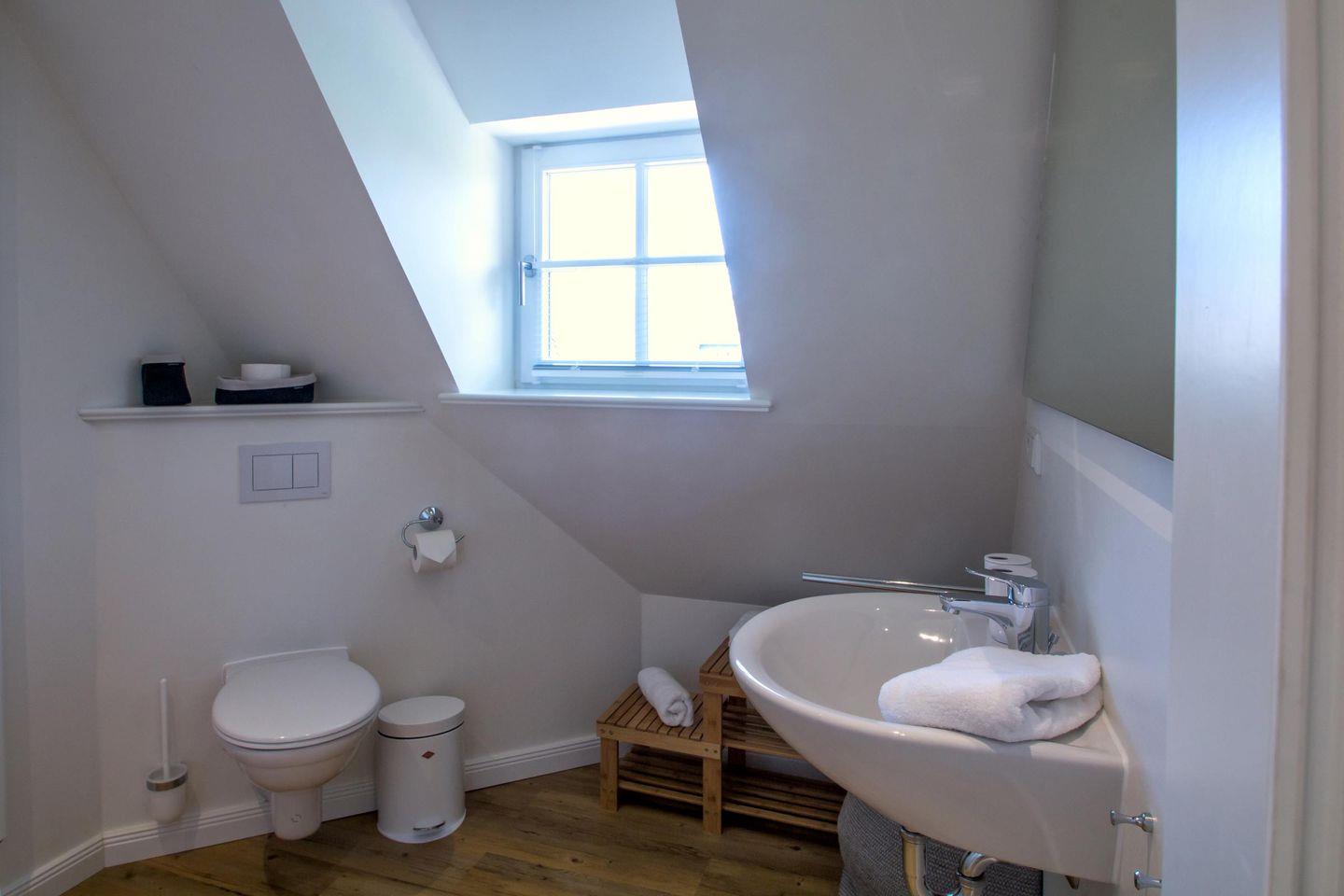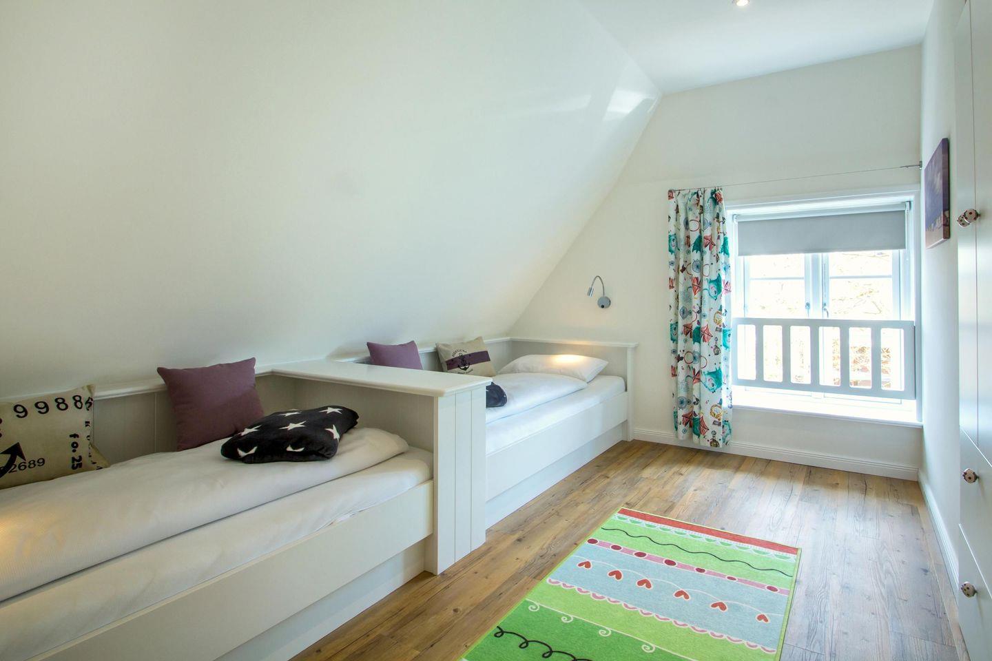 Im Obergeschoss befinden sich die beiden Schlafzimmer sowie ein Bad mit bodengleicher Dusche. Im großen Schlafzimmer befindet sich ein Doppelbett, im kleineren Schlafzimmer befinden sich zwei Einzelbetten. Achtung, die von hiesigen Tischlern gefertigten Einzelbetten weisen eine Länge von 1,90 m auf.