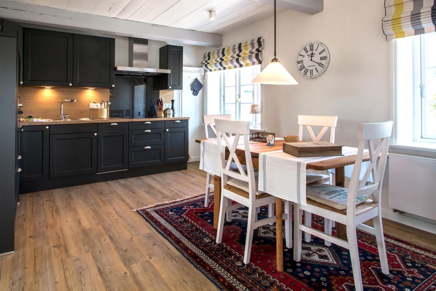 Im Erdgeschoss der Wohnung Uasterlun (zu deutsch Osterland) befindet sich ein großzügiger Wohn-/Essbereich mit Ofen und angrenzender Küche. Ein Gäste-WC finden Sie hier ebenfalls vor.