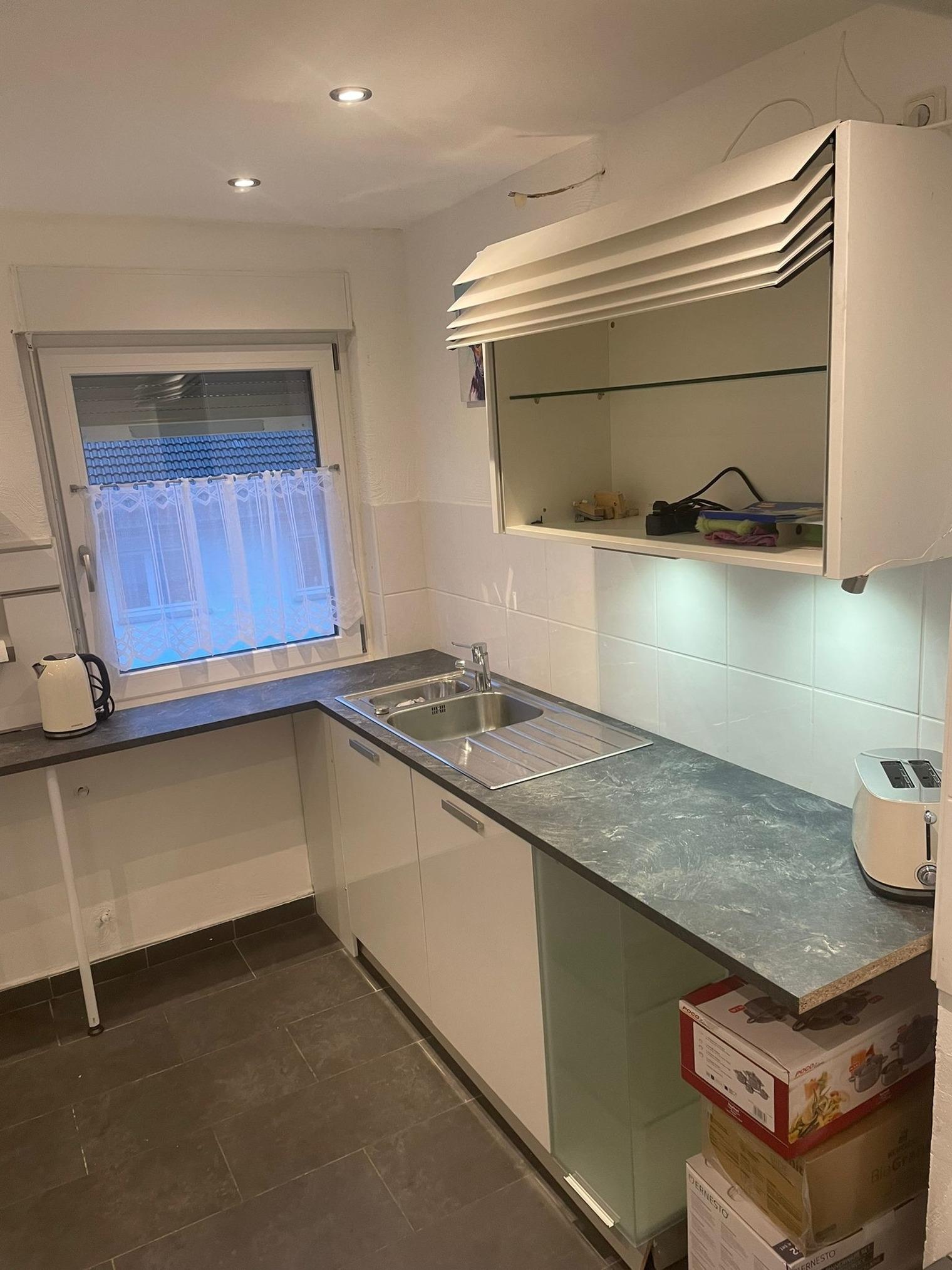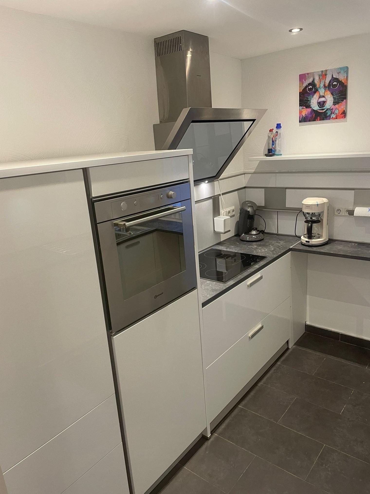 Küche mit Ceranfeld, Backofen, Mikrowelle, Kühlschrank mit Gefrierfach, Kaffeemaschine, Toaster sind vorhanden.