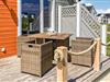 I kommer ind i feriehuset via den lille, overdækkede terrasse. Den store solterrasse ligger på den anden side af huset. Her kan I begynde dagene med morgenmad eller slappe af med et glas vin, mens solen går ned.