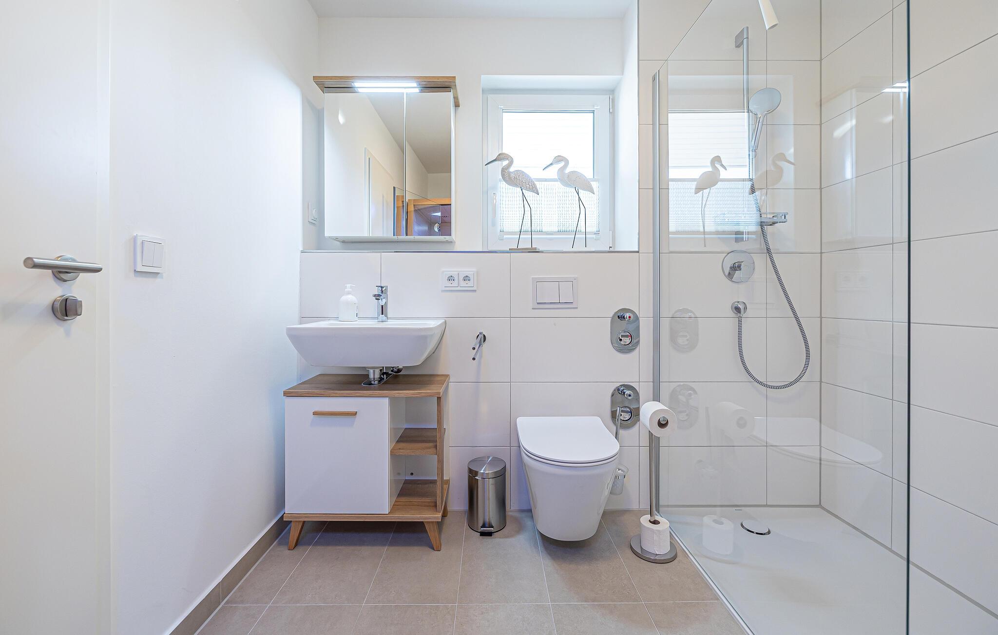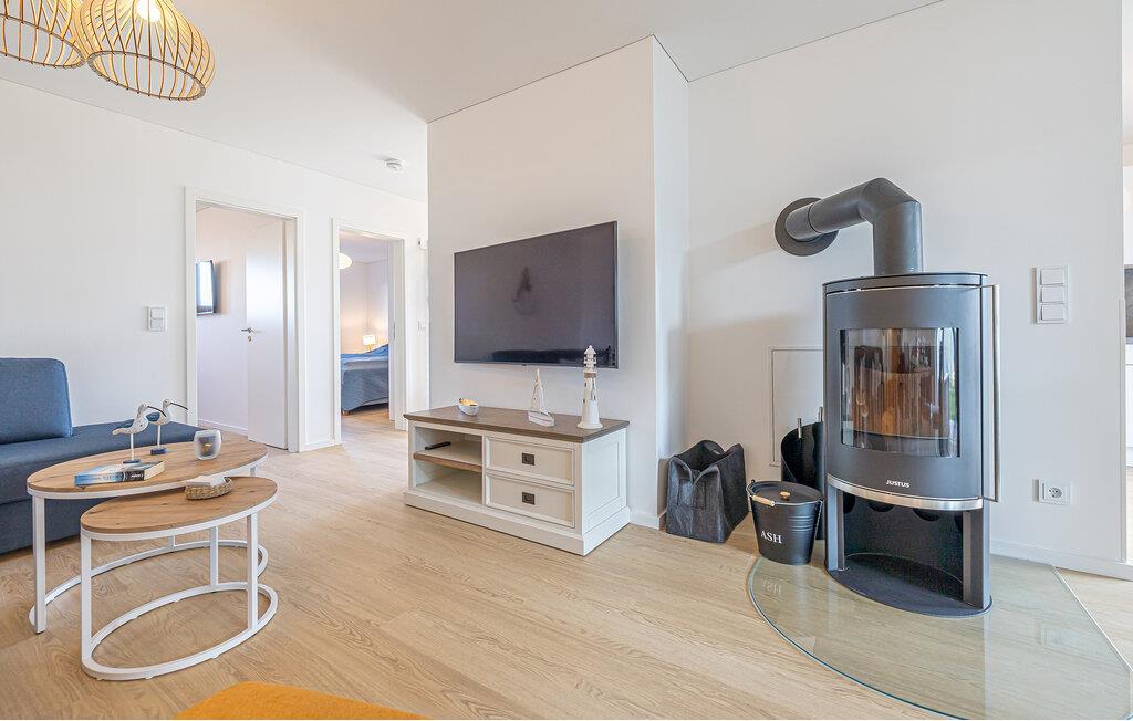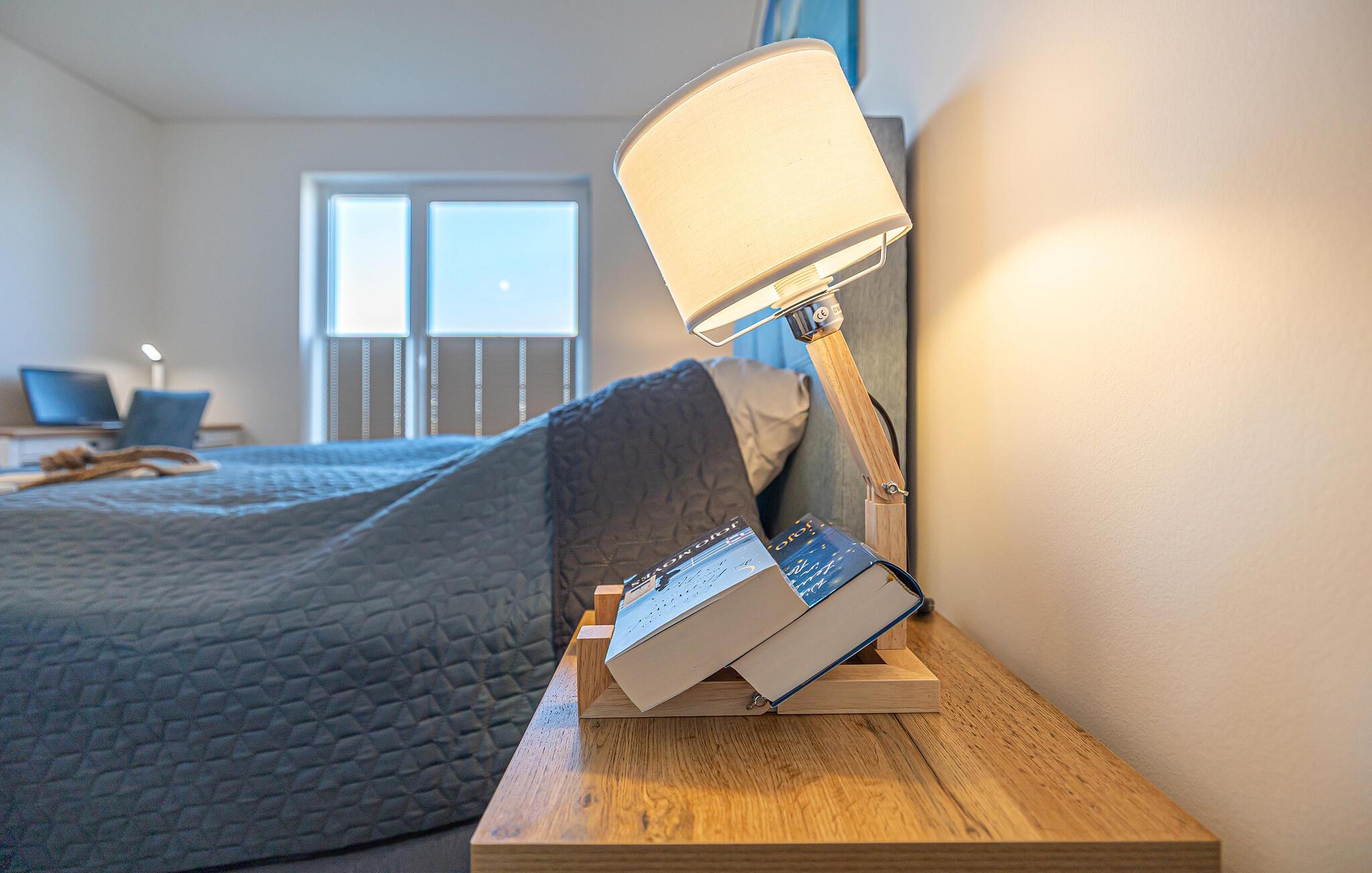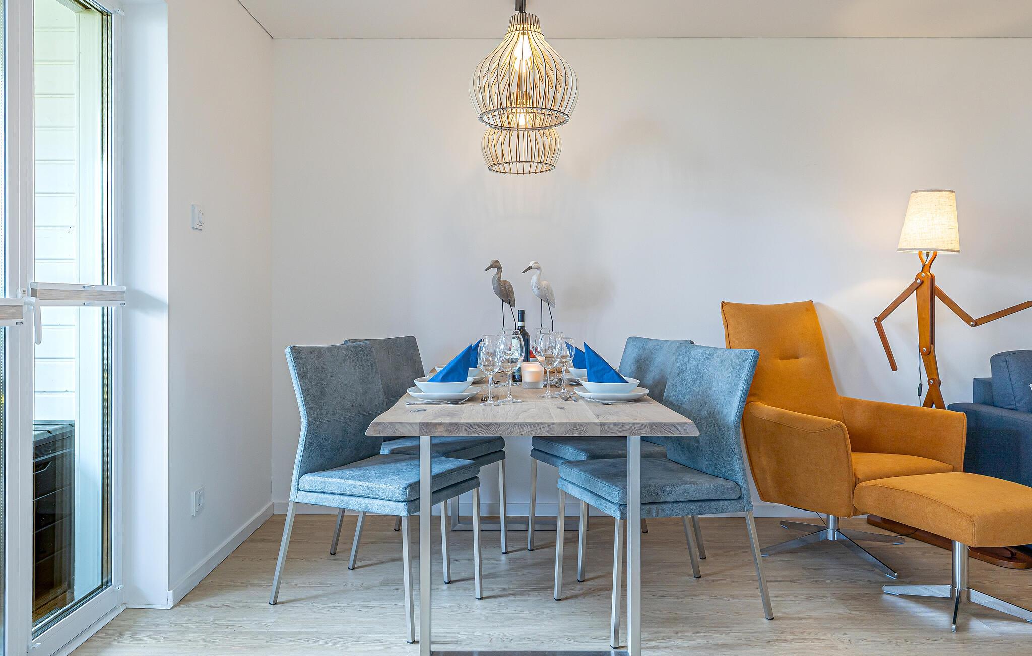 Glæd jer til jeres rummelige og generøse ferielejlighed i stueetagen. Indrettet i en venlig, maritim stil med mange kunstværker, føler man sig her velkommen fra første øjeblik. Med de høje vinduespartier, der går fra gulv til loft, og den tilstødende store terrasse er den åbne opholds- og spisestue boligens hjerte og imponerer med moderne indretning og hyggelig atmosfære. I de kolde årstider sørger brændeovnen og infrarødsaunaen for behagelig varme. Hyg jer sammen, og nyd jeres ferie i Schleiregionen. Der står også et skrivebord til rådighed for jer til hjemmearbejdsdage. Hvis I får lyst til kreativ madlavning i ferien, er det moderne køkken det helt rigtige sted. Det er ideelt udstyret og begejstrer familiens hobbykokke.