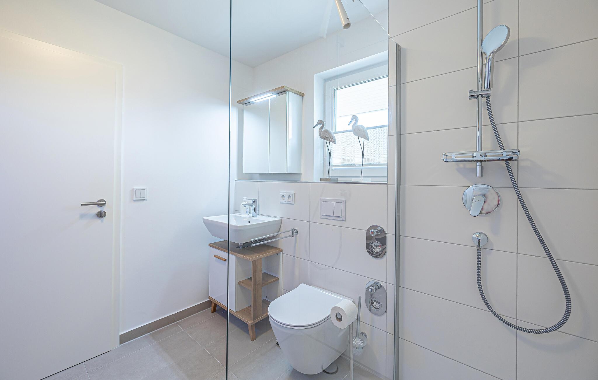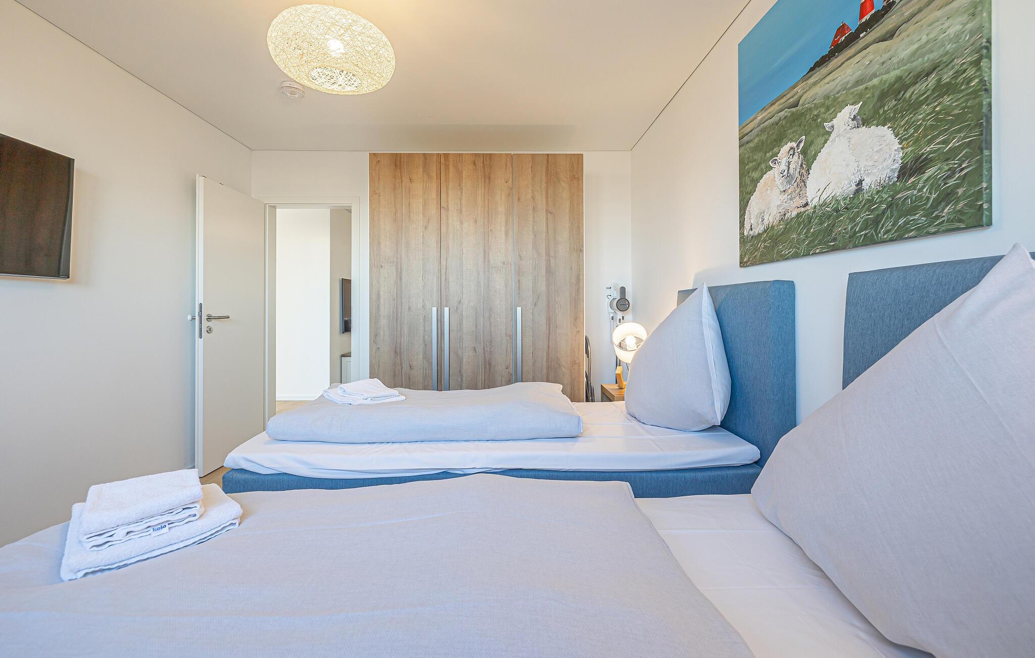 Den fine sandstrand Weidefeld med kiosk, restaurant og strandkurve ligger i gåafstand og er året rundt et attraktivt udflugtsmål. Den spændende minigolfbane (Adventure Golf) ligger også i nærheden, til glæde for både unge og ældre. Også den livlige havnepromenade med indkøbsmuligheder og lystbådehavnen kan nås på få minutter.