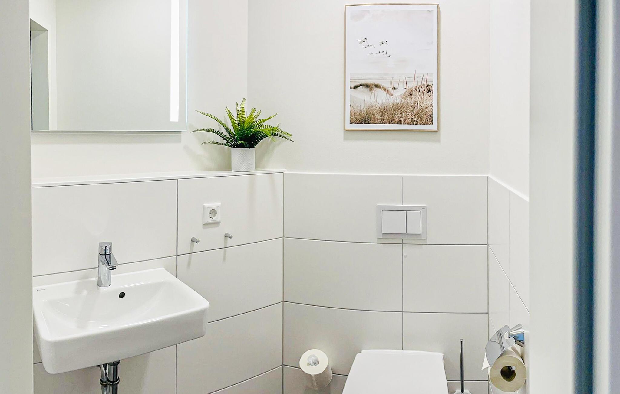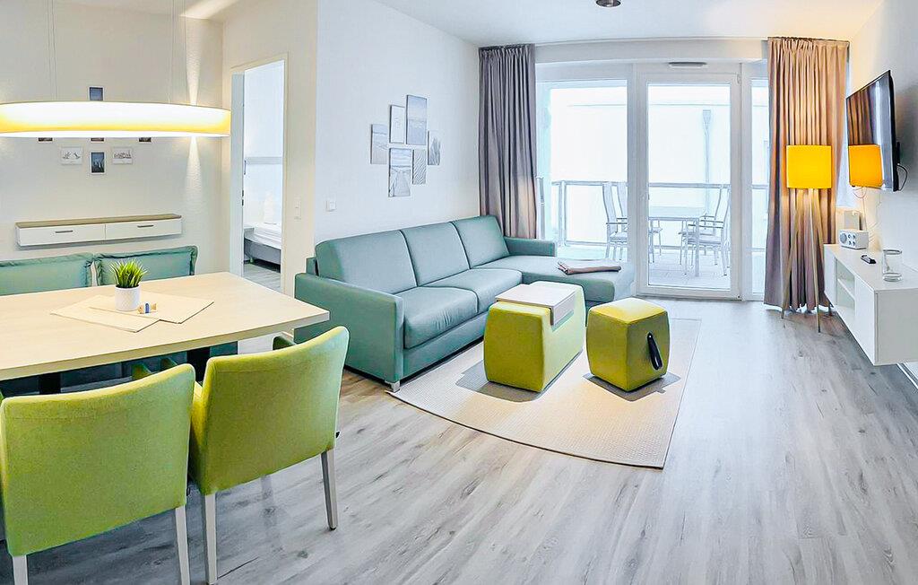 Tilbring en foryngende ferie i denne moderne lejlighed på OstseeResort Olpenitz og læg hverdagen bag jer. Træd ind i den lyse opholdsstue, der er noget særligt med sine rene linjer og indbydende farver. Gør det behageligt i sofaen og nyd det store fladskærms-tv til afslappende aftener. slå jer ned ved spisebordet med den polstrede bænk og nyd måltider sammen i stilfulde omgivelser. Fra opholdsstuen har I direkte adgang til balkonen, som er møbleret med udendørs siddepladser.