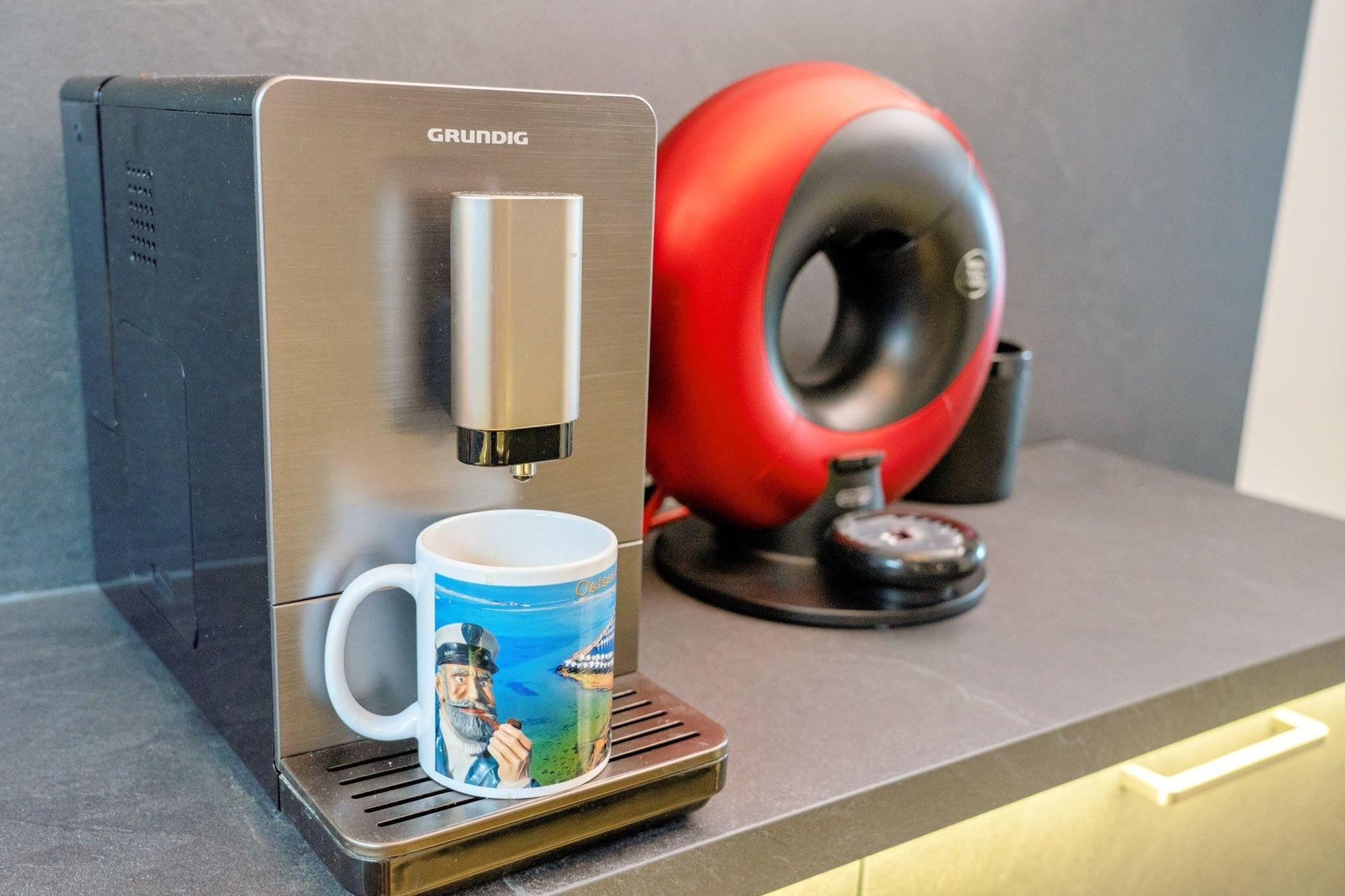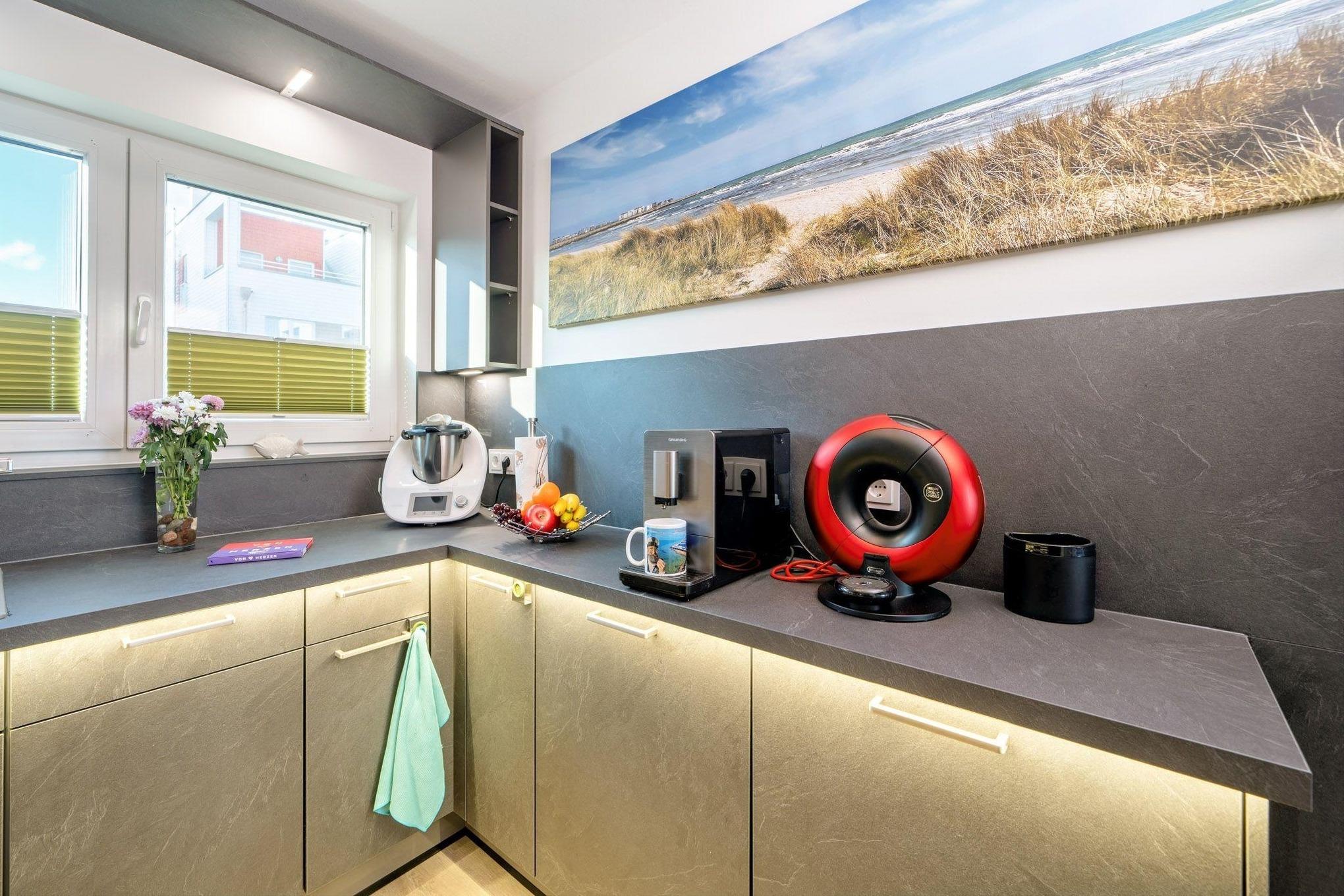 Die komplett ausgestattete Design-Küche begeistert Hobbyköche mit einer Vielzahl von Annehmlichkeiten. Ein Geschirrspüler, Induktionskochfeld, Backofen, Mikrowelle, Kühlschrank mit Gefrierfach und ein Thermomix komplettiert das Ensemble und lässt die Herzen von Kochenthusiasten höher schlagen. Als besonderes Highlight steht ein Kaffeevollautomat ohne Milchsystem bereit – ideal für Kaffeeliebhaber, die den reinen Geschmack schätzen. Erleben Sie pure Entspannung in Ihrem Urlaubsdomizil.