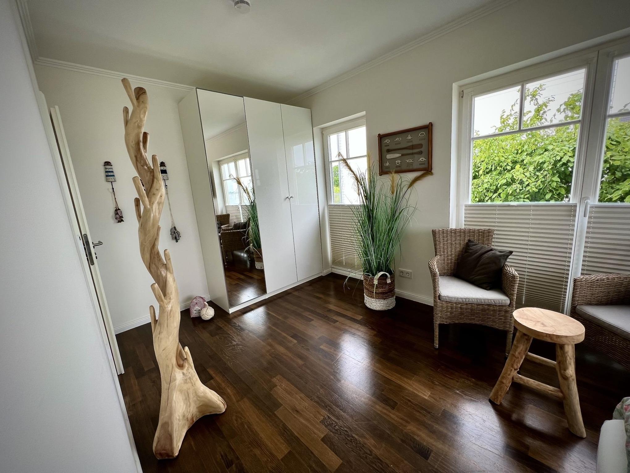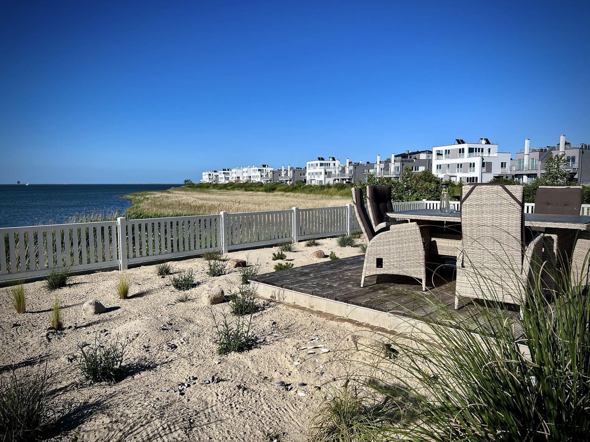 Die um das ganze Haus verlaufene Veranda bietet die Möglichkeit immer ein windgeschütztes Plätzchen zu finden und die Zeit am Meer zu genießen. Der im Anschluss an die Terrasse in Richtung Wasser umzäunte Garten mit kleinem Strandabschnitt ist das Highlight und definitiv einzigartig. Ein Strandkorb, Gartenmöbel und zwei Adirondack-Stühle mit Tisch und Fußteil stehen zur Verfügung. Der Blick fällt hier auf die atemberaubende Wasserkulisse der Schlei. Unvergessliche Sonnenuntergänge mit vorbeifahrenden Segelschiffen, Möwen in der Luft und die umgebende Ostseebrise ist ein Naturschauspiel, von dem man nicht müde wird, zuzuschauen.