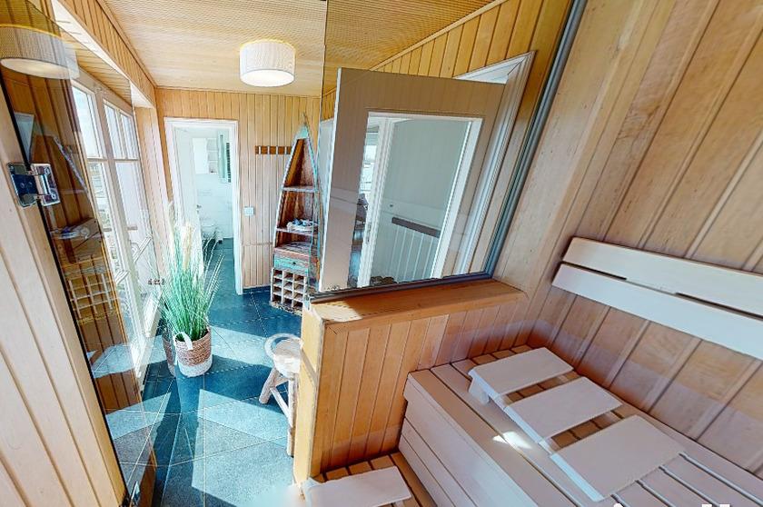 Das voll ausgestattete Badezimmer im Obergeschoss, mit bodengleicher Dusche, bietet maritime Wellness-Momente. In der separaten finnischen Sauna lässt es sich zu jeder Jahreszeit tiefenentspannen.